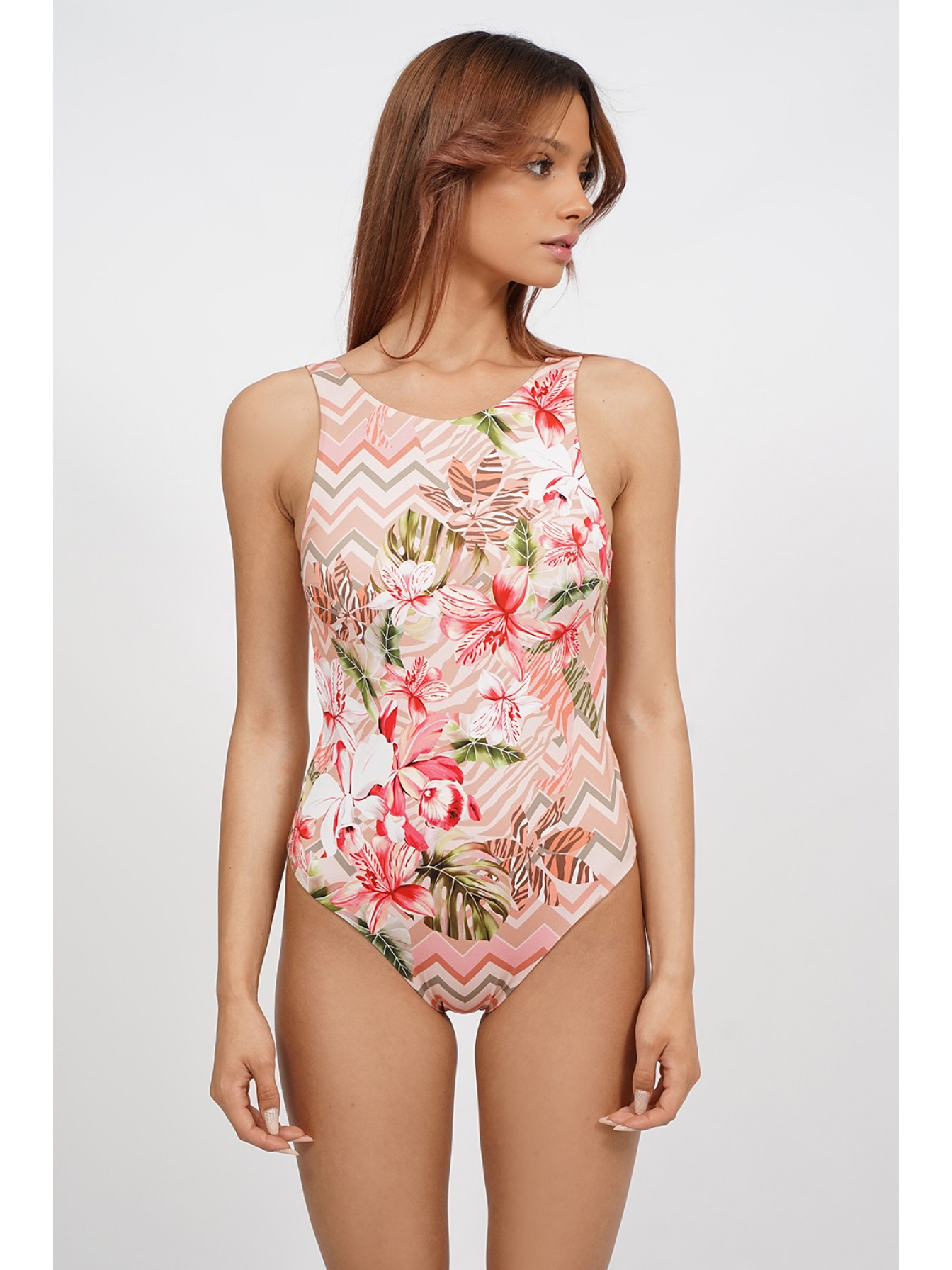 Слитный купальник-трикини из коллекции Tropical Fever c ярким принтом. Лиф мягкий со съемными вкладышами. Низ – высокие плавки-слипы.