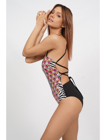 Слитный купальник из коллекции Escape into The Jungle с мягкой чашкой со съемным вкладышем, оформлен ярким принтом. Спинка открытая.