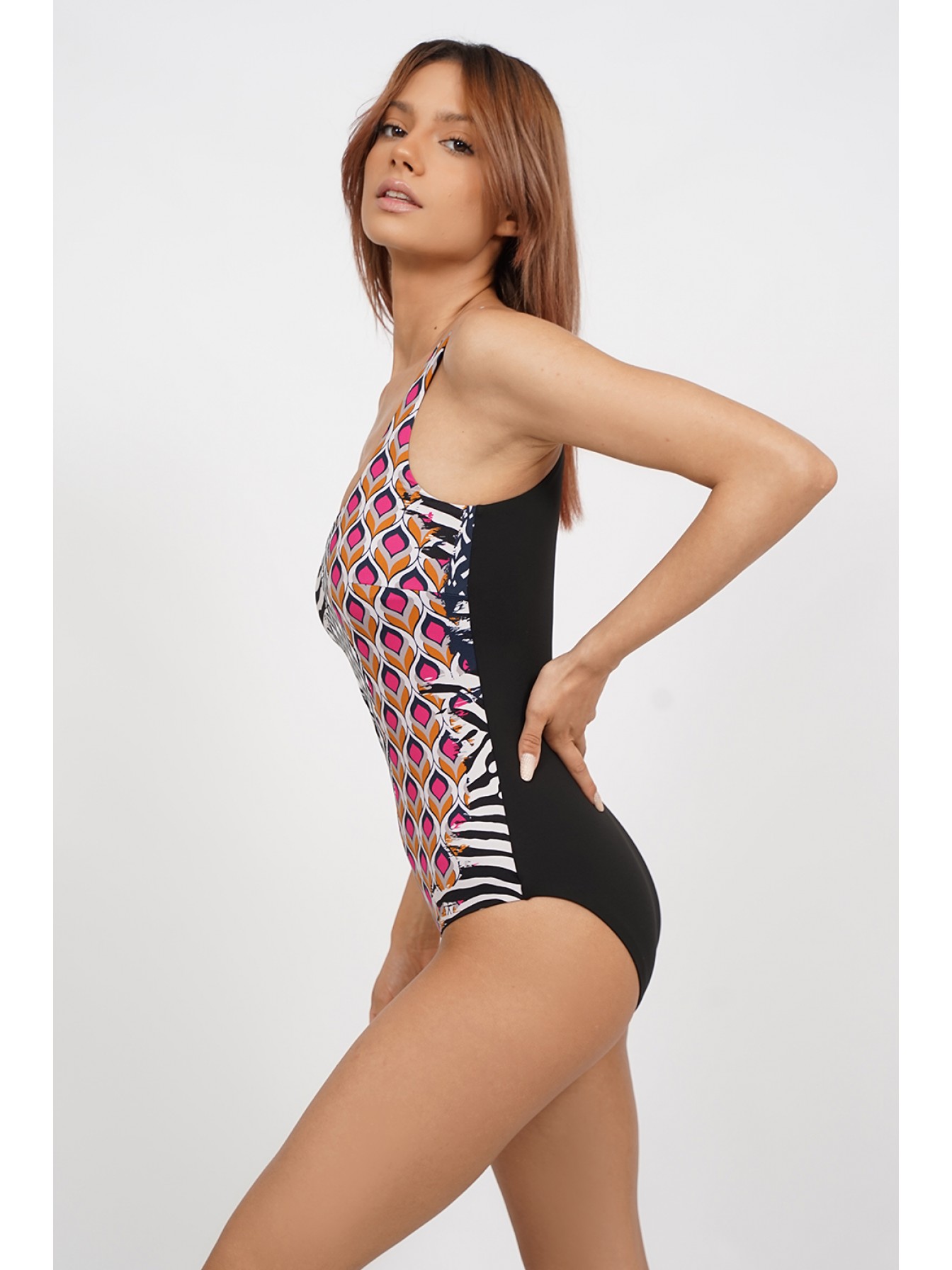 Слитный купальник из коллекции Escape into The Jungle с ассиметричной бретелью. Чашка мягкая со съемным вкладышем, оформлен ярким принтом. Спинка открытая.