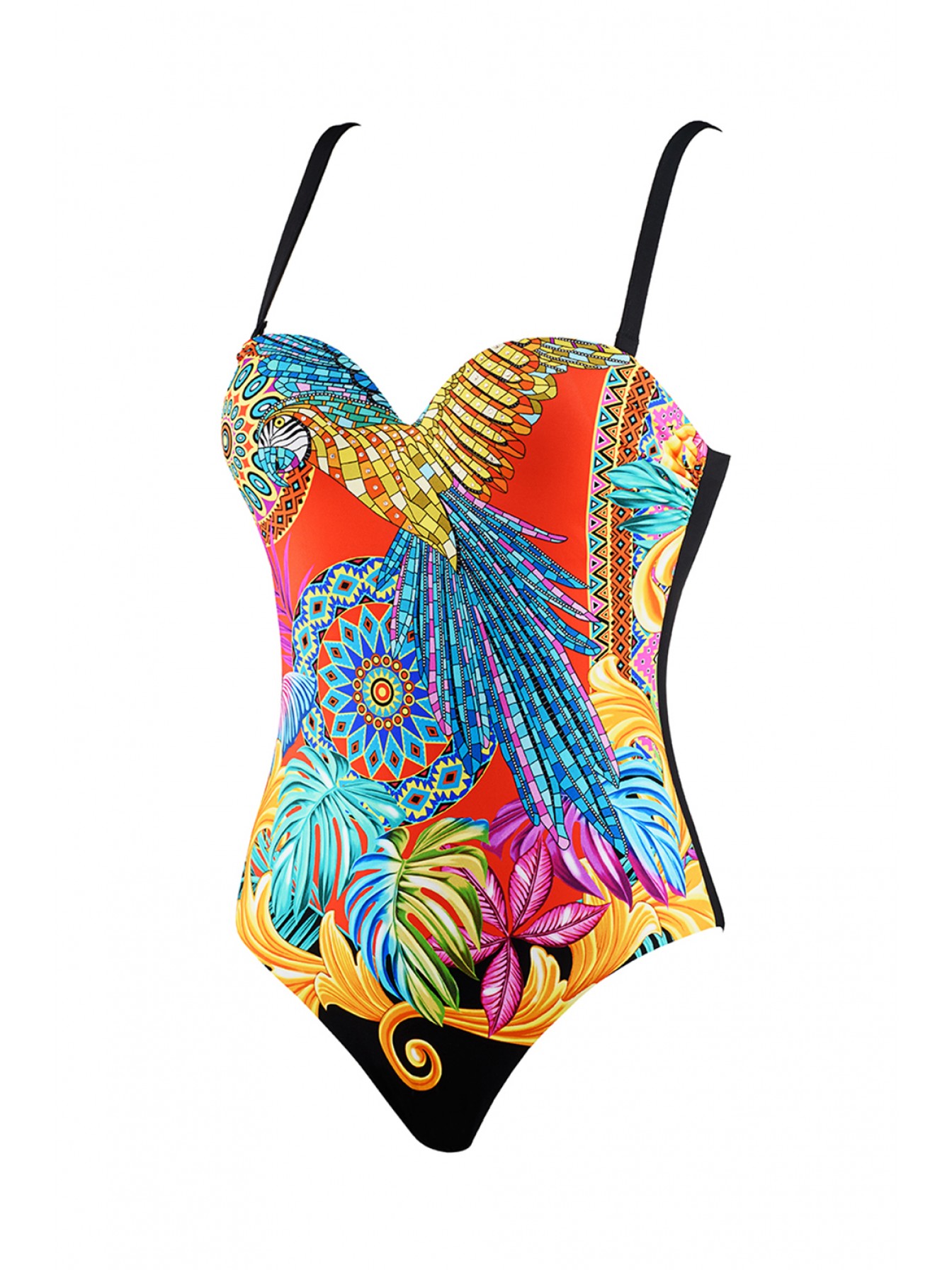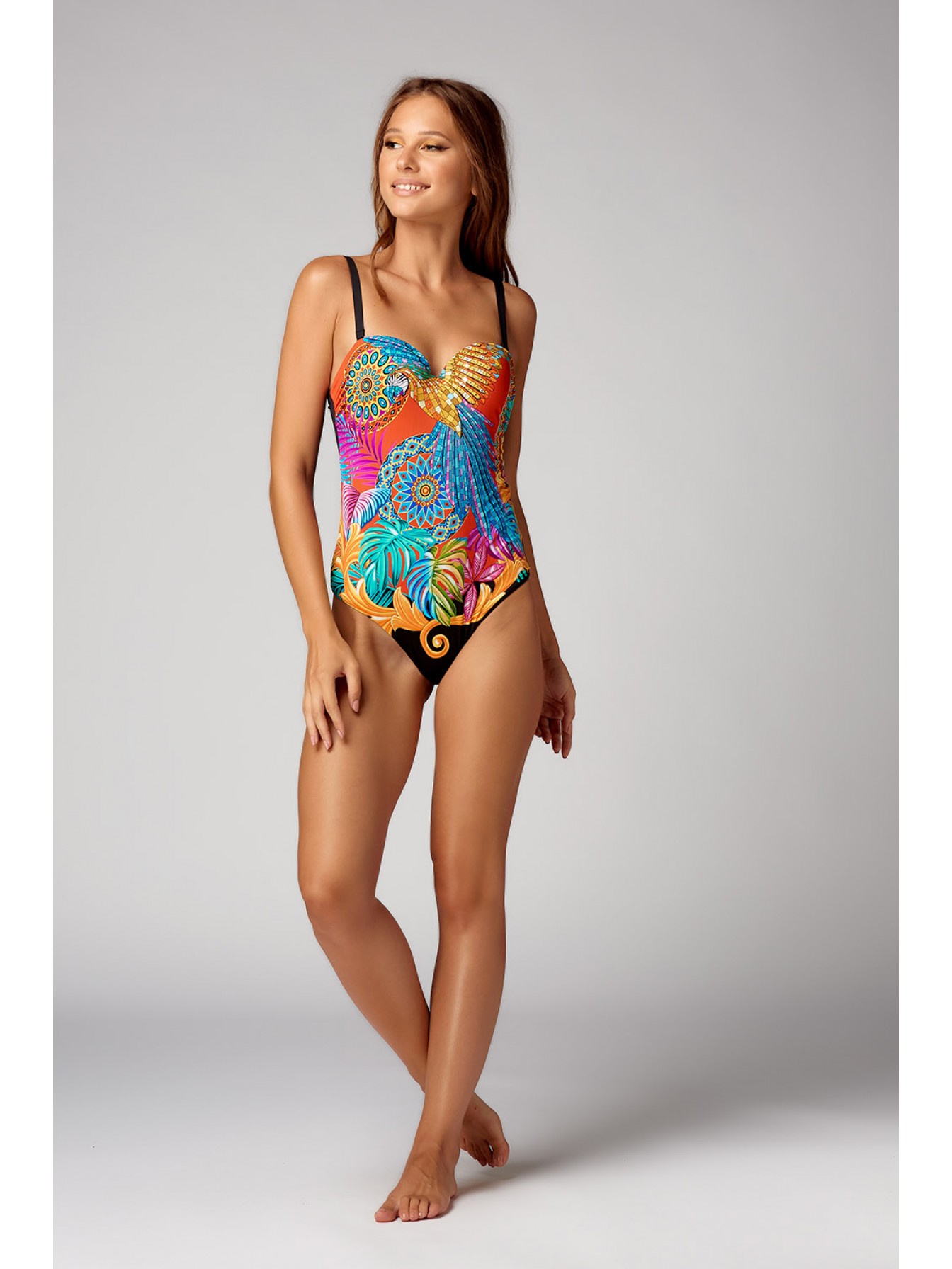 Яркий слитный купальник-балконет из коллекции Pure Happiness с формованными чашками пуш-ап на косточках. Бретели регулируются по длине и отстегиваются, на спинке застежка.