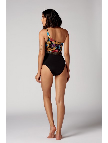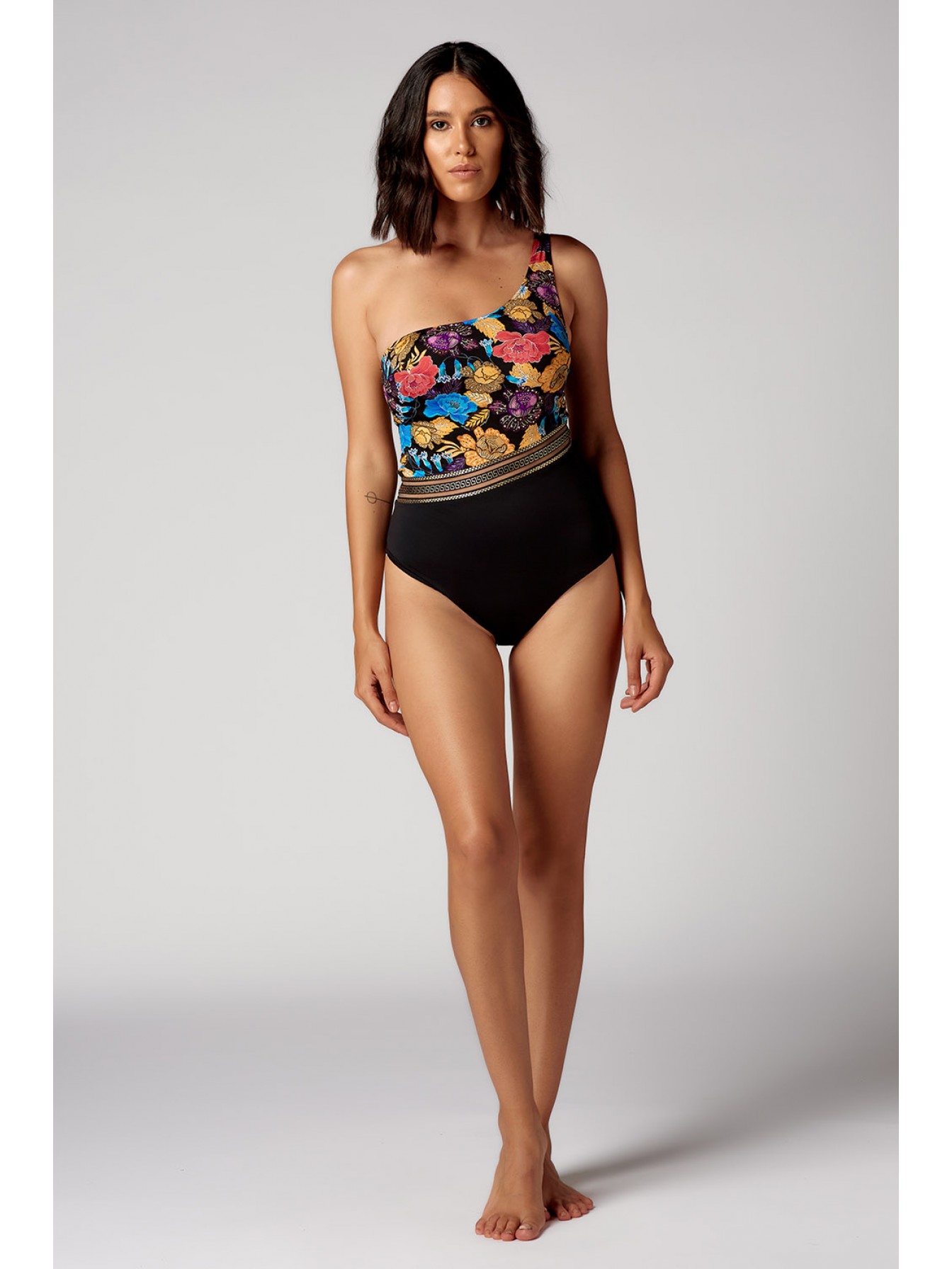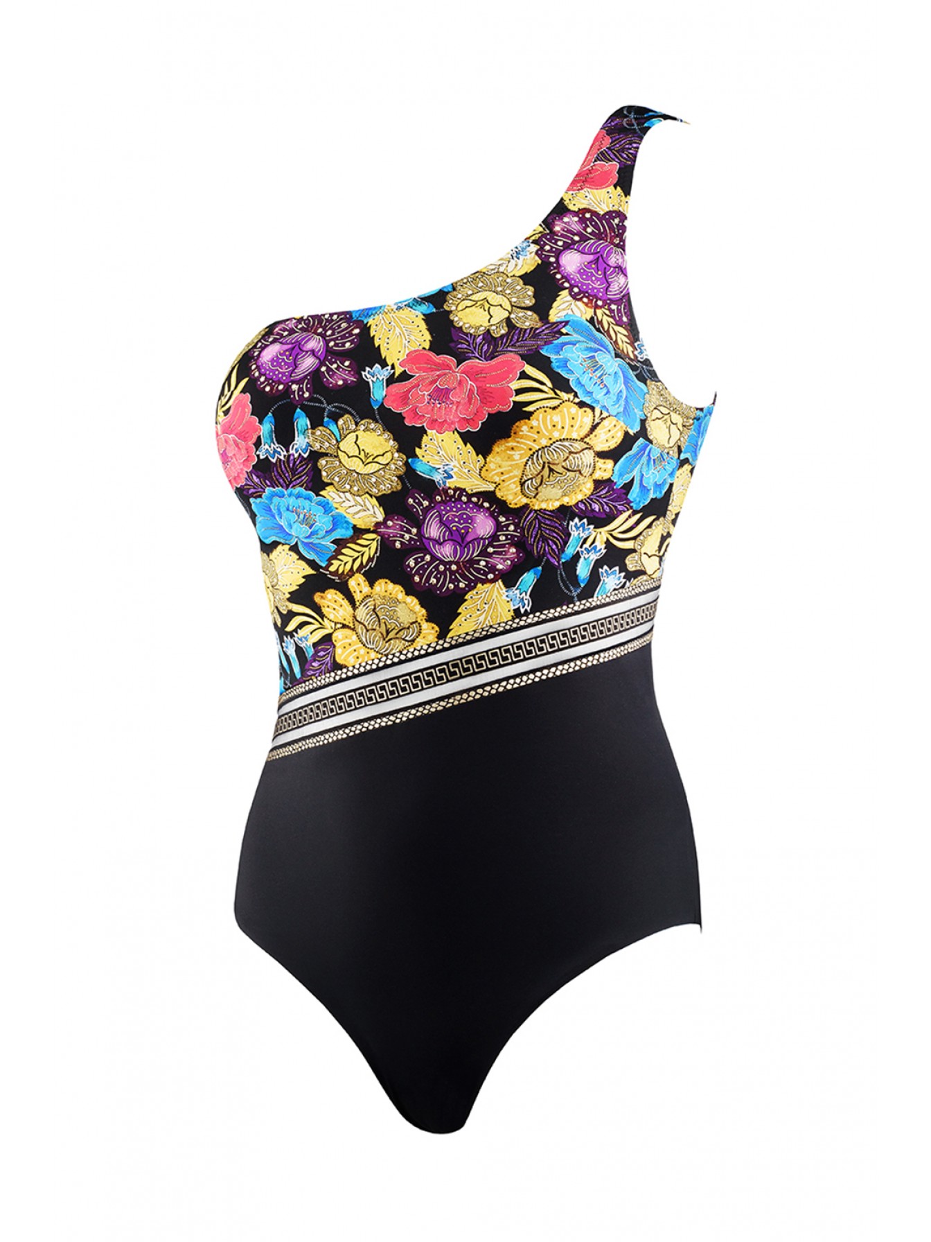 Слитный купальник из коллекции Treasures of Africa с формованными чашками и ассиметричной бретелью. Модель выполнена в сочетании цветочного принта и черного однотона.