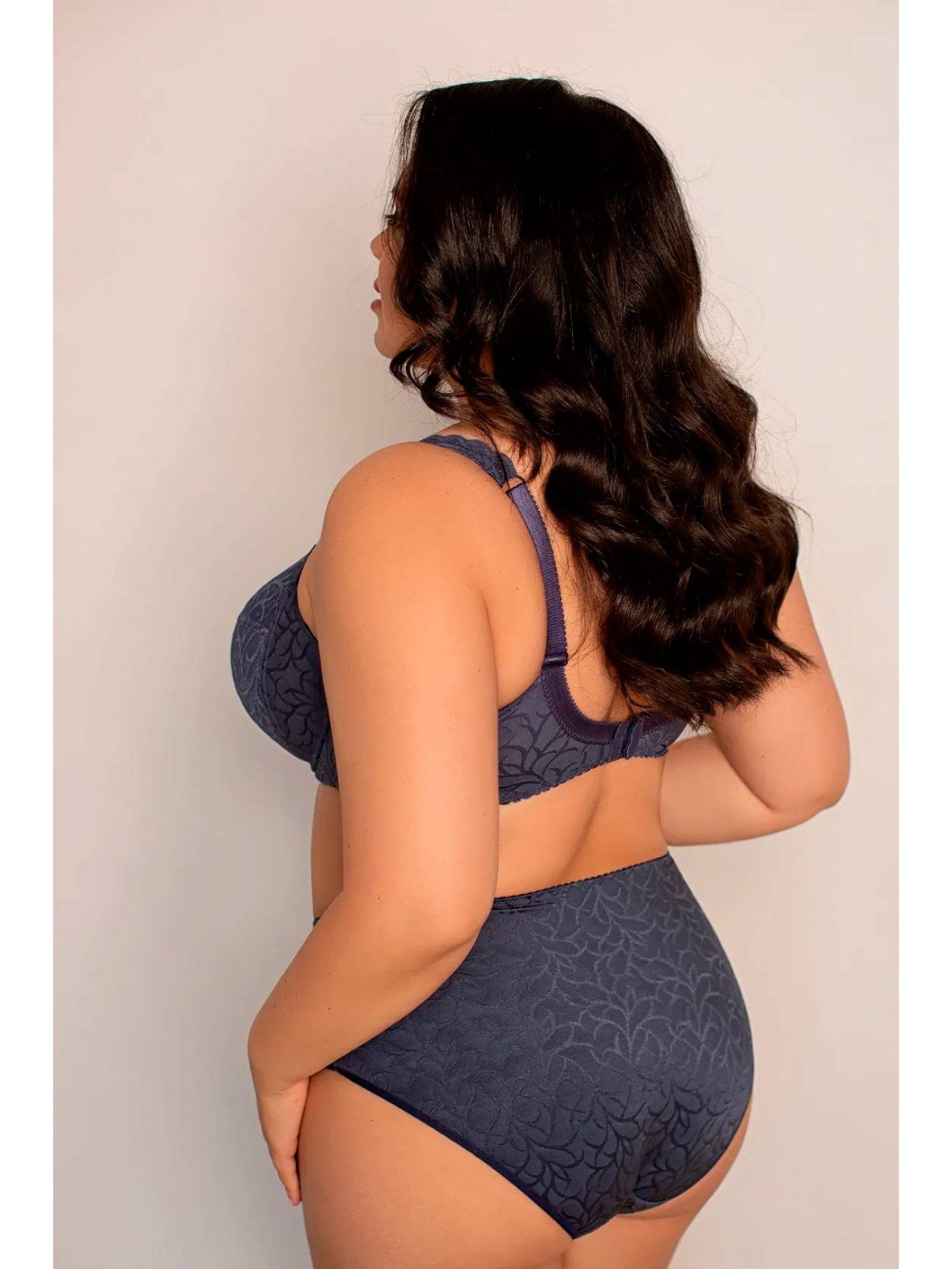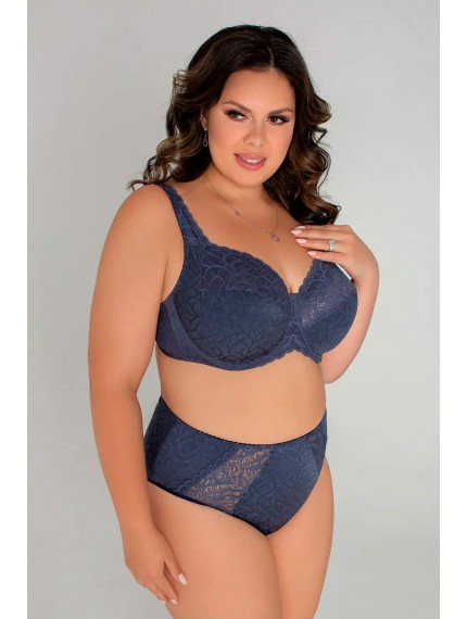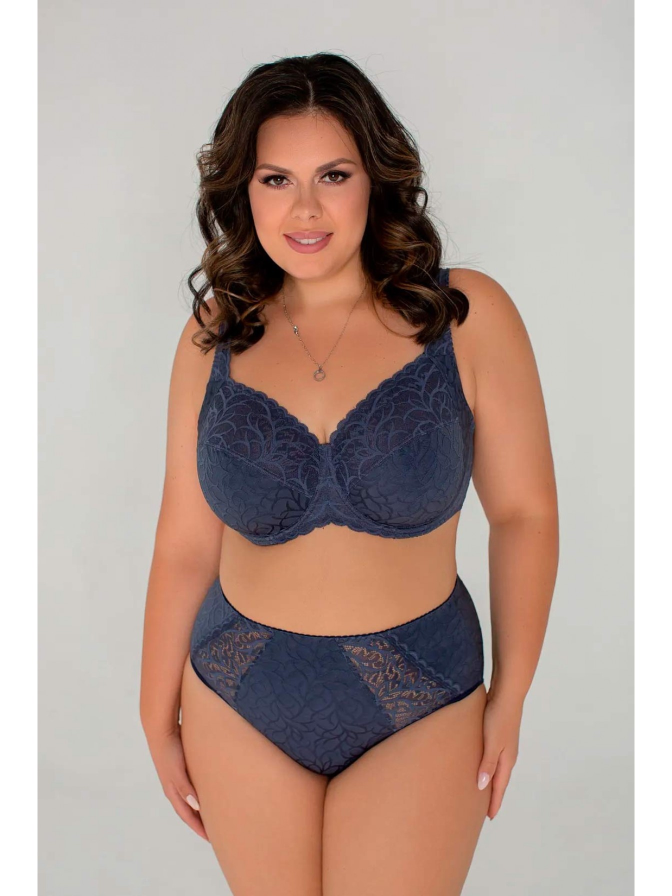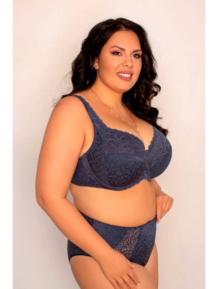Красивый бюстгальтер тёмно-синего цвета, на большую грудь с боковой поддержкой. Мягкая чашка из эластичного кружева и эластичной микрофибры. Чашка внутри дублирована хлопком. В модели предусмотрены подгрудные косточки. Очень удобная модель для ежедневного использования. В больших размерах (от 95E) верх чашки выполнен с дополнительным нижним слоем из эластичной сетки с целью улучшения формоустойчивости.