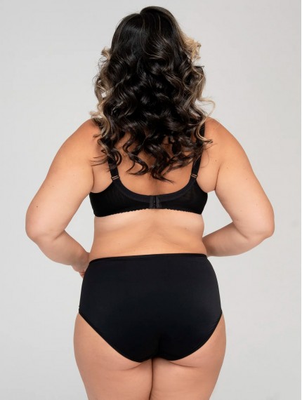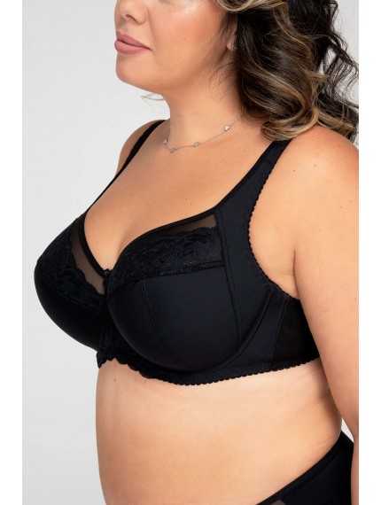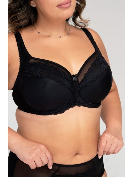 Красивый бюстгальтер черного цвета, на большую грудь с боковой поддержкой. Мягкая чашка из неэластичного функционального полотна. Подкладка чашек выполнена из хлопкового полотна. Бочок пояса - два слоя эластичной сетки. Удобная и современная модель.