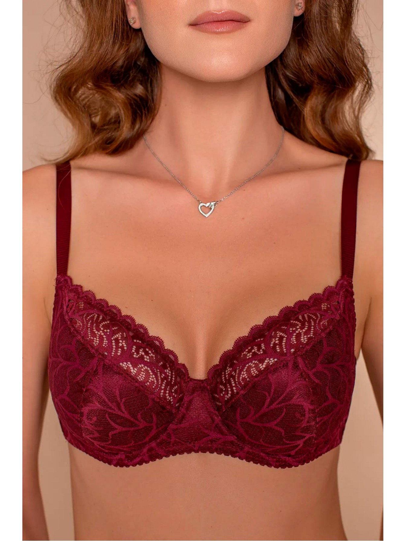 Бюстгальтер насыщенного бордового цвета, с комбинированной чашкой (полупоролон). Верх чашки выполнен из эластичного кружева с дополнительным нижним слоем из эластичной сетки, низ чашки продублирован поролоном. Материал сочетается с благородным кружевом. В модели предусмотрены подгрудные, а также боковые косточки. Модель Б 436 имеет улучшенную конструкцию, которая обеспечивает отличную посадку на фигуре и придает красивую форму груди. Застежка во всех размерах на широкие (57мм) крючки-петли.
