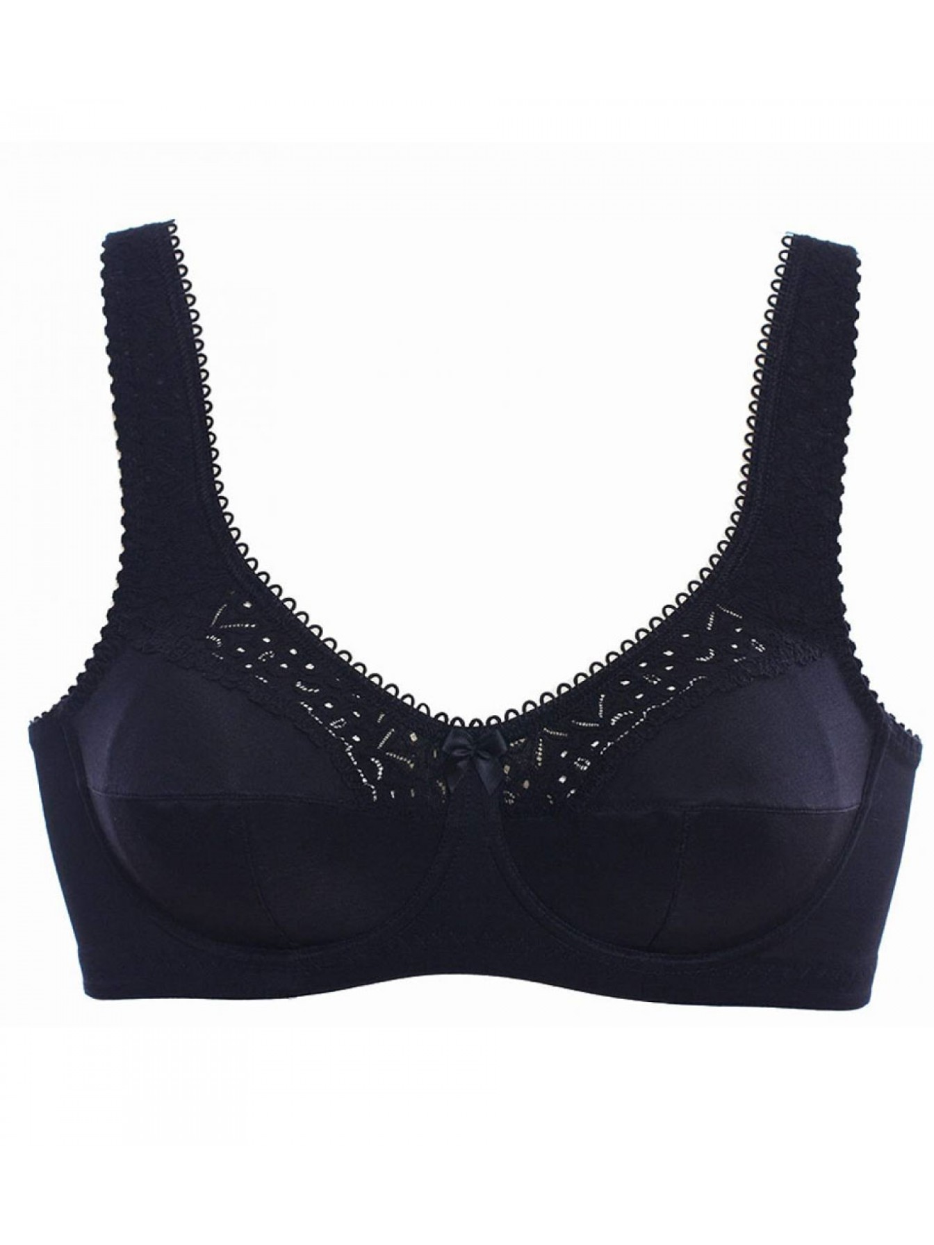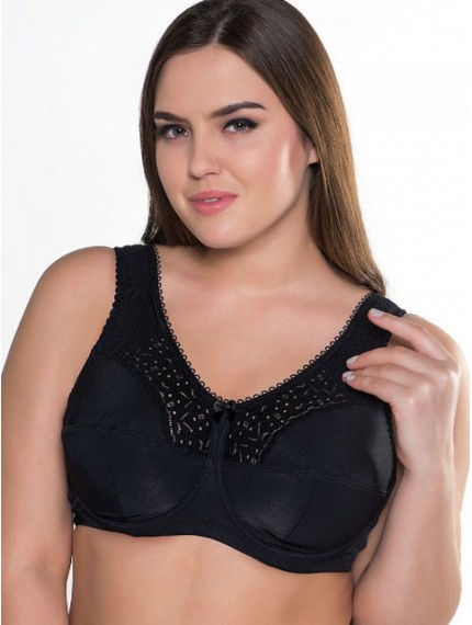 Очень комфортный бюстгальтер черного цвета, с широкой укрепленной бретелью. Выполнена из хлопкосодержащего эластичного полотна и мягкого эластичного кружева. Мягкие чашки с горизонтальным кроем, с внутренней боковой деталью. Передняя часть бретелей декорирована кружевом, продублирована хлопковым трикотажем и тонким слоем поролона, задняя часть из эластичной тесьмы. По нижнему краю бюстгальтера пришита мягкая широкая резинка. Для чашек B,C,D,E приобретайте модель 02131.