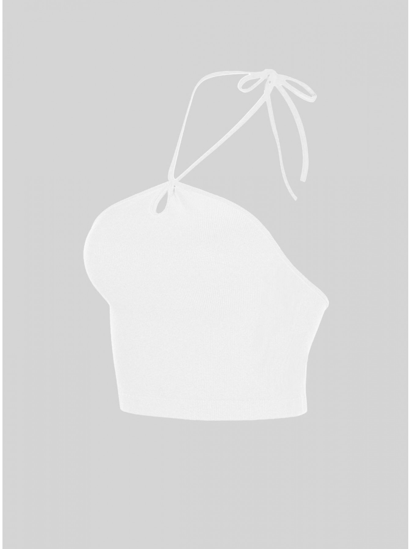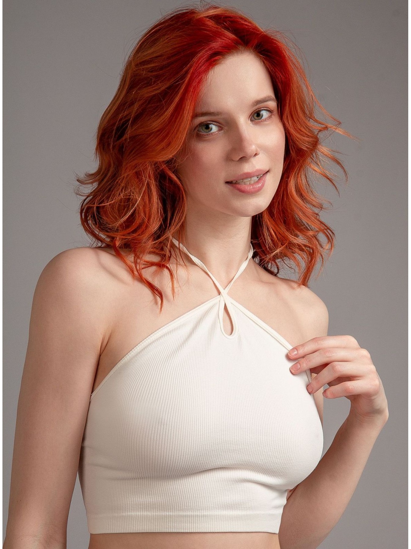 Топ из полиамида, белого цвета, в рубчик, на завязках, без рукавов, укороченная.