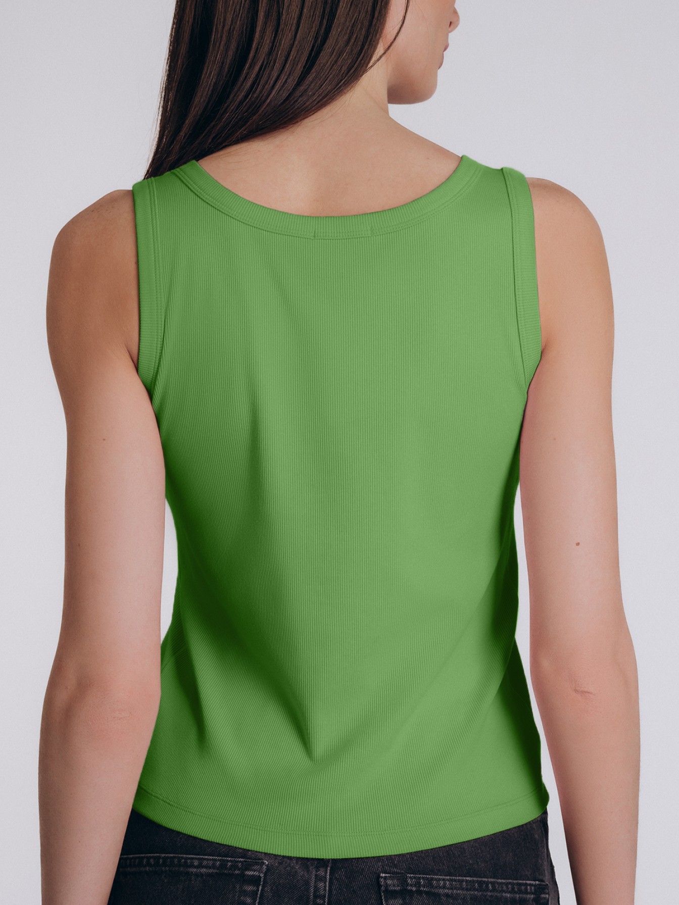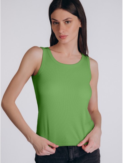 Практичная майка прямого кроя из хлопково-вискозной ткани с характерной рубчатой фактурой, насыщенного зеленого цвета.