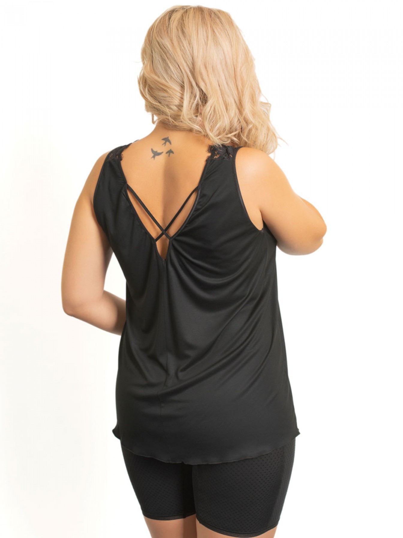 Чёрная майка-топ из мягкого, тонкого итальянского хлопка к низу крой-трапеция. С небольшим красивым верезом на спине и лямками крест на крест.