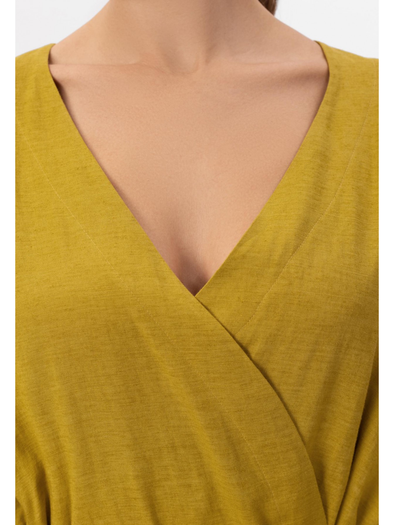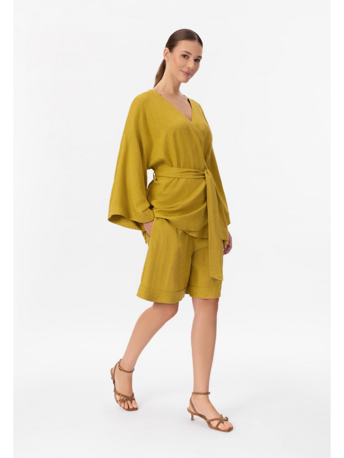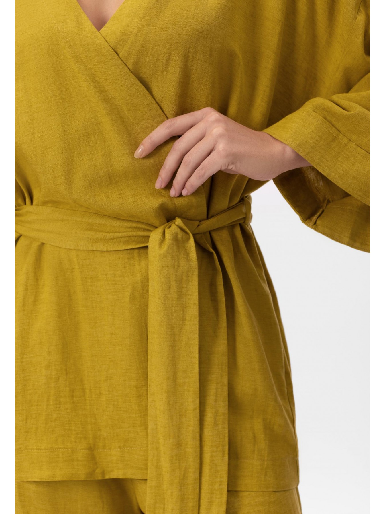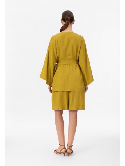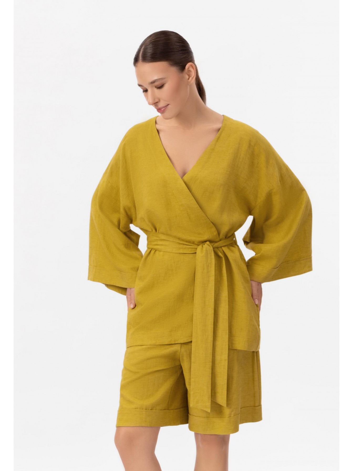 Укороченное кимоно свободного кроя изо льна и вискозы на запах. Боковые карманы. Спущенное плечо, заниженная пройма. Втачной рукав 3/4. Длина до середины бедра.