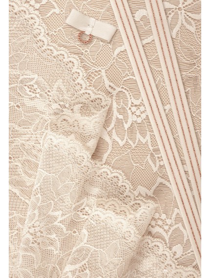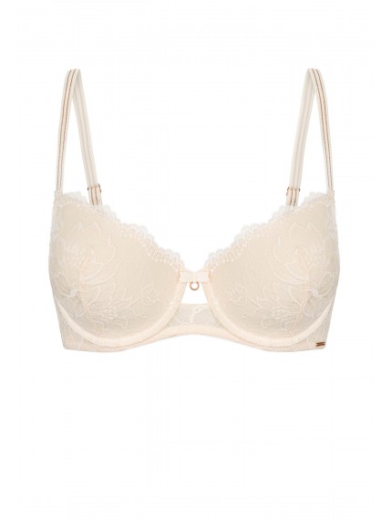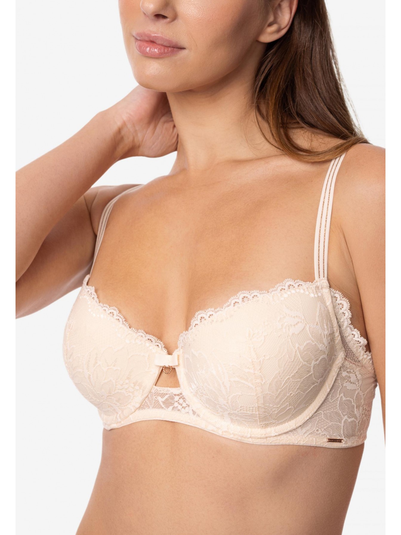 Бюстгальтер с формованной чашкой и съёмными корректорами «пуш-ап» на каркасной поддержке. Внутренняя часть чашки дублирована хлопком. Перекрест деталей из микрофибры и кружева на боковой панели. Круглая спинка.