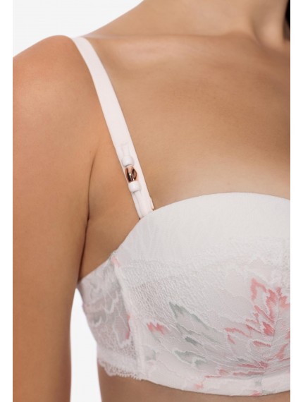 Бескаркасный бюстгальтер-балконет со встроенным Super «пуш-ап». Эффект «скрытого каркаса». Уплотненный стан для комфортной поддержки. По верхнему и нижнему краю боковых деталей силиконовая лента. Чашка декорирована двумя видами кружева. Стан выполнен из кружева. Дополнительные силиконовые бретели в комплекте.