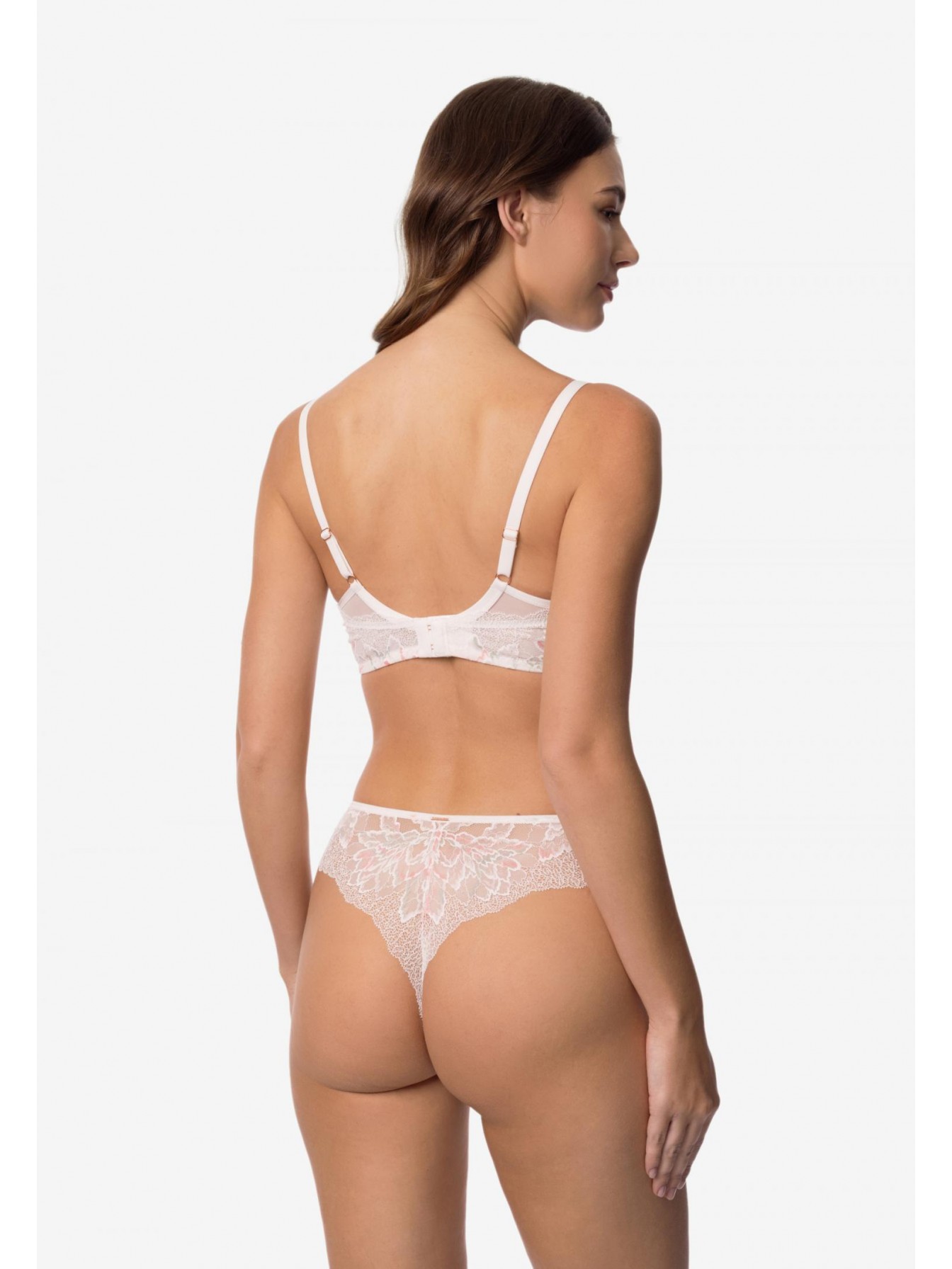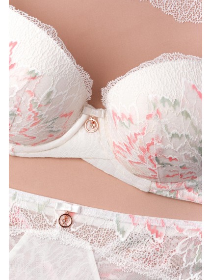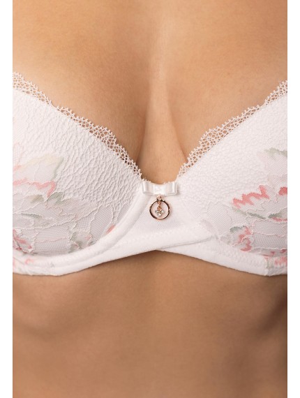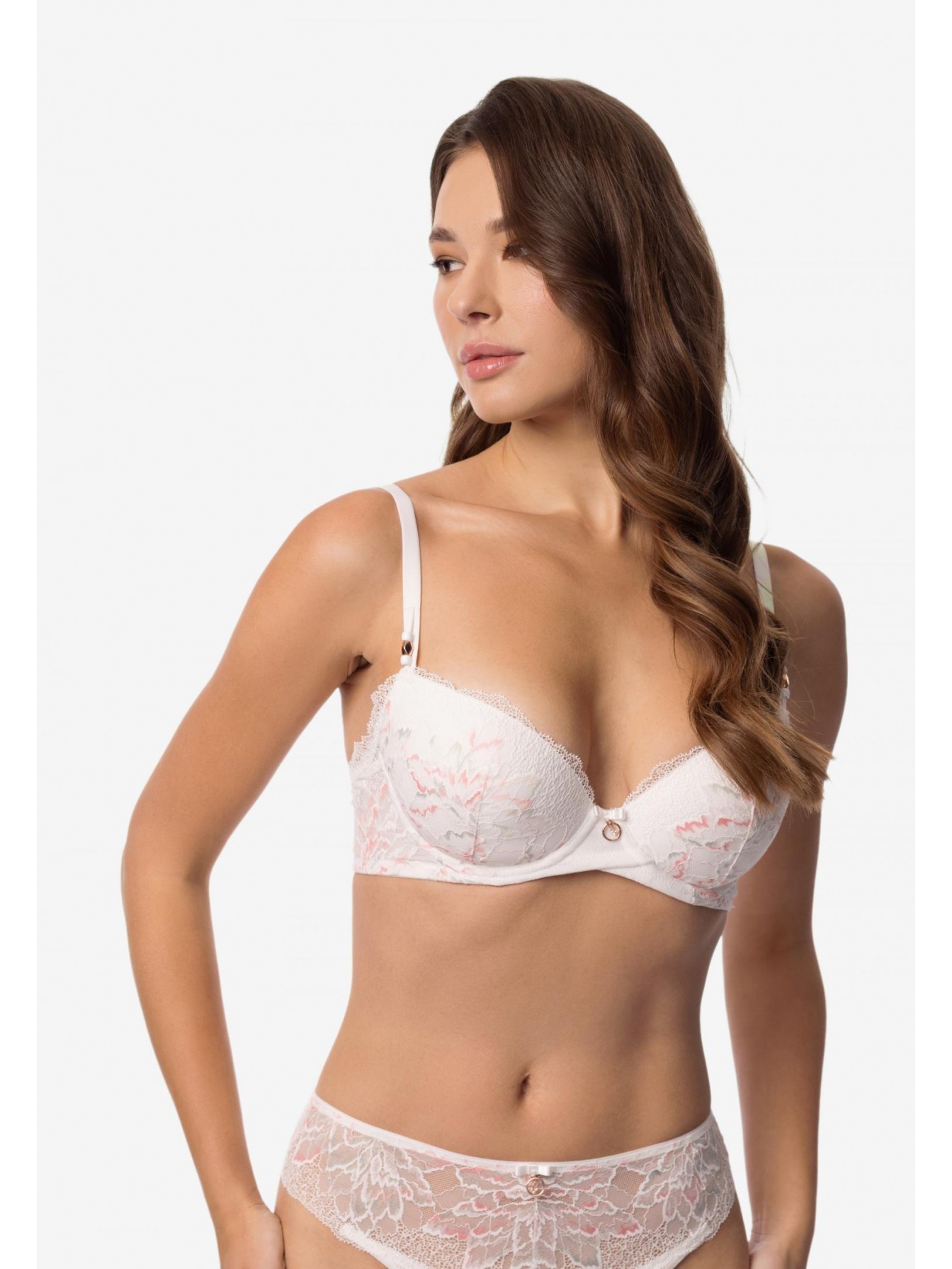 Бюстгальтер с формованной чашкой и съемными корректорами «пуш-ап» на каркасной поддержке. Внутренняя часть чашки дублирована хлопком. Перекрест деталей из сетки и кружева на боковой панели. Круглая спинка. Бретели украшены аксессуаром.