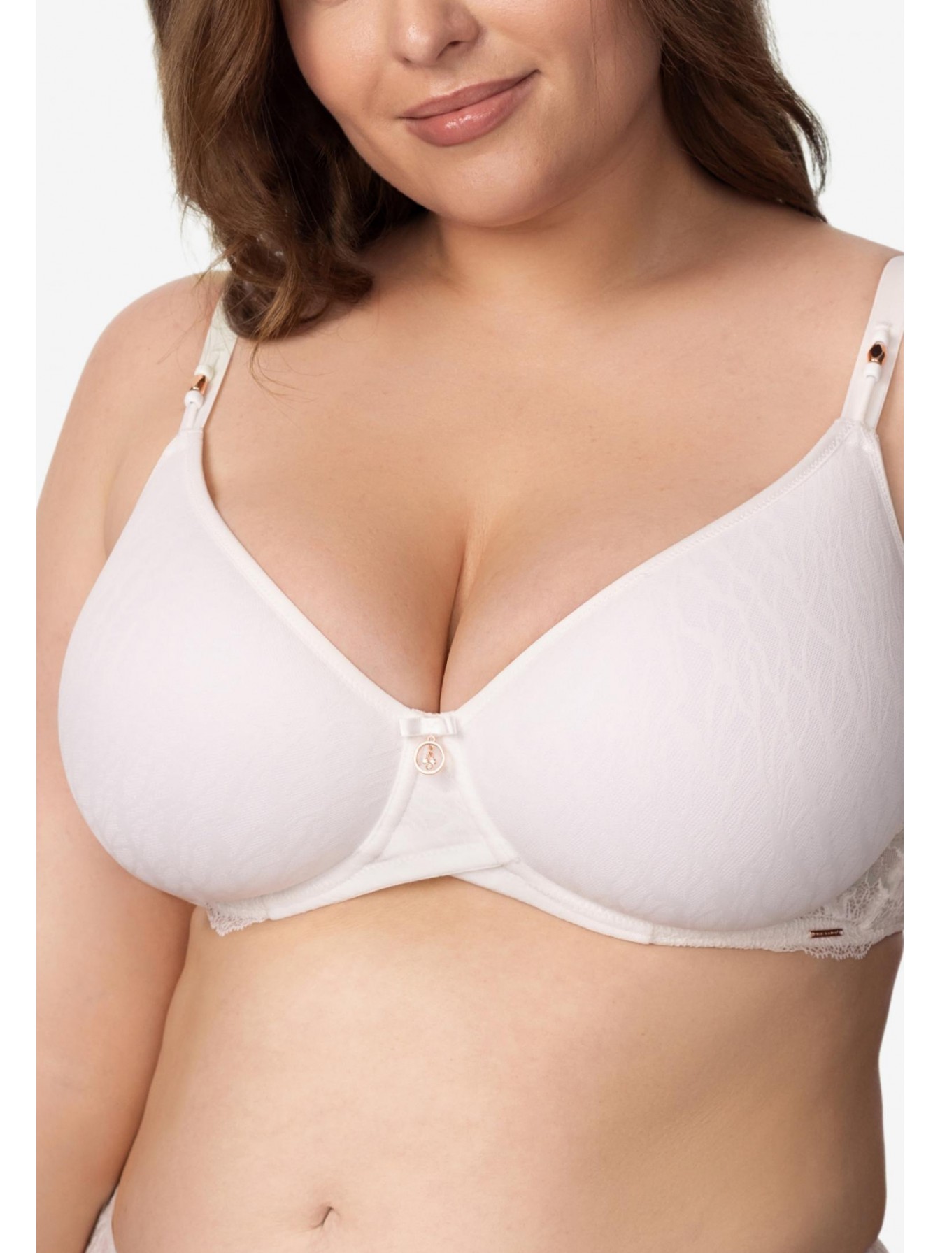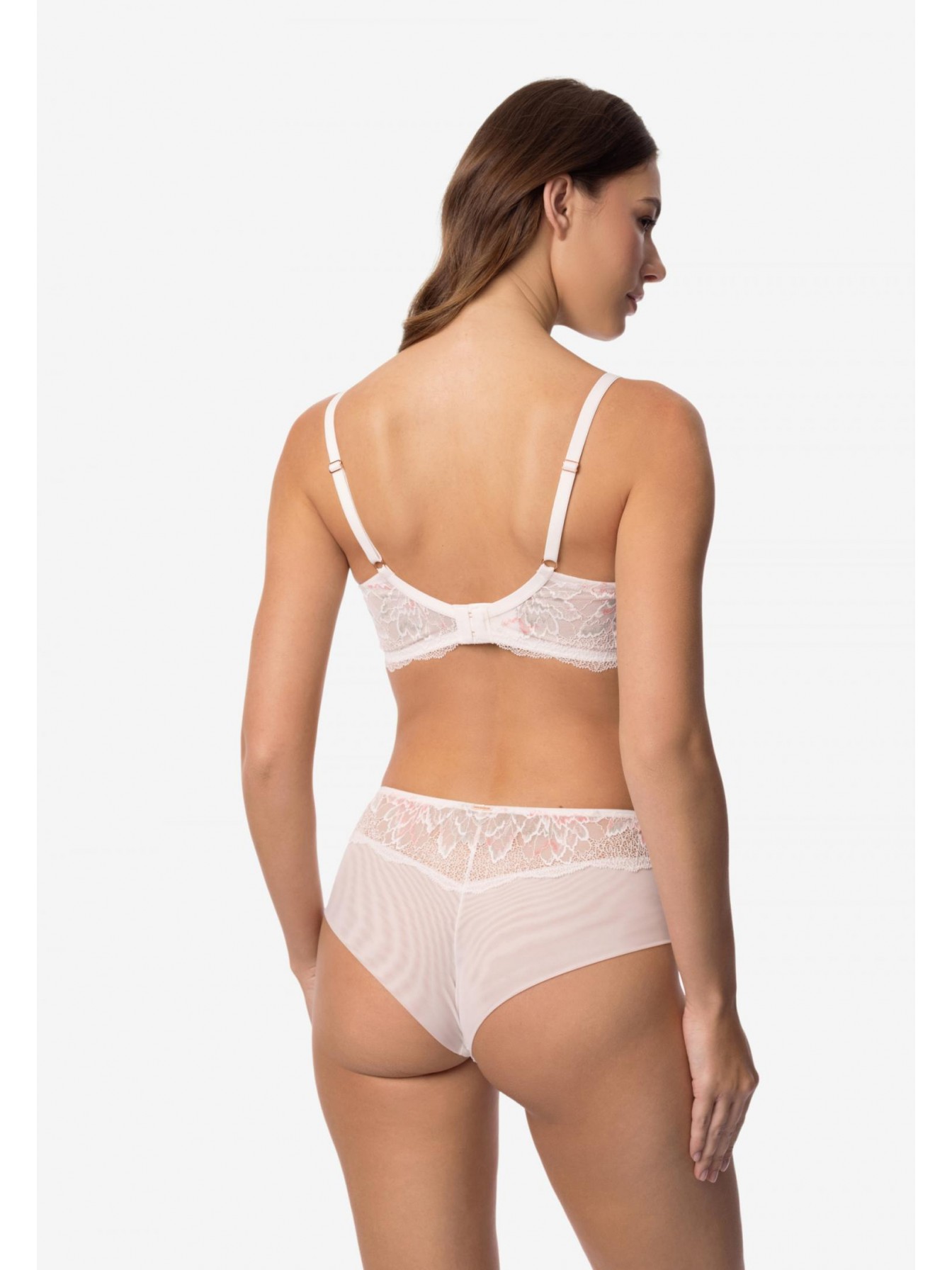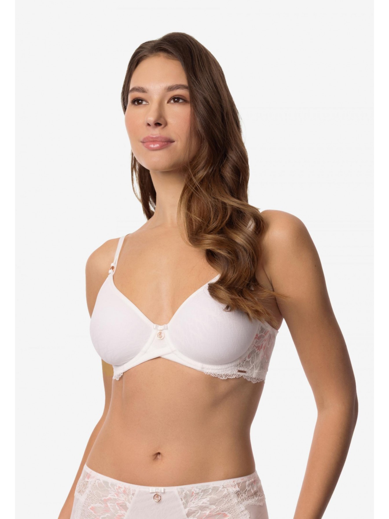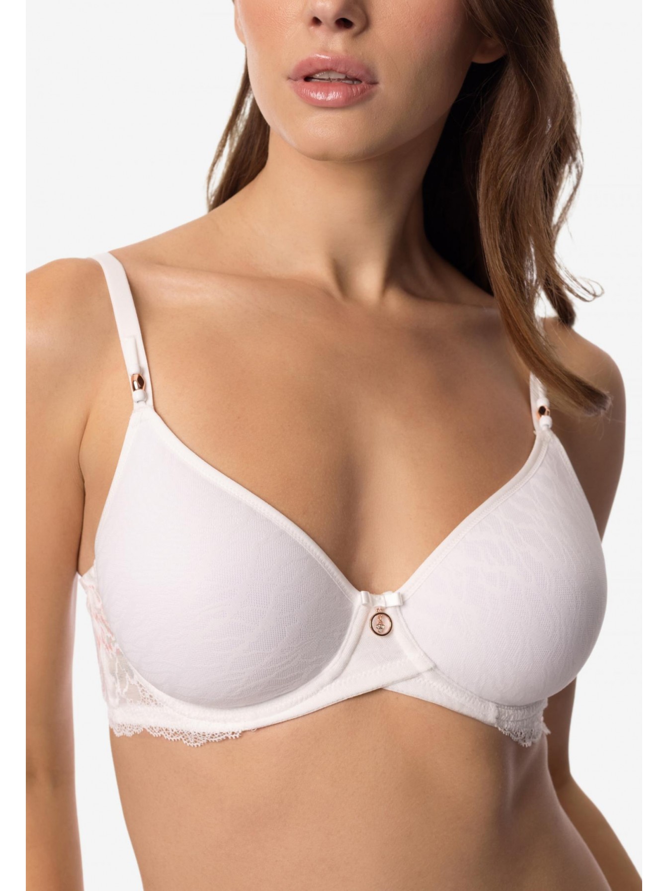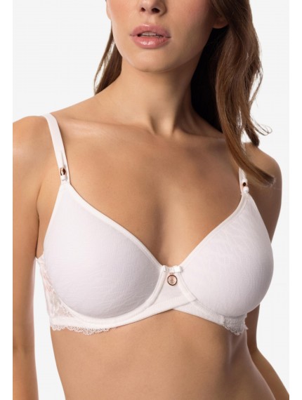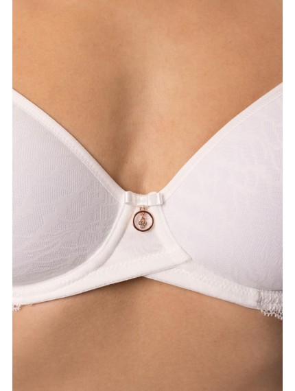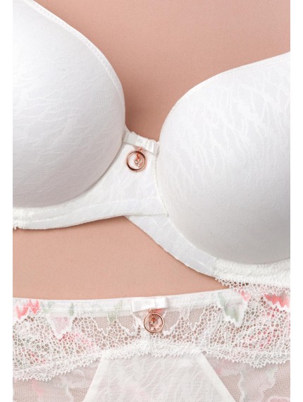 Бюстгальтер с формованной чашкой «Spacer» на каркасной поддержке. С внешней стороны чашки покрыты кружевом. Стан выполнен из кружева на подкладке. Круглая спинка.