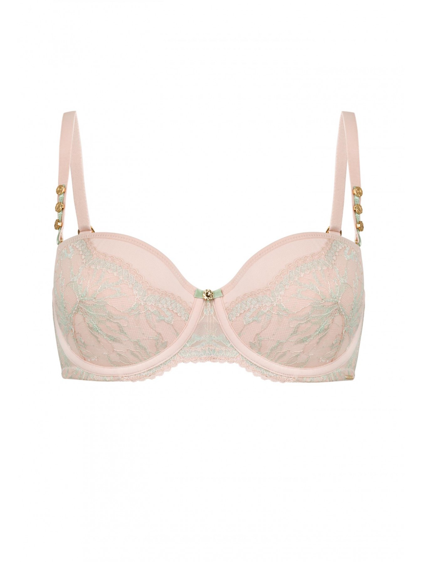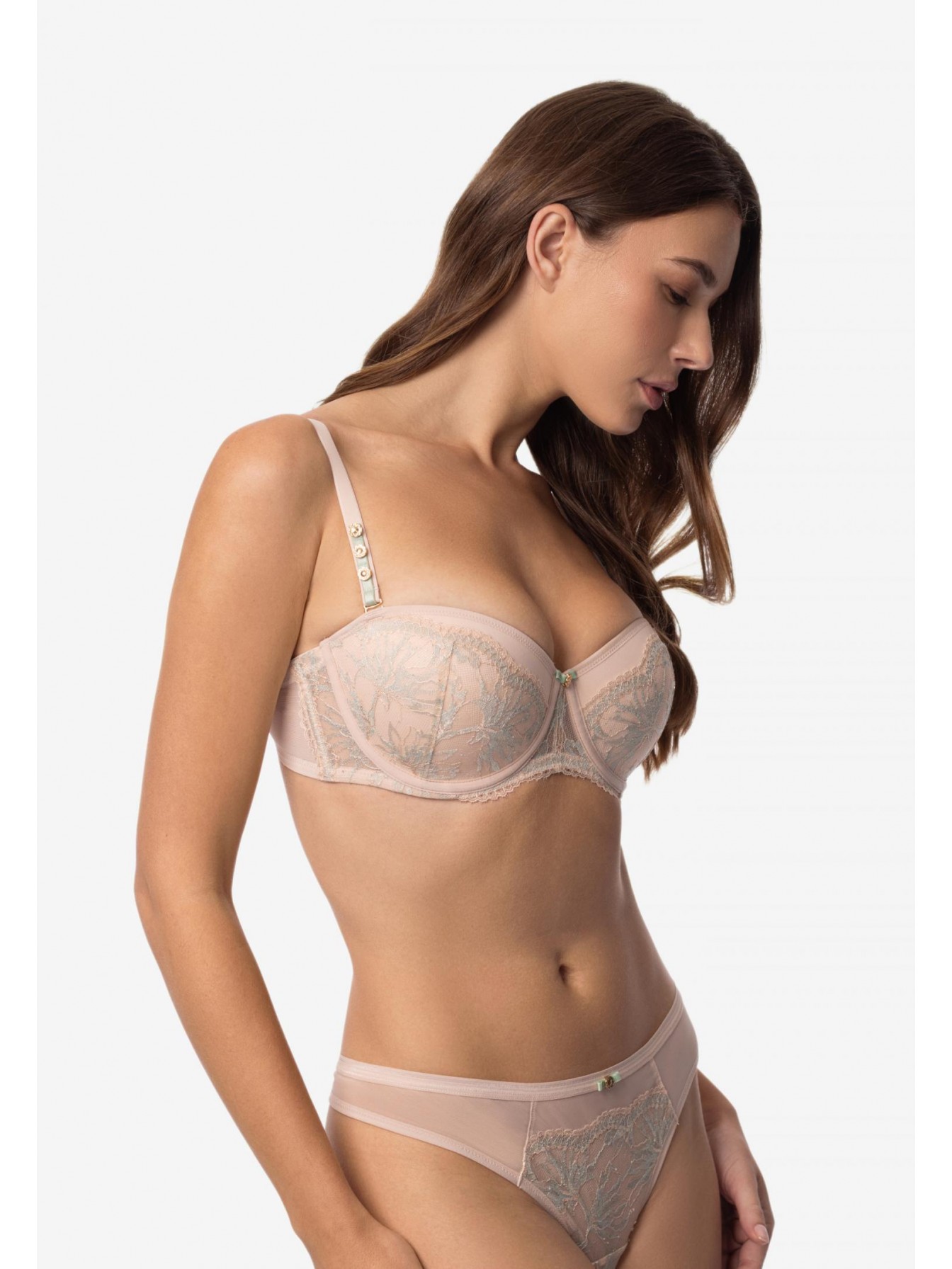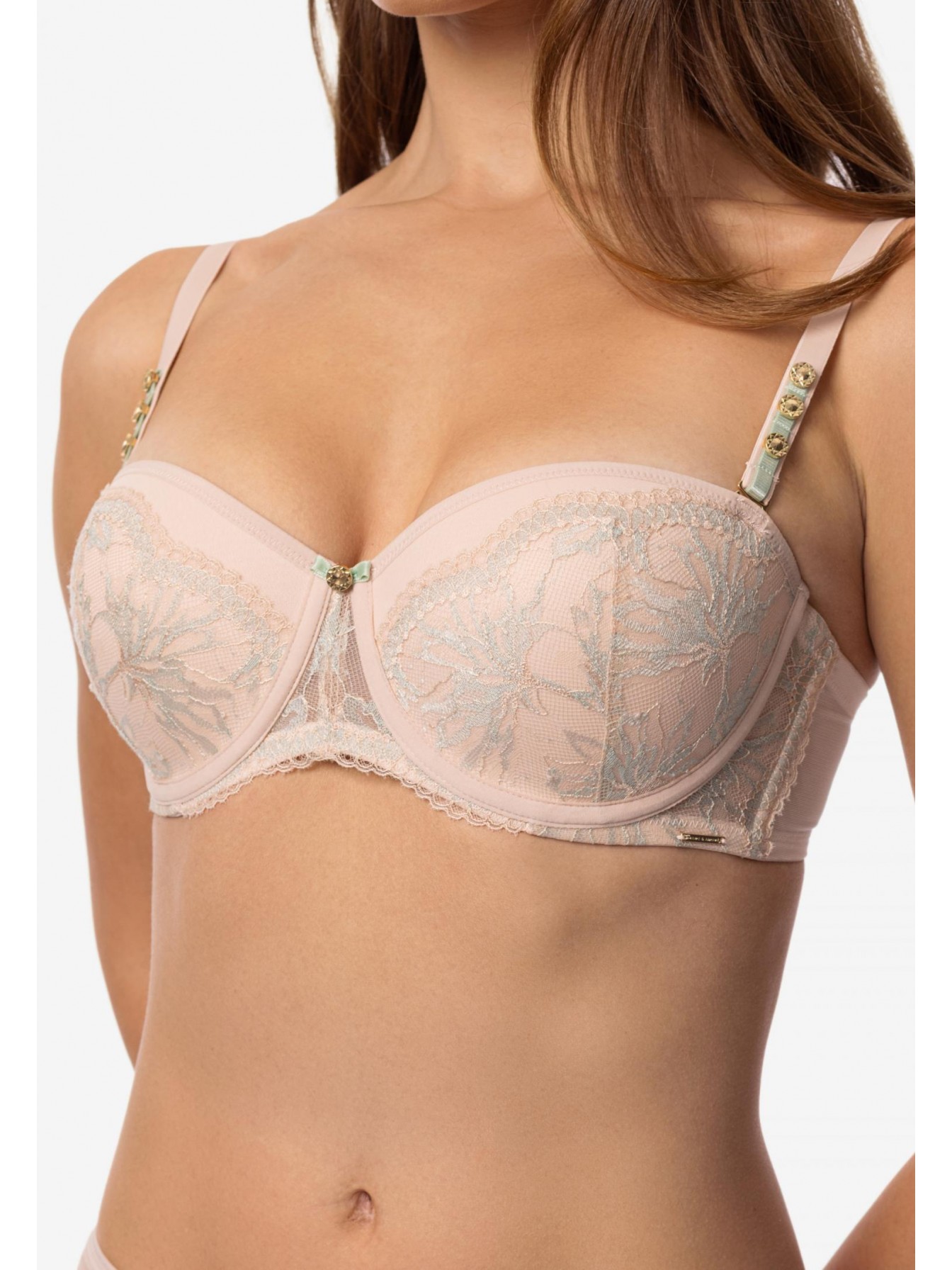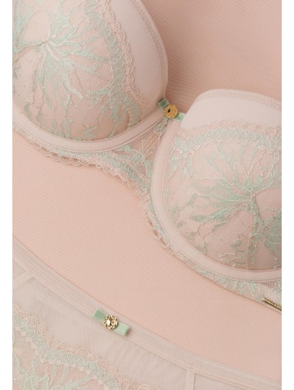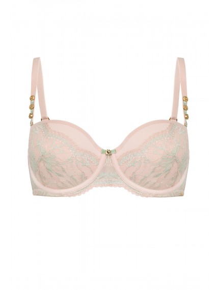Бюстгальтер-балконет с формованной чашкой со встроенным корректором «пуш-ап», на каркасной поддержке. Чашка украшена кружевом. Стан из эластичной сетки. По верхнему краю силиконовая лента. Съемные бретели декорированы аксессуаром. Дополнительные силиконовые бретели в комплекте.