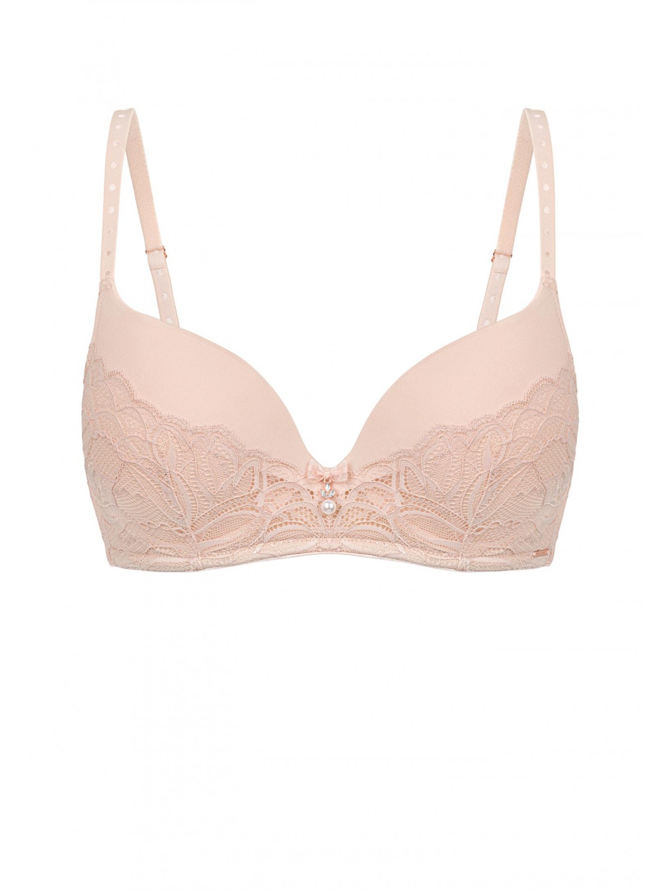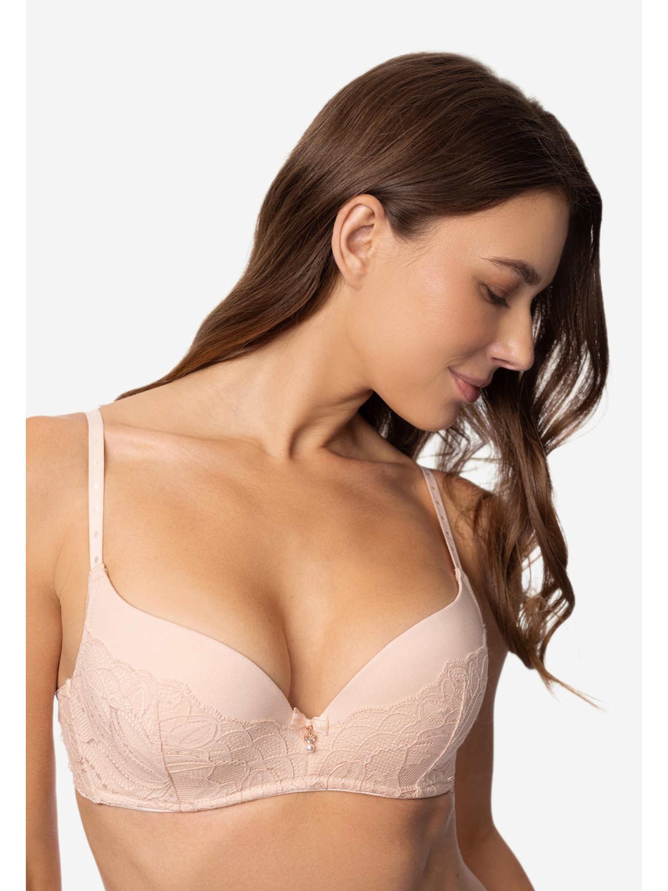 Бюстгальтер с формованной чашкой и встроенным «тройным пуш-ап». Каркасная поддержка. Визуальное увеличение груди на два размера. Отделка с эффектом «скрытого каркаса». Чашки с внешней стороны декорированы кружевом. Круглая спинка. Боковые поддерживающие косточки.