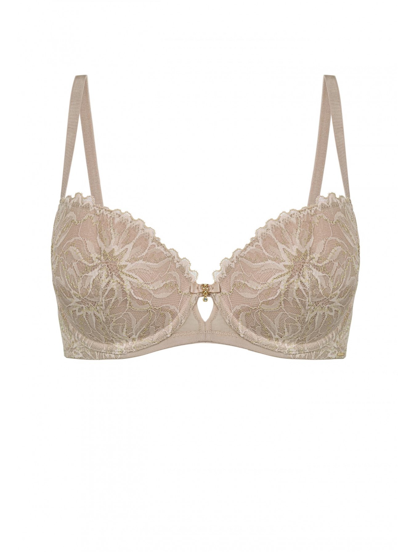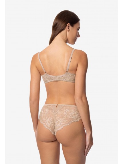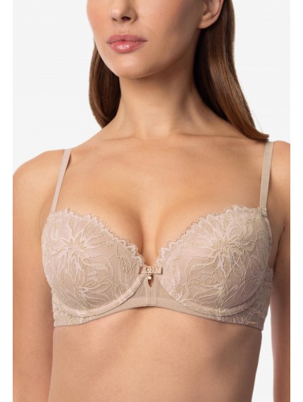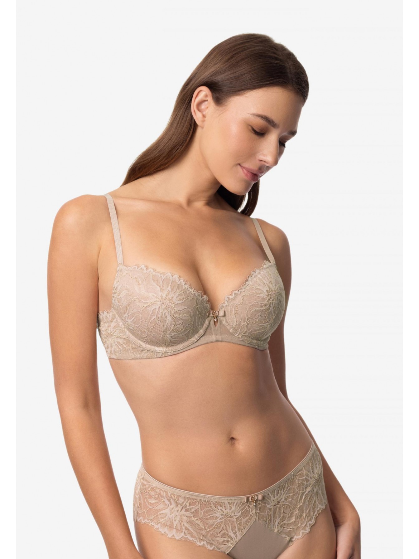 Бюстгальтер с формованной чашкой и съёмными корректорами «пуш-ап» на каркасной поддержке. Внутренняя часть чашки дублирована хлопком. Круглая спинка.