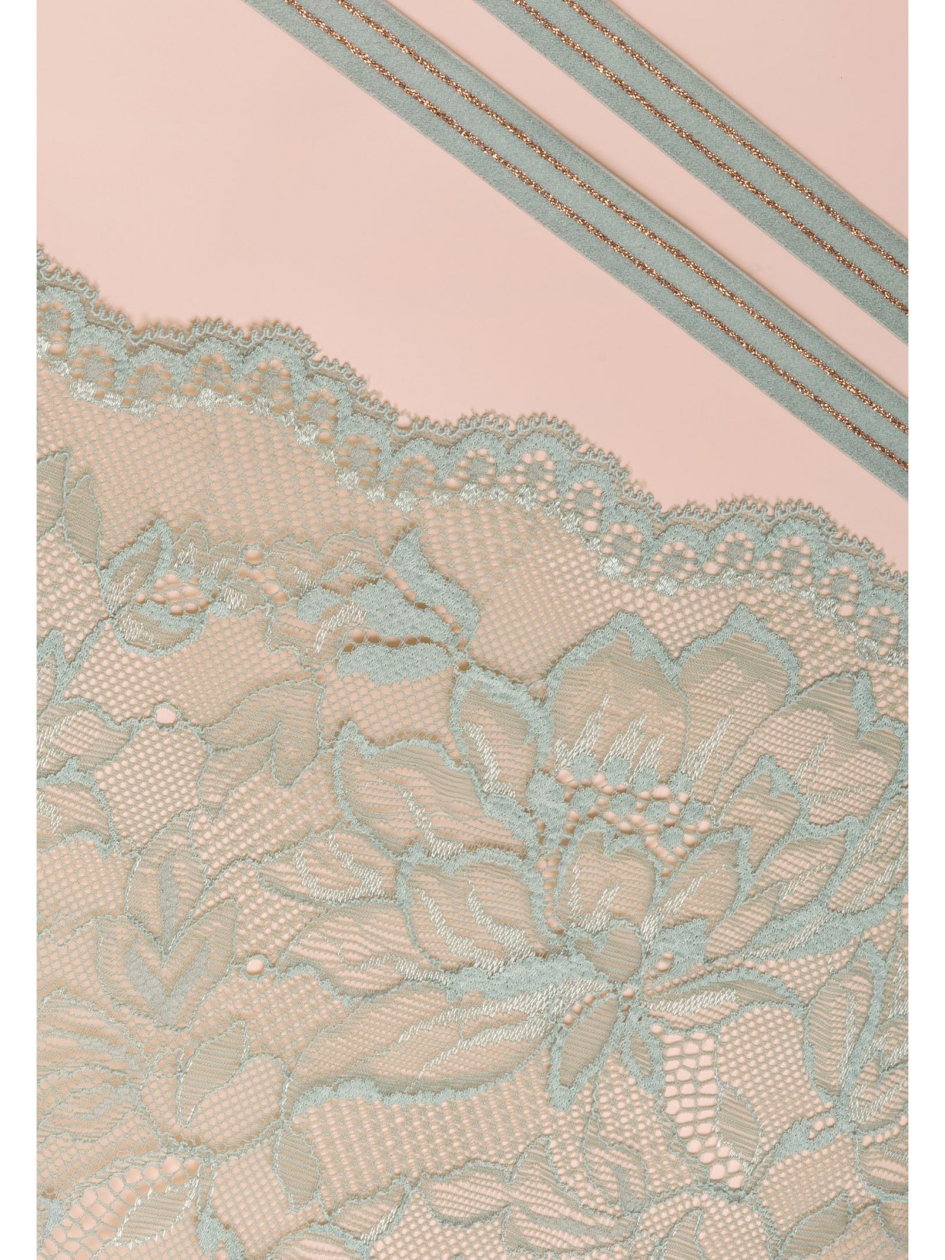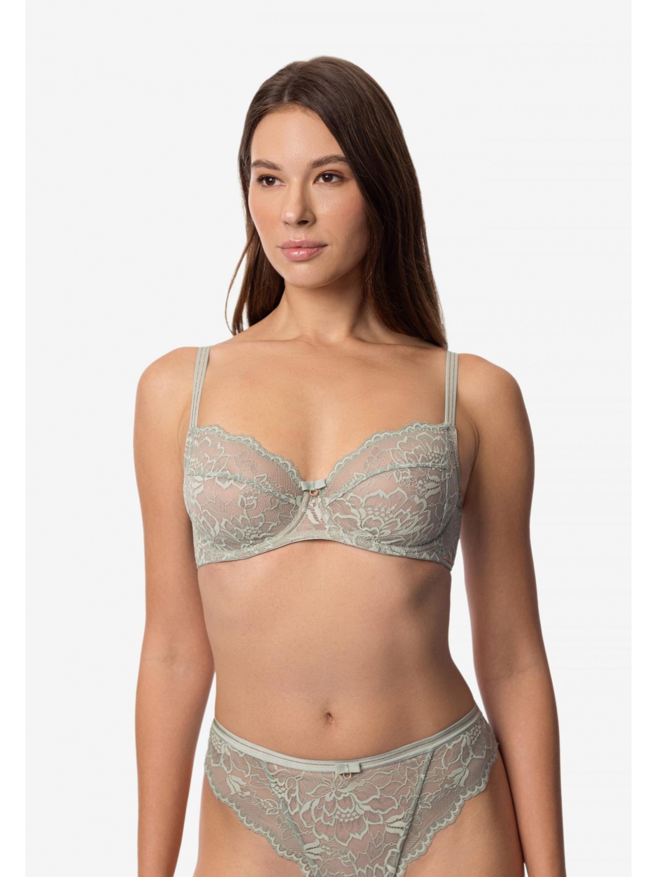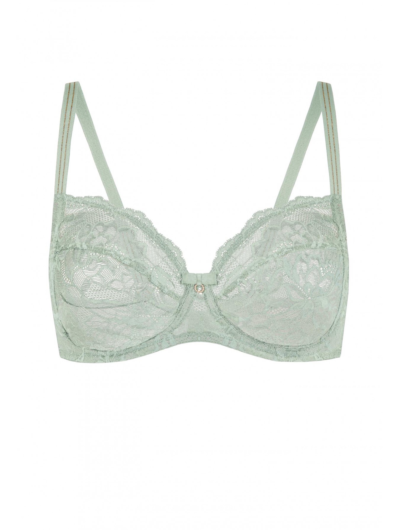 Бюстгальтер с мягкой кружевной чашкой на каркасной поддержке. Чашка c боковым подкроем. Внутренняя поверхность дублирована эластичной сеткой. Кружевной стан на подкладке из сетки. Боковые поддерживающие косточки. Бретели декорированы двойной золотой нитью. Круглая спинка.