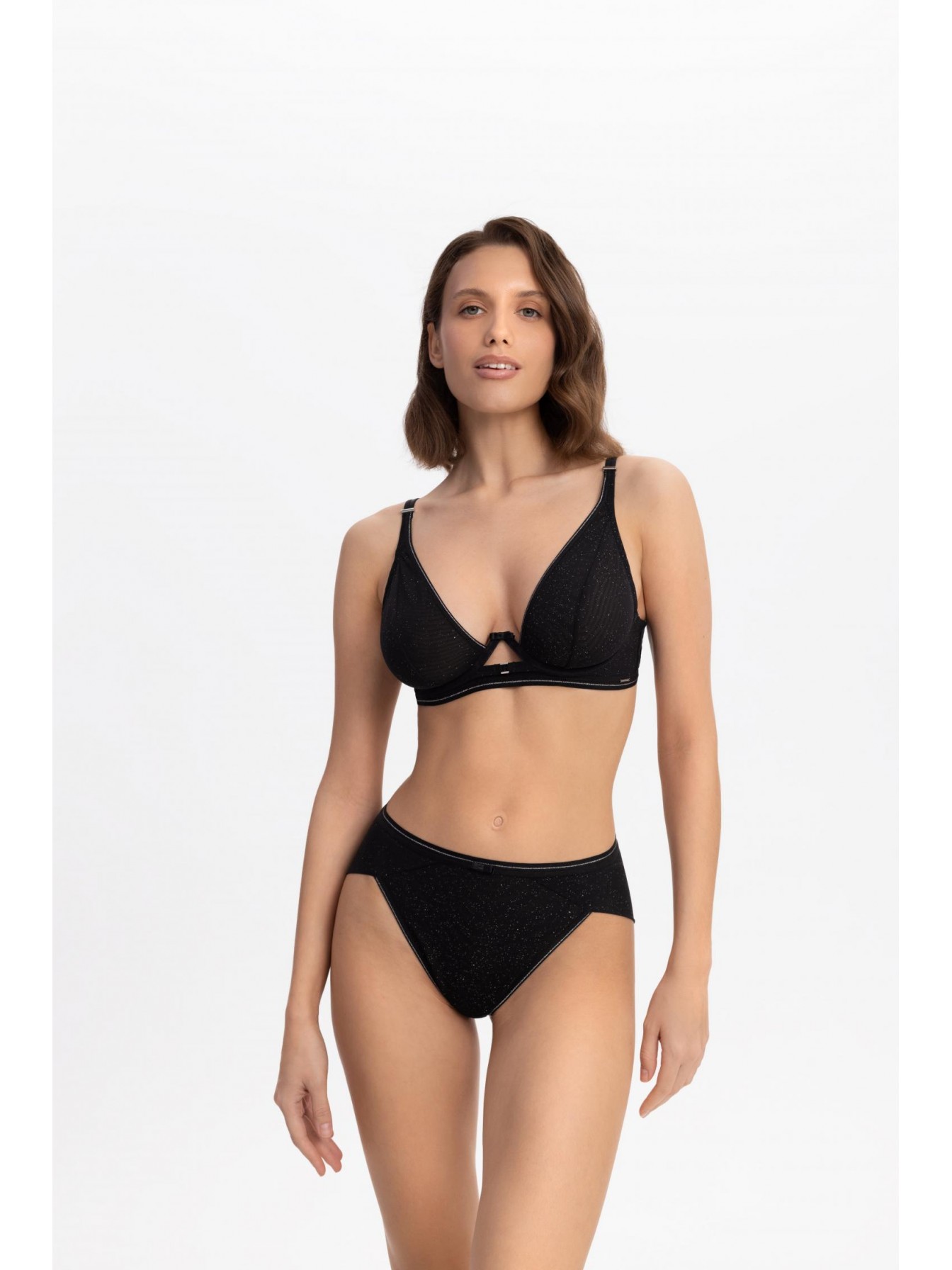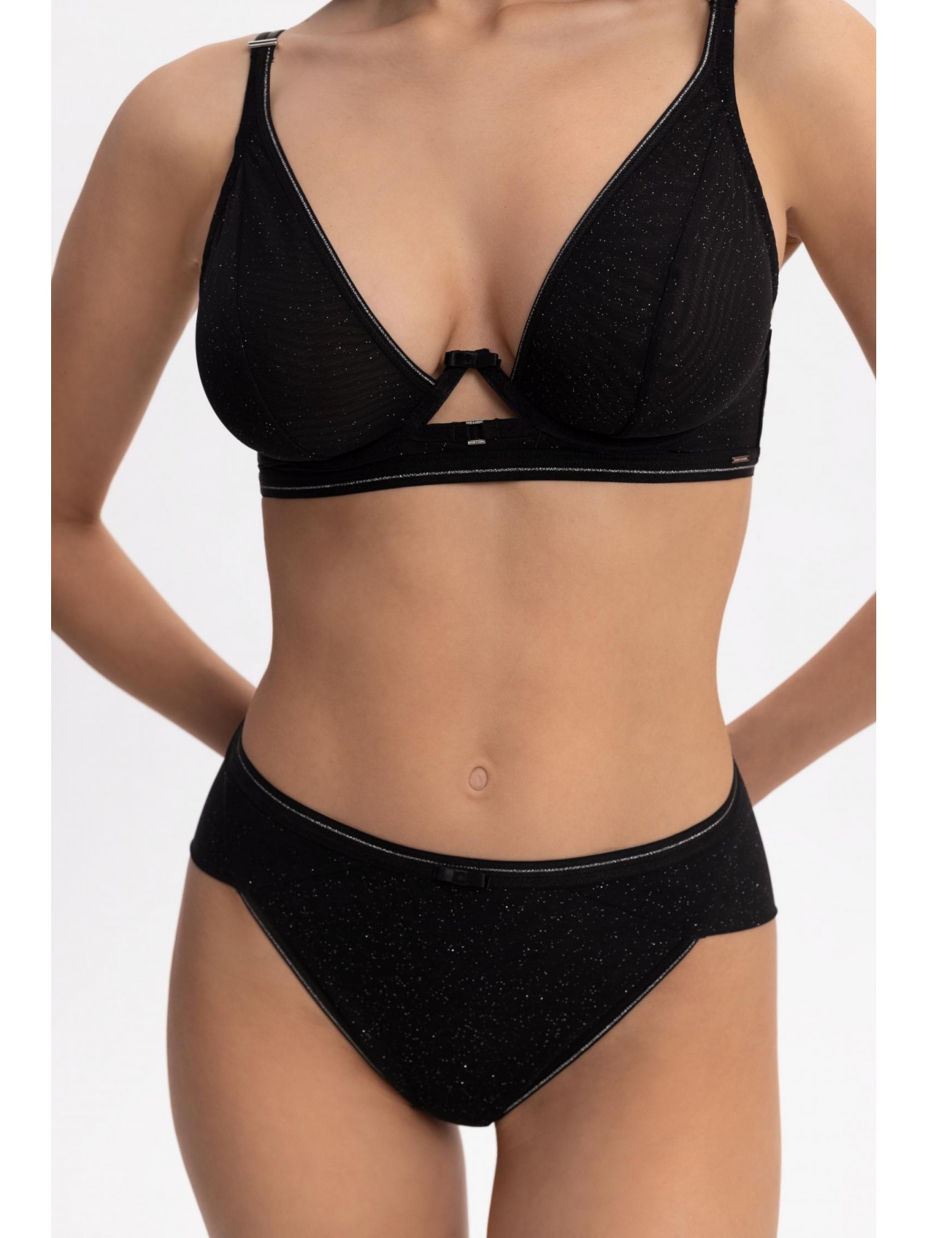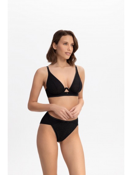 Бюстгальтер с мягкой треугольной чашкой на каркасной поддержке. Углубленная V-образная линия декольте оформлена эластичной тесьмой с серебристой нитью. Чашки выполнены из полупрозрачной сетки с микроблестками на подкладке из эластичной сетки mesh. Стан из эластичной сетки с микроблестками на подкладке из сетки. Боковые косточки. Поддерживающая резинка под грудью. Круглая спинка.