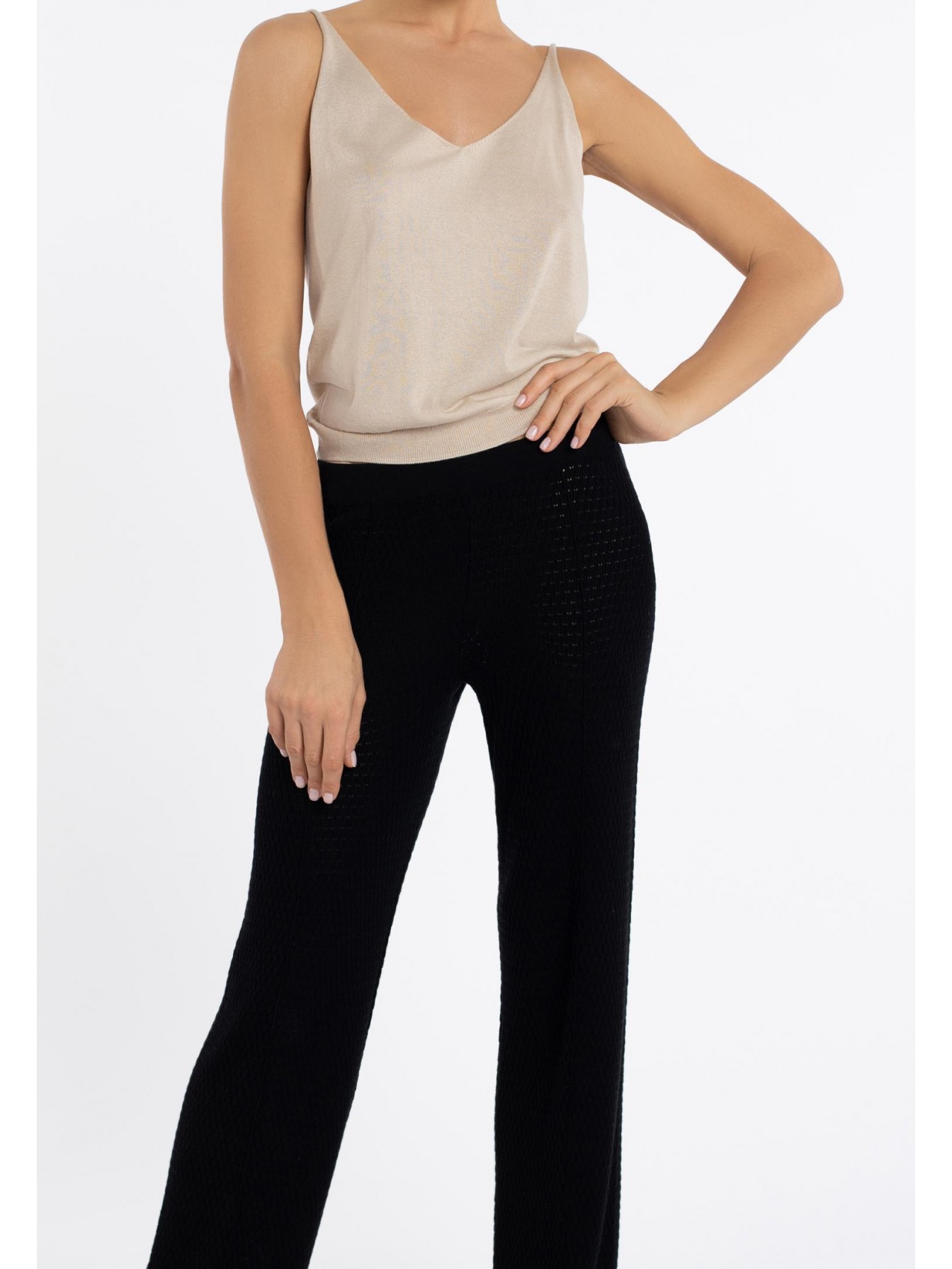 Брюки свободного прямого кроя. Пояс на широкой резинке. Стрелки на передних деталях отстрочены – это удлиняет силуэт и делает его стройнее. Оригинальная фактура трикотажного полотна