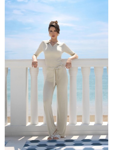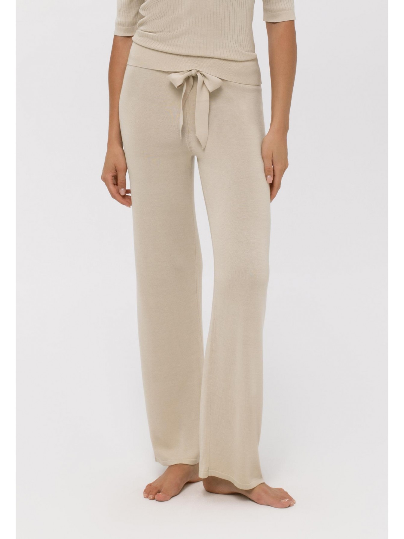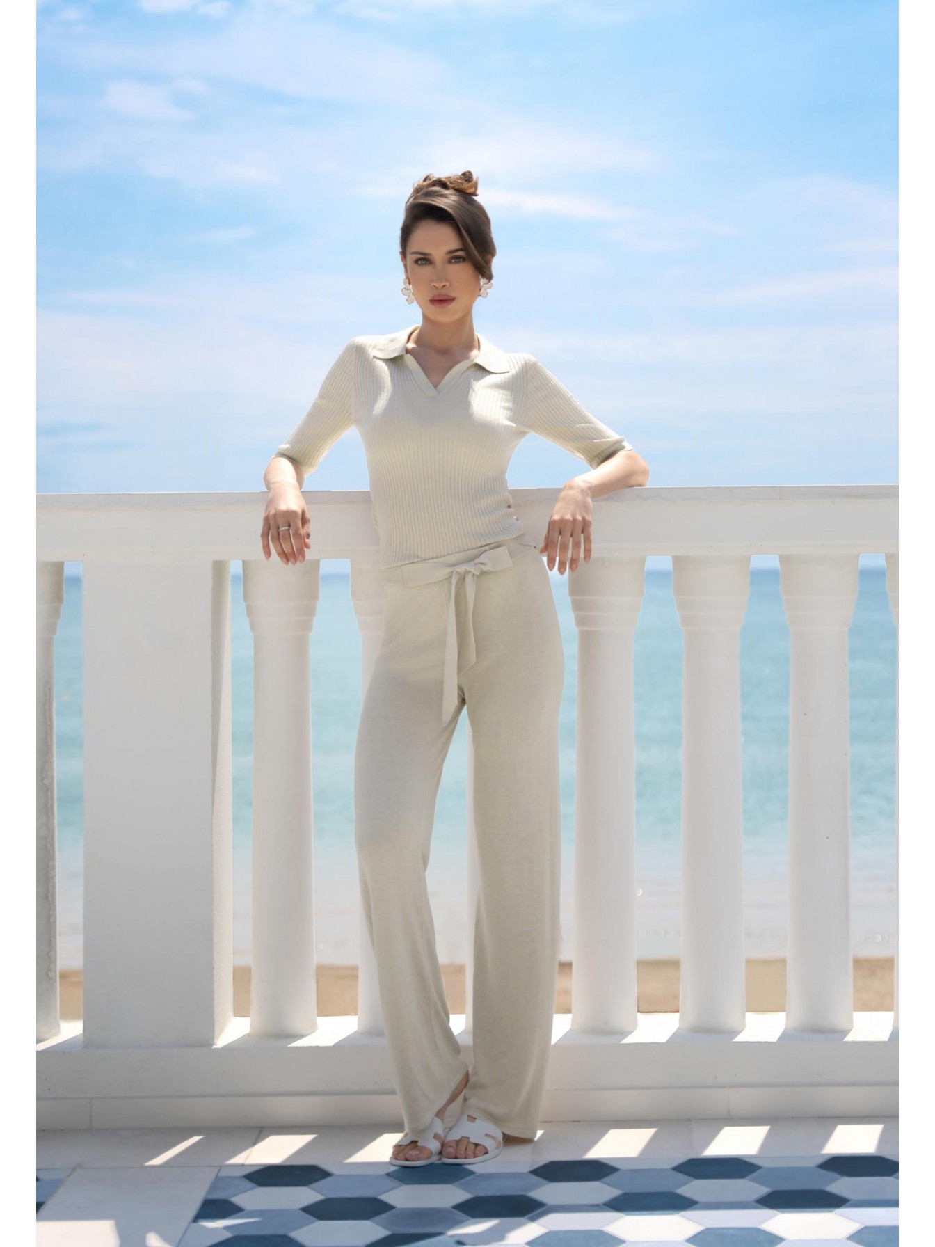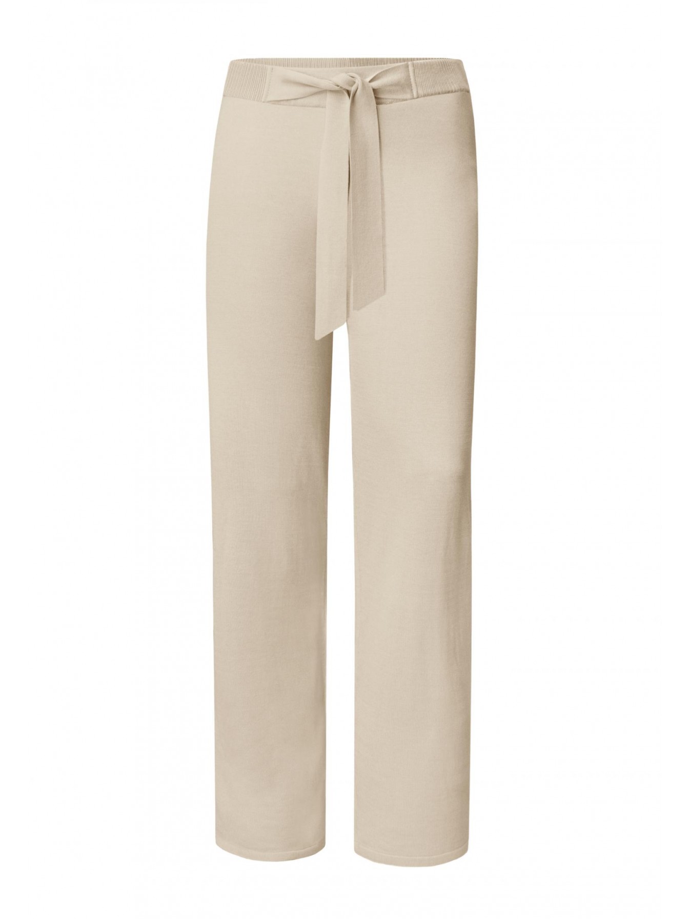 Брюки свободного прямого кроя. Пояс выполнен вязаной резинкой с широкими завязками из гладкого трикотажа.