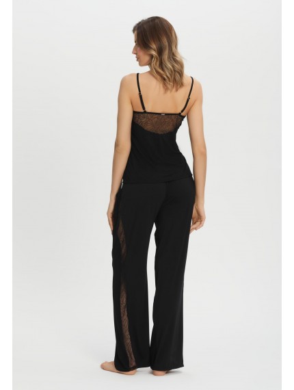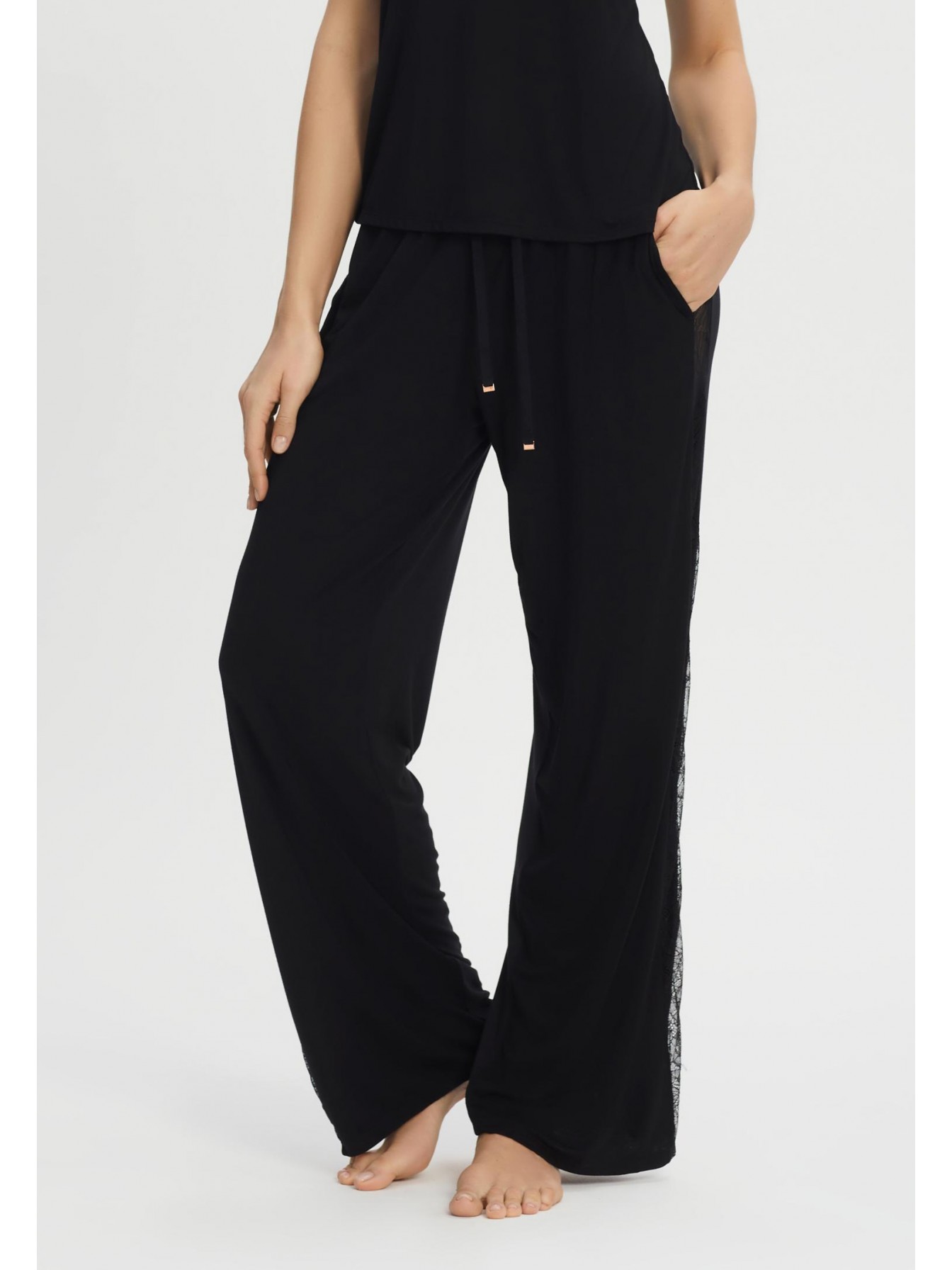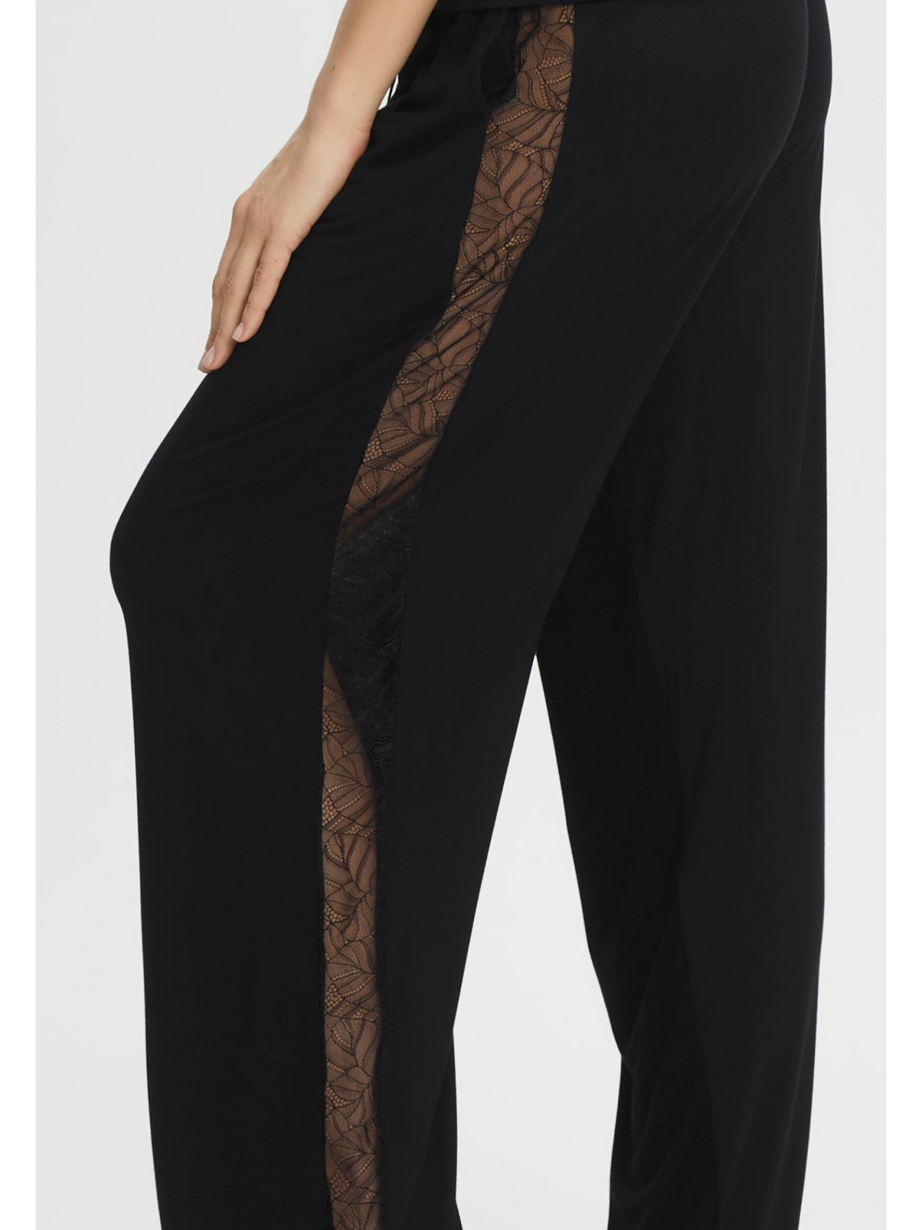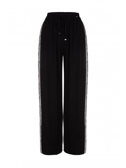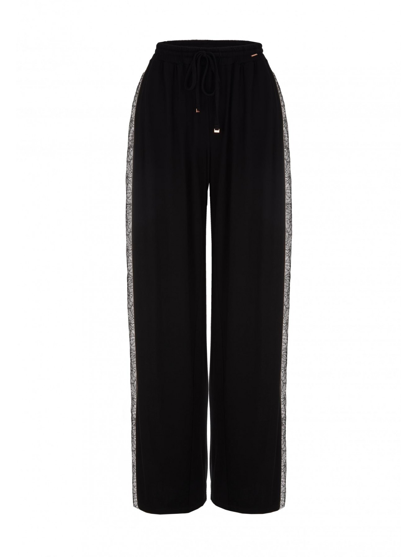Брюки свободного кроя. Пояс на резинке. Основной материал – вискоза. По бокам вставки из кружевного полотна.