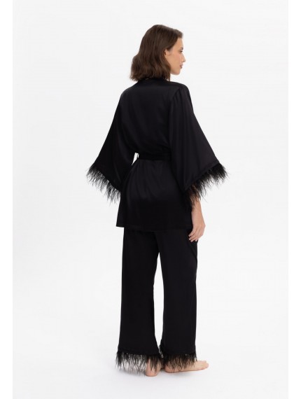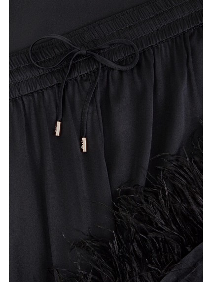 Брюки-капри из шелка прямого кроя. Низ брюк оформлен декоративными съемными перьями. Пояс на резинке с кулиской. Боковые карманы.