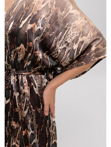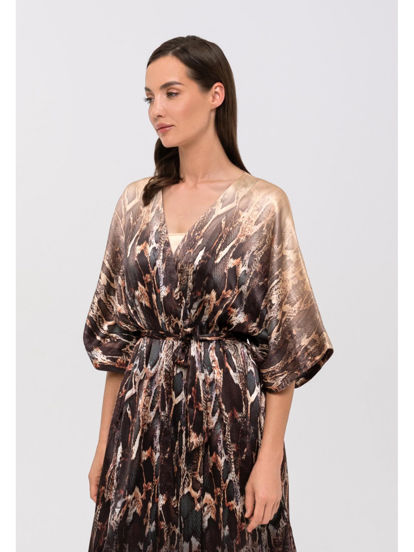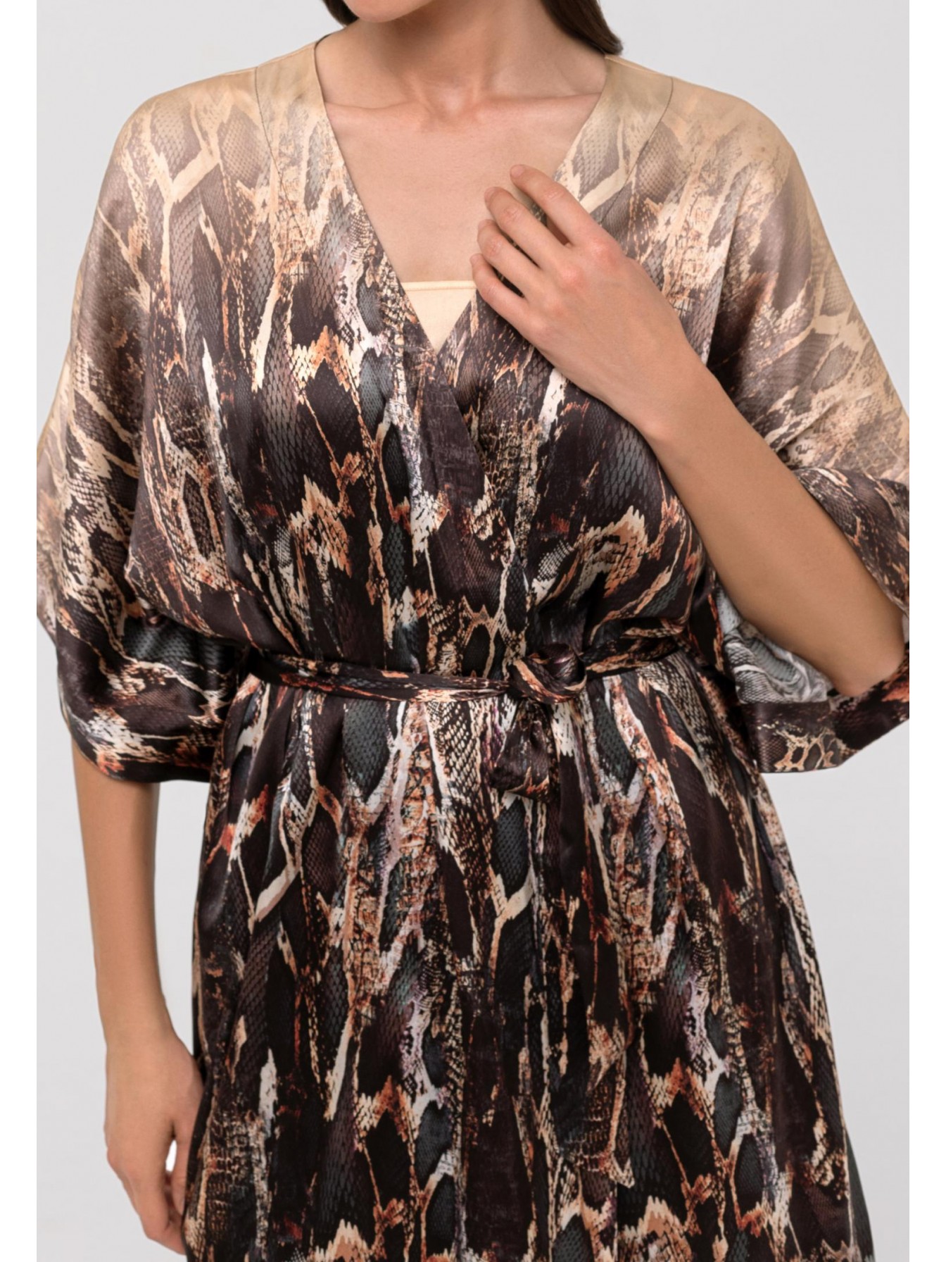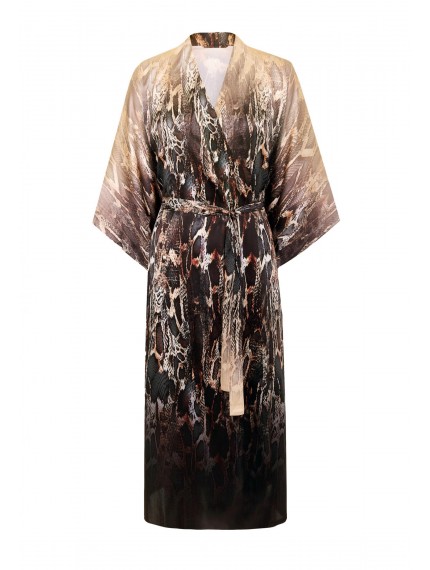 Шелковое кимоно свободного прямого кроя на поясе. Длина чуть ниже уровня колен. Широкий рукав. Боковые карманы. Placement print.