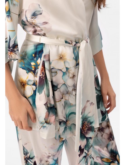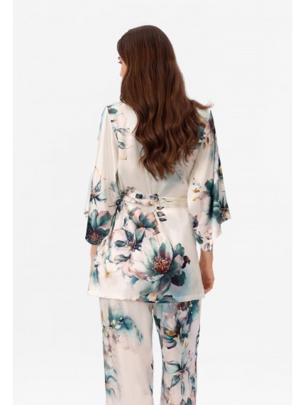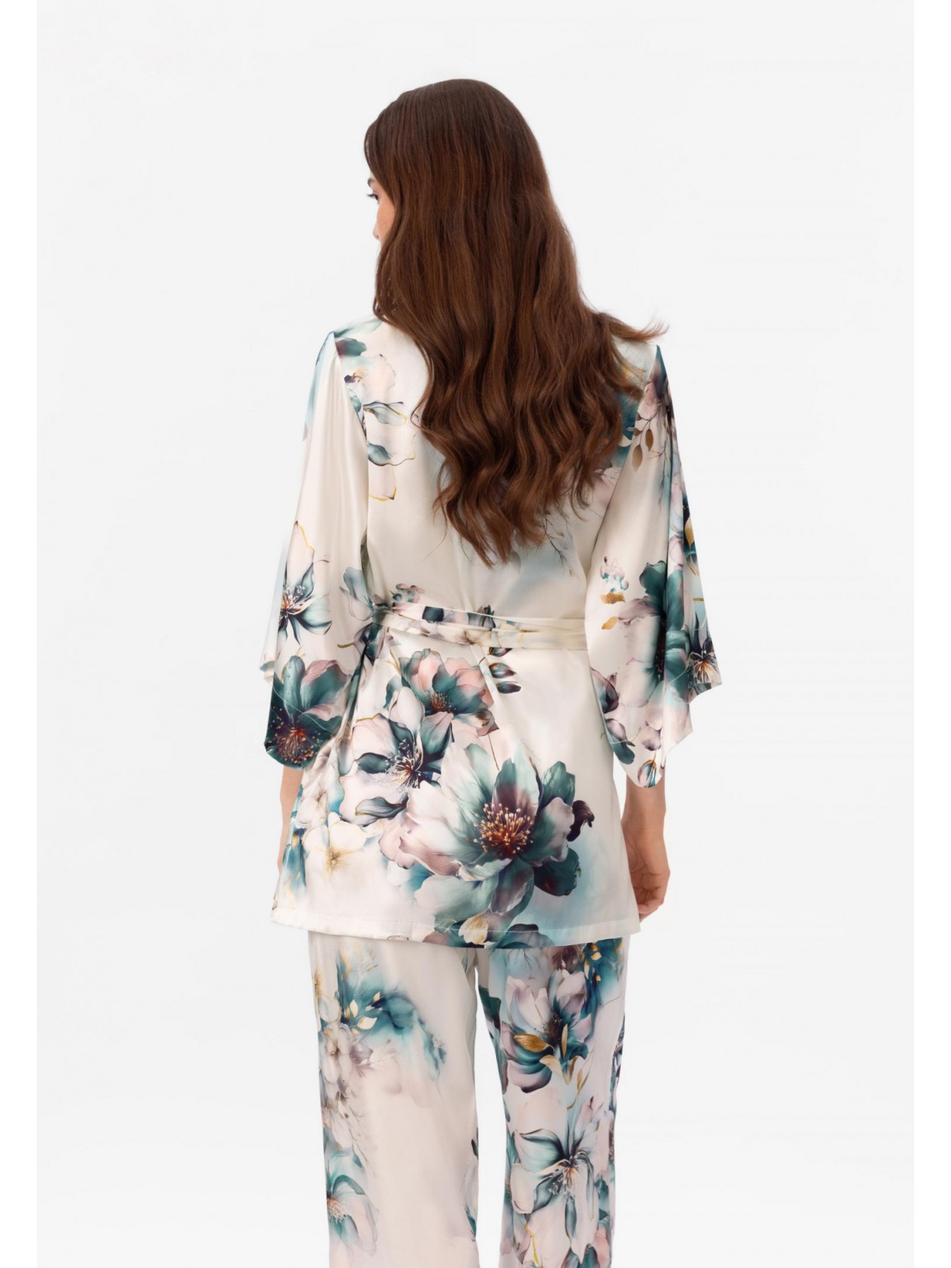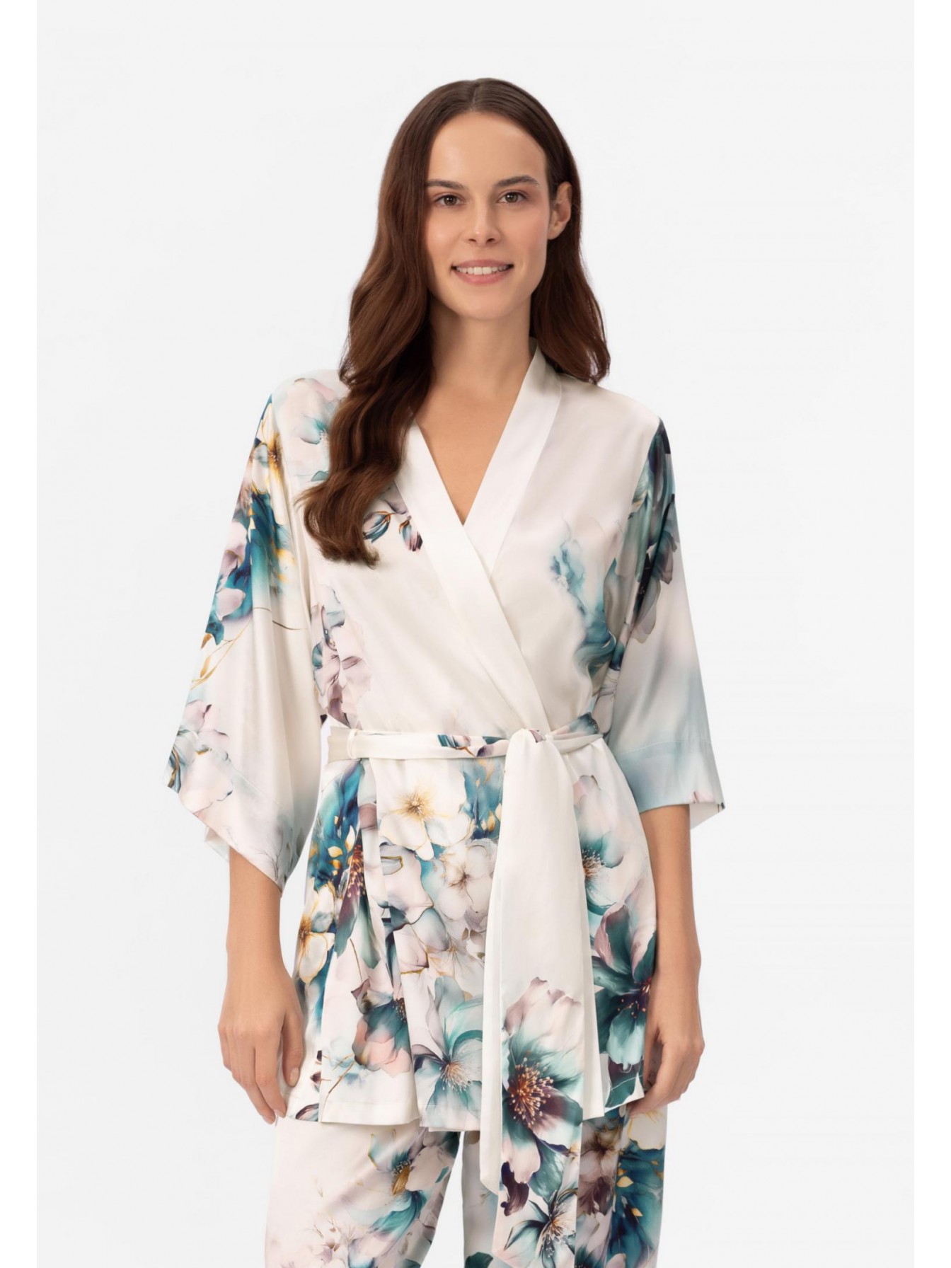 Короткое кимоно из шелка на поясе. Длина до середины бедра. Рукава 3/4. Боковые карманы.