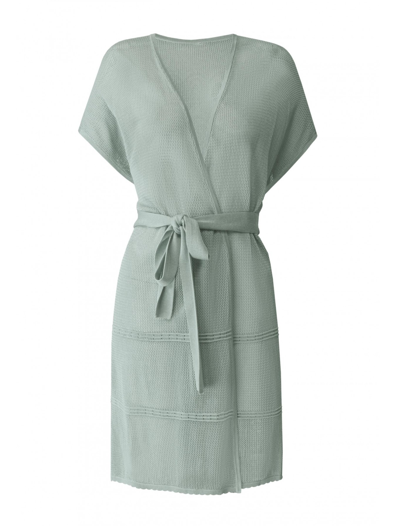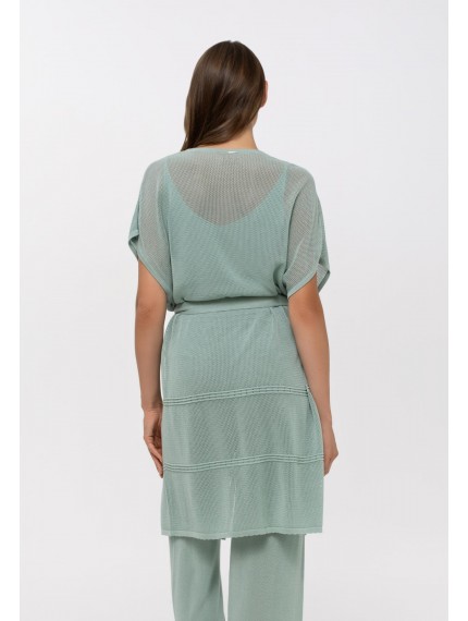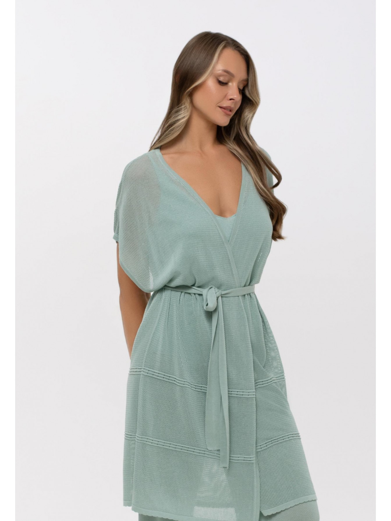 Летний кардиган со спущенным плечом свободного прямого кроя из мягкого шелка и лиоцелла. Ажурное трикотажное полотно с фактурными кантами. Пояс в комплекте. Длина до середины бедра.