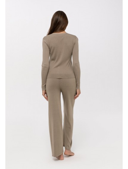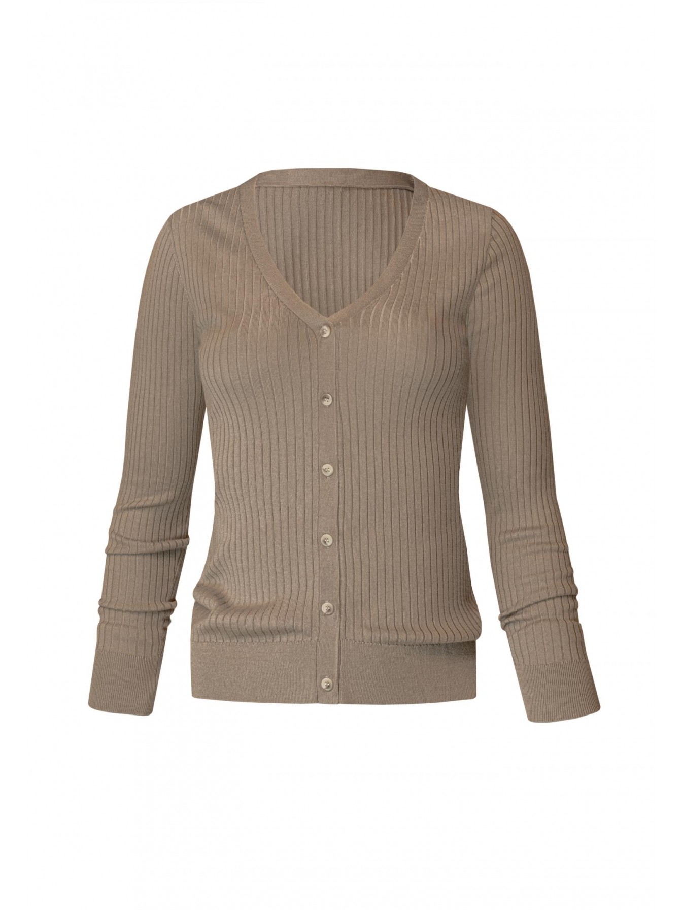 Кардиган полуприлегающего силуэта из трикотажа в рубчик на пуговицах. V-образный вырез. Длина до линии бедер. Низ изделия и рукавов оформлены вязаной резинкой.