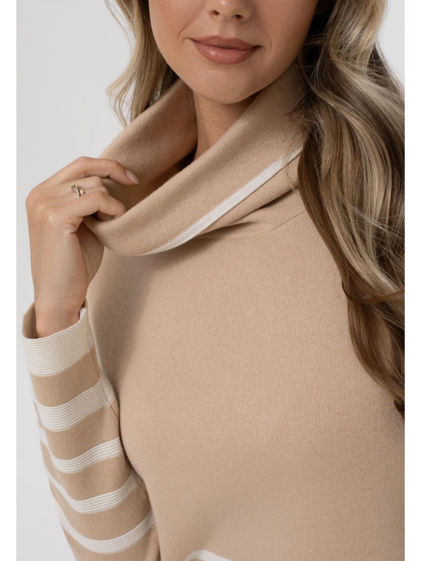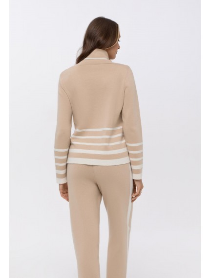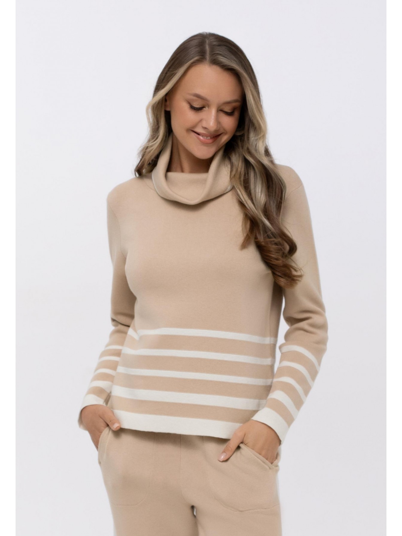 Укороченный джемпер свободного кроя из трикотажа интерлок. Воротник-хомут с отворотом. Длинный рукав. Контрастная отделка по нижнему краю рукавов, по низу изделия и горловине. Низ изделия выполнен по технике бесшовного края, без отстрочки.