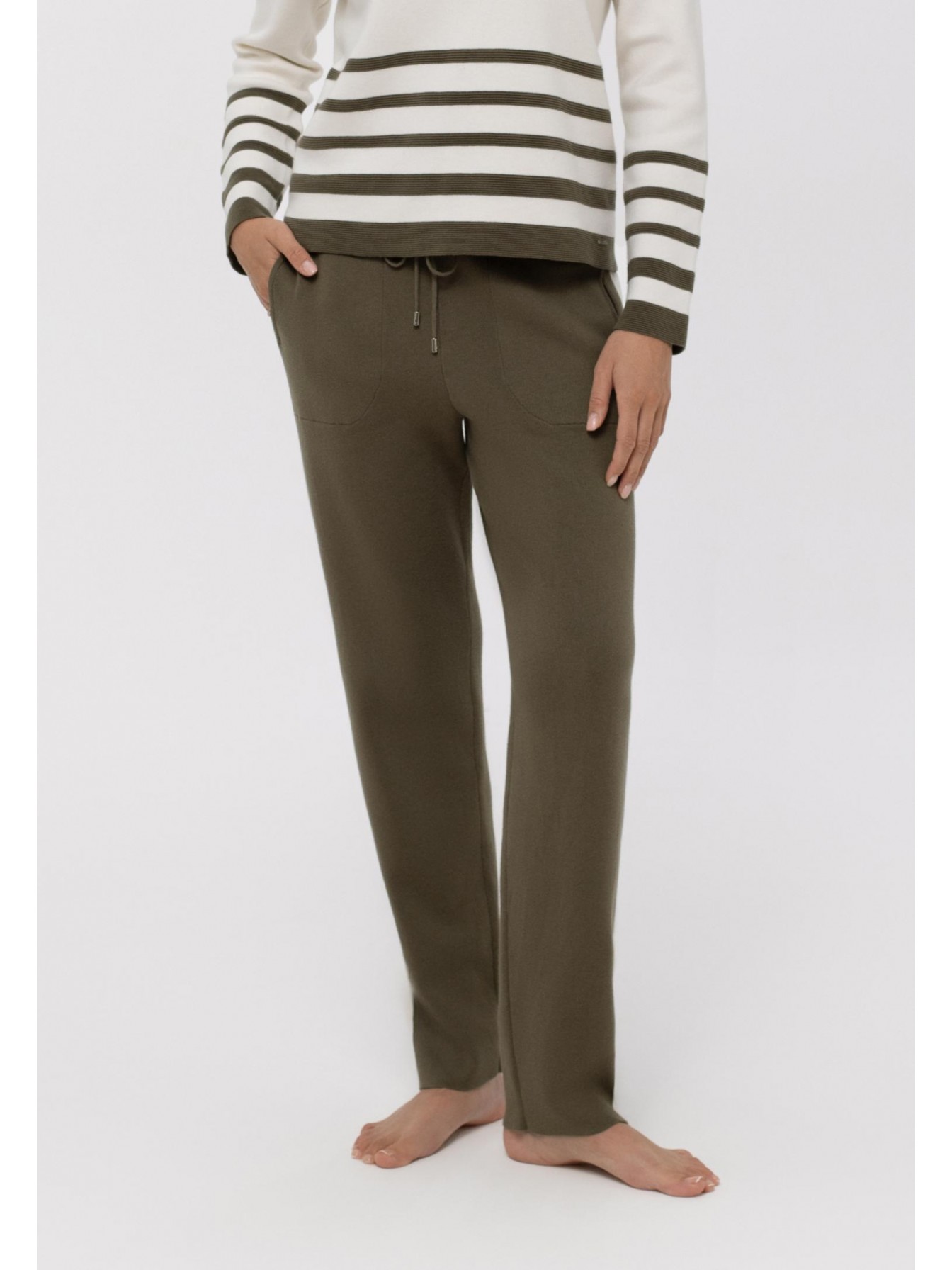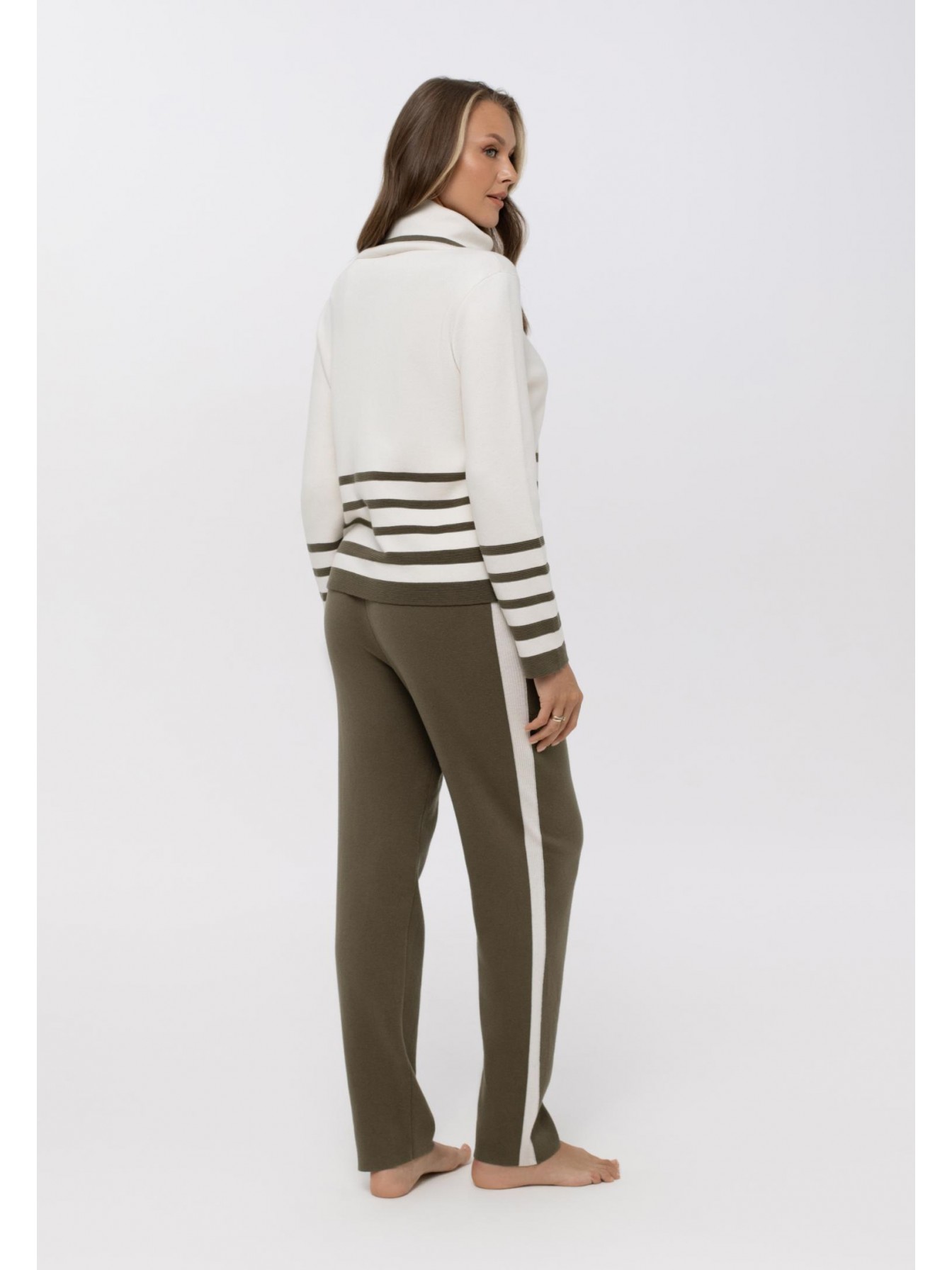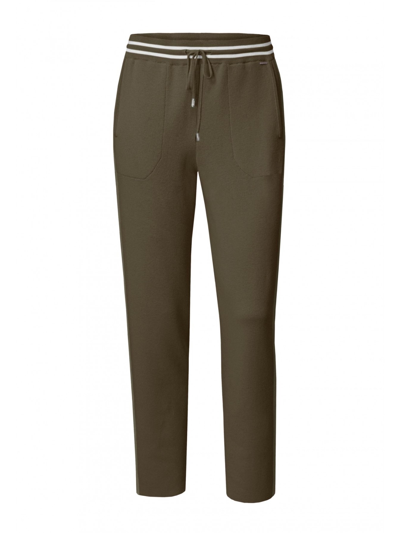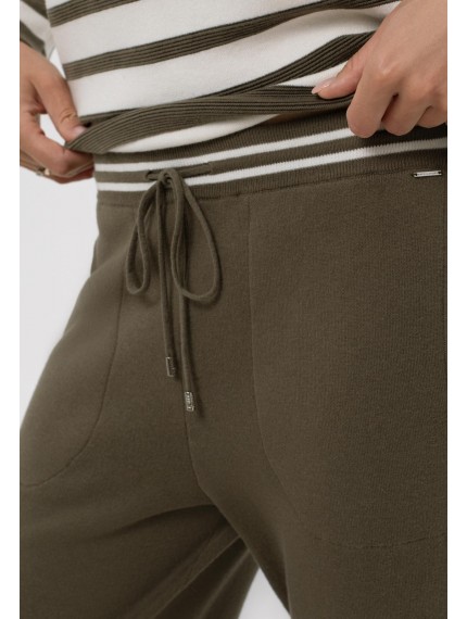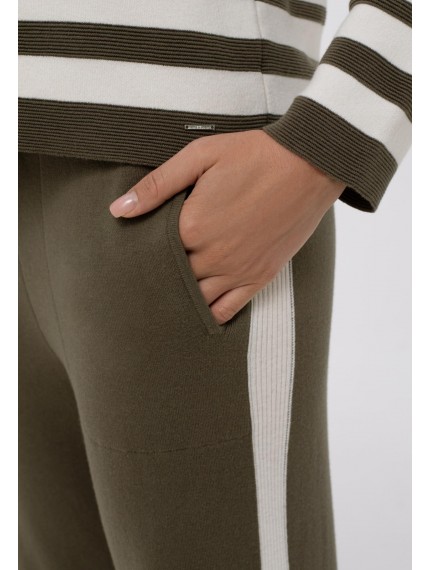 Брюки , слегка зауженные книзу. Пояс на резинке со шнуром. Боковые карманы. По бокам отделка контрастной полосой. Низ изделия выполнен по технике бесшовного края, без отстрочки.