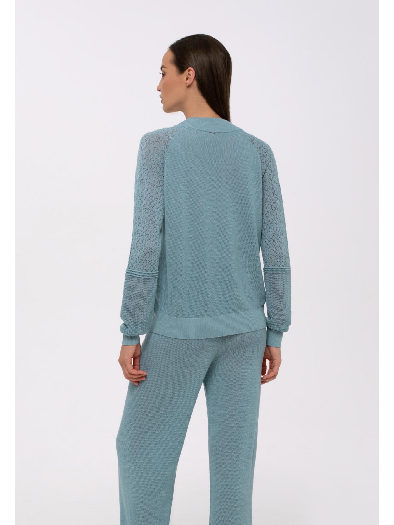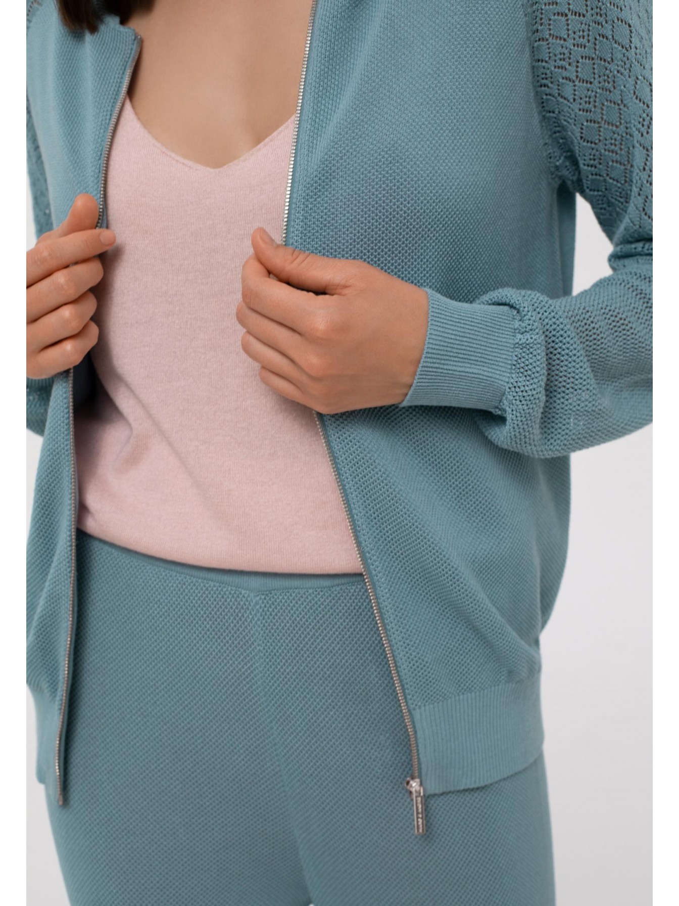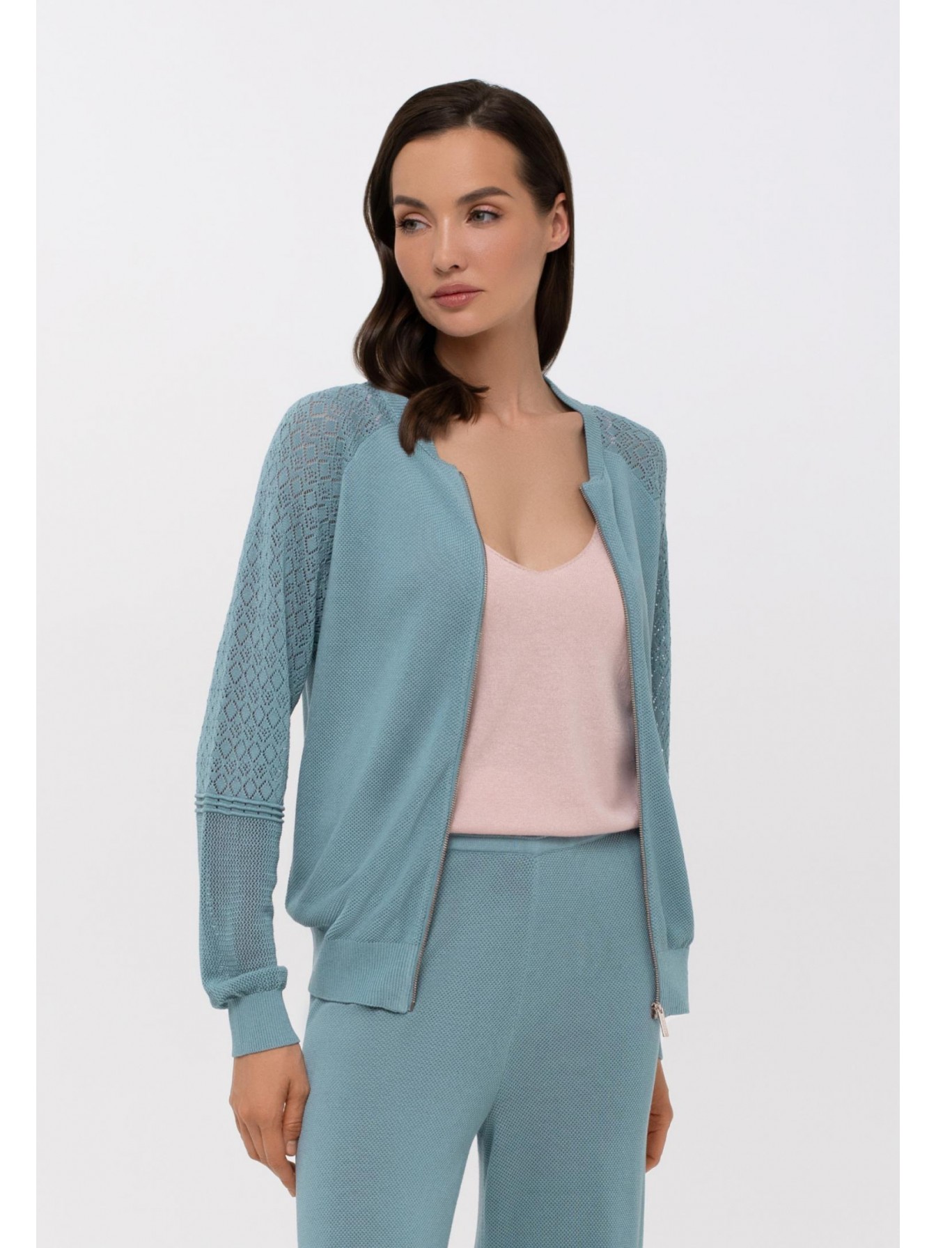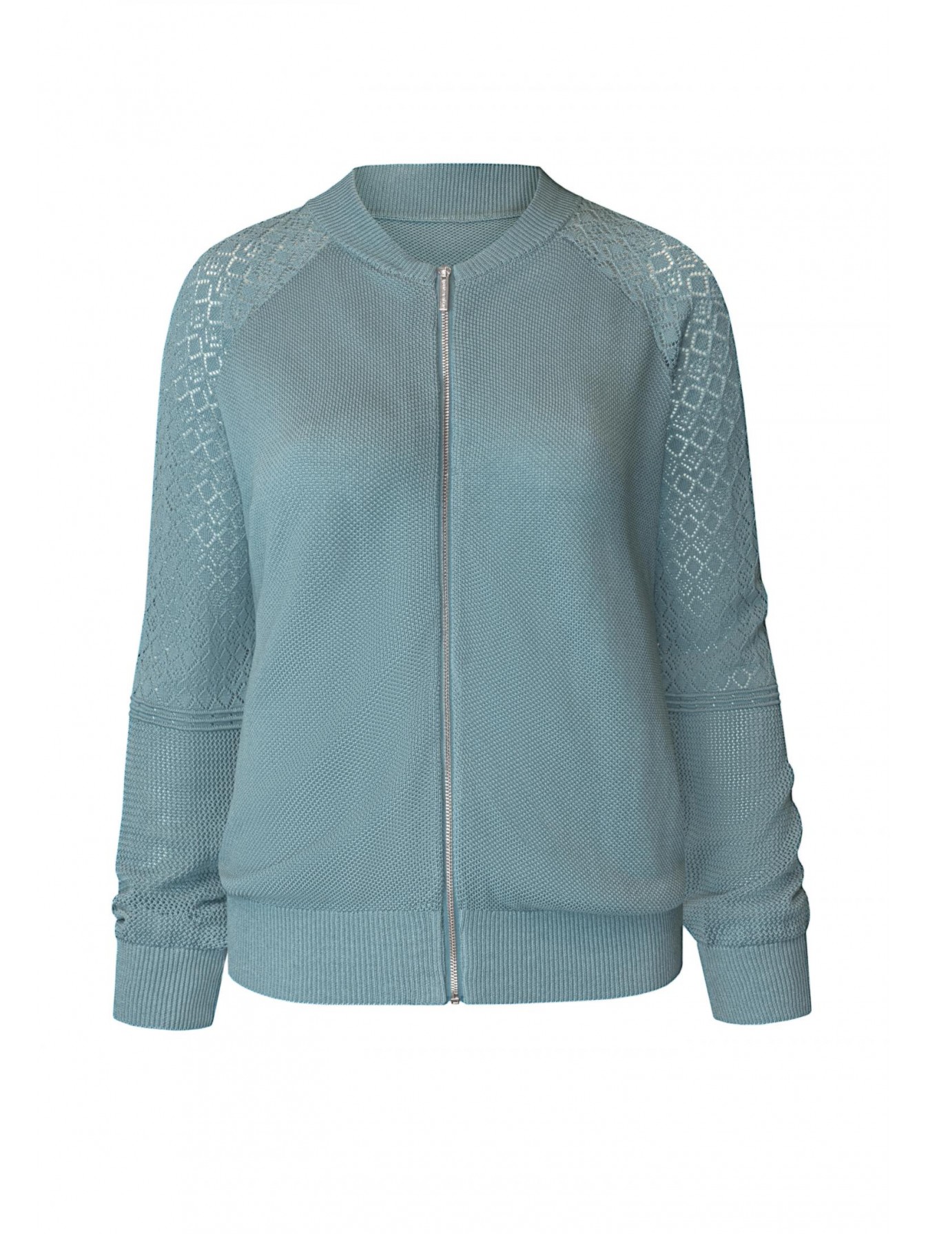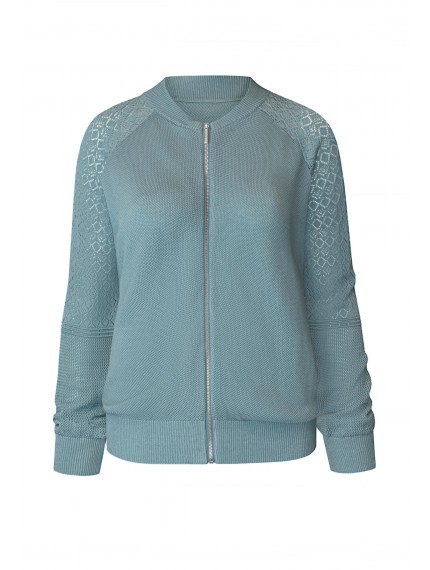 Легкий джемпер на молнии из ажурного трикотажа. Длина до линии бедер. Воротник-стойка. Рукав реглан с ажурной вязкой в верхней части. Манжеты и пояс по низу изделия вывязаны резинкой с фактурным кантом. Оригинальная текстура трикотажного полотна.