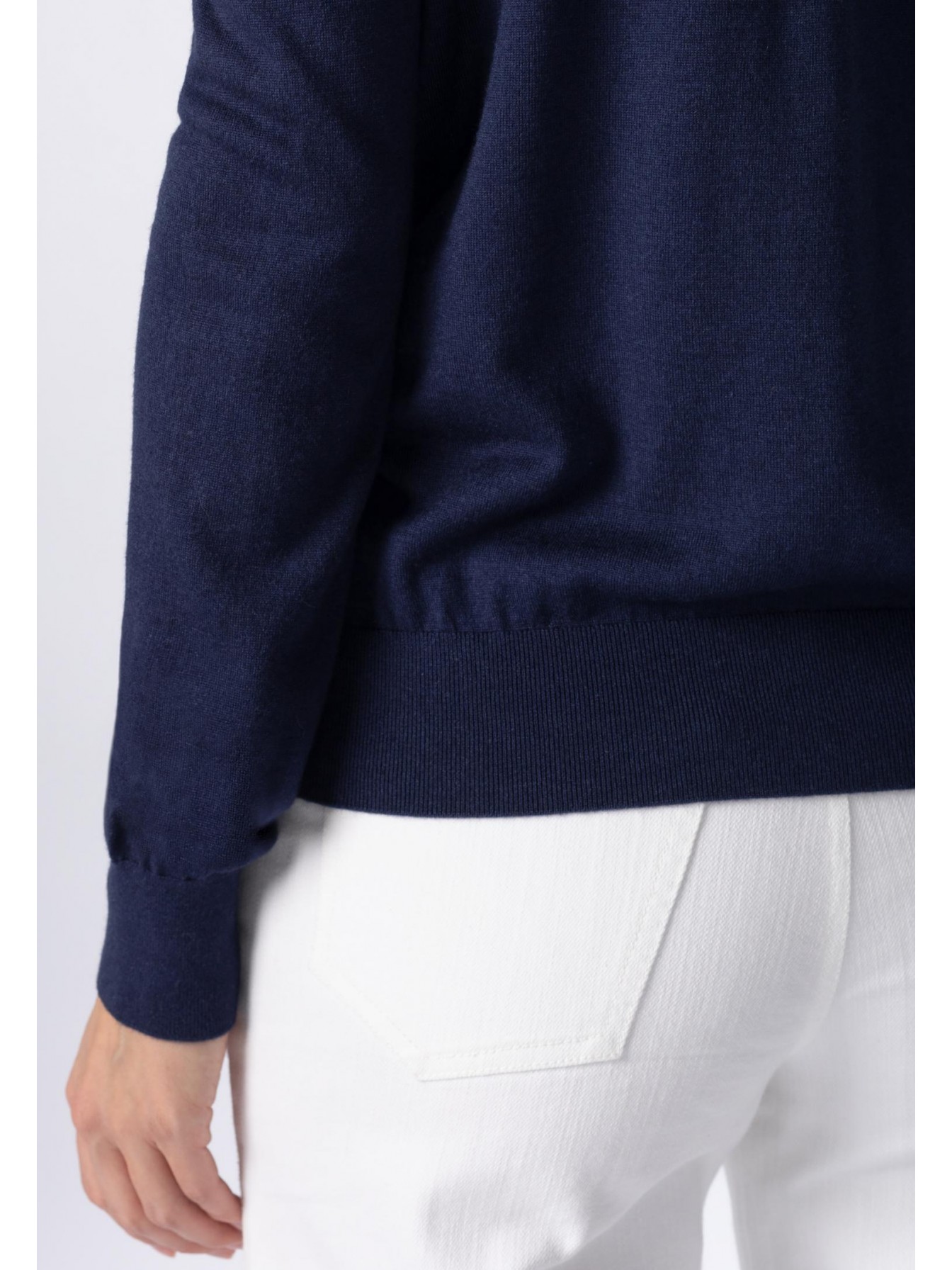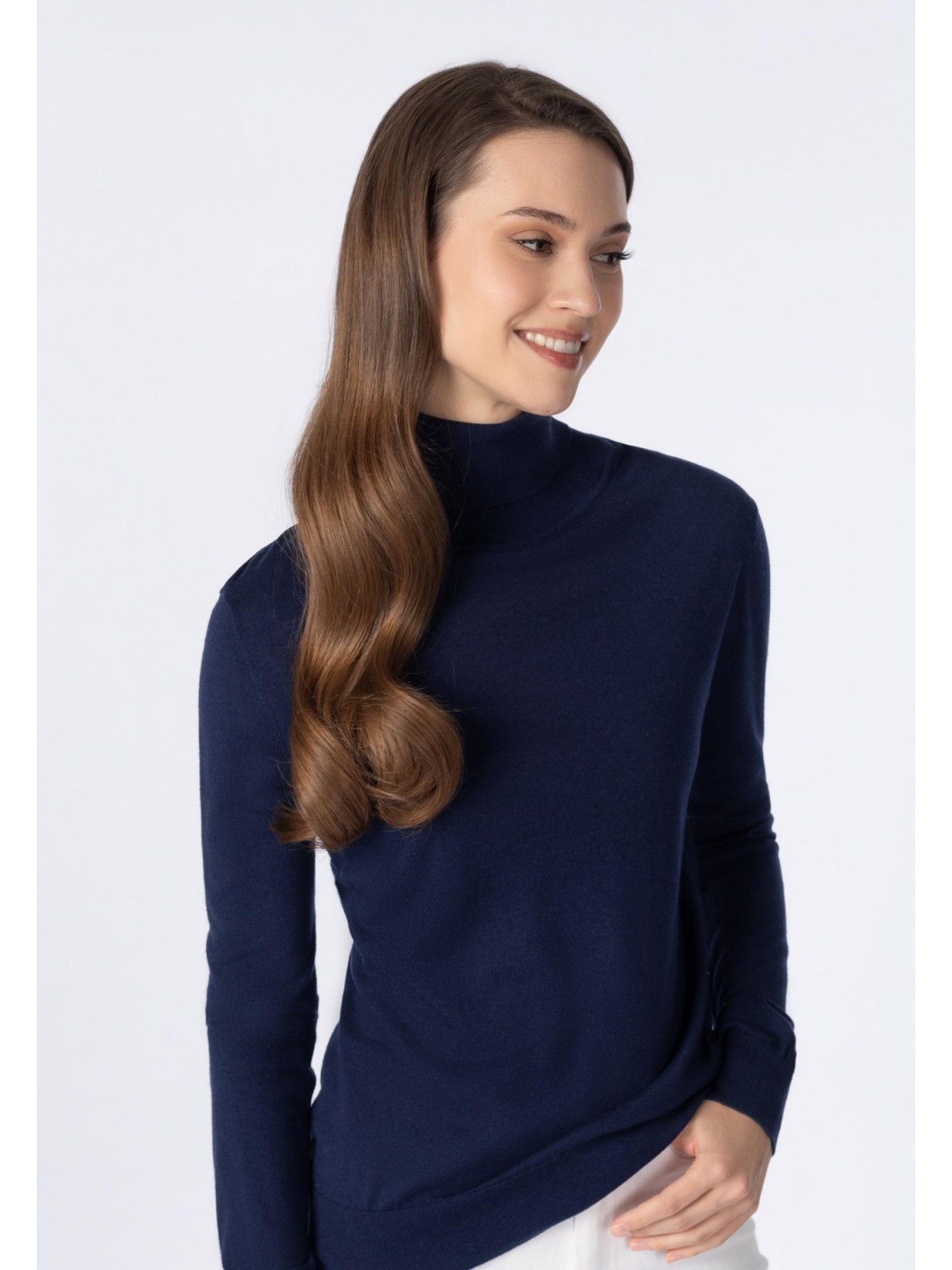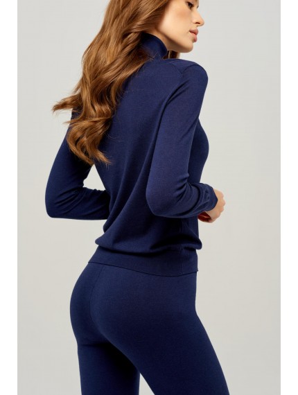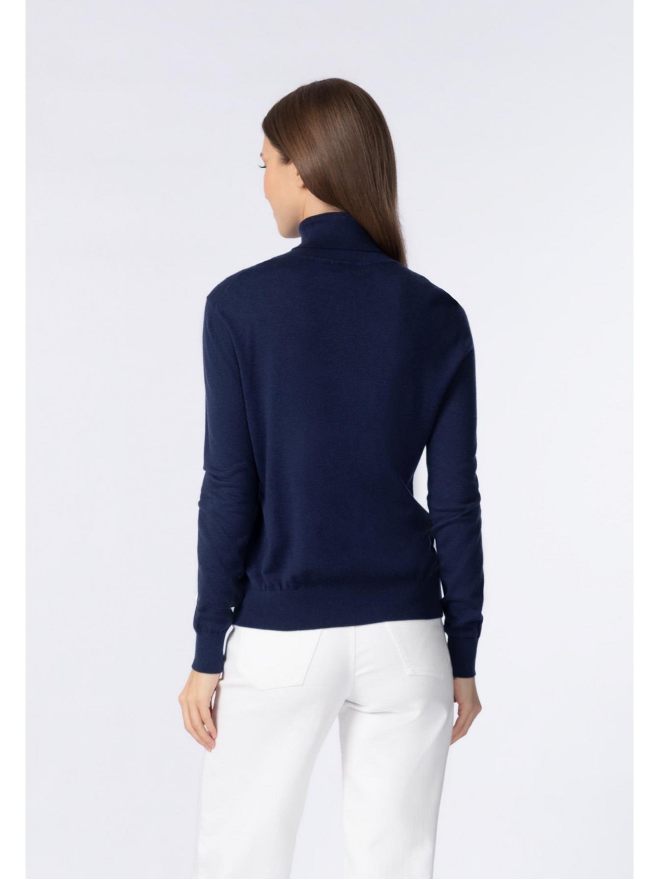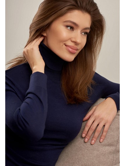 Водолазка полуприлегающего силуэта. Длина до бедер. Воротник-стойка с отворотом. Манжеты и низ оформлены вязаной резинкой.