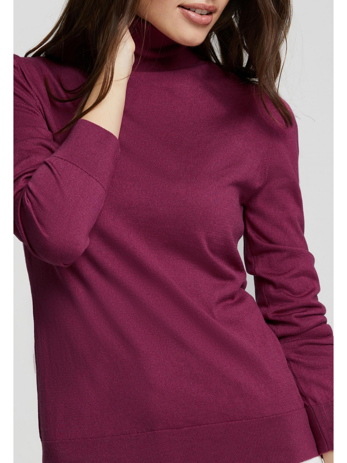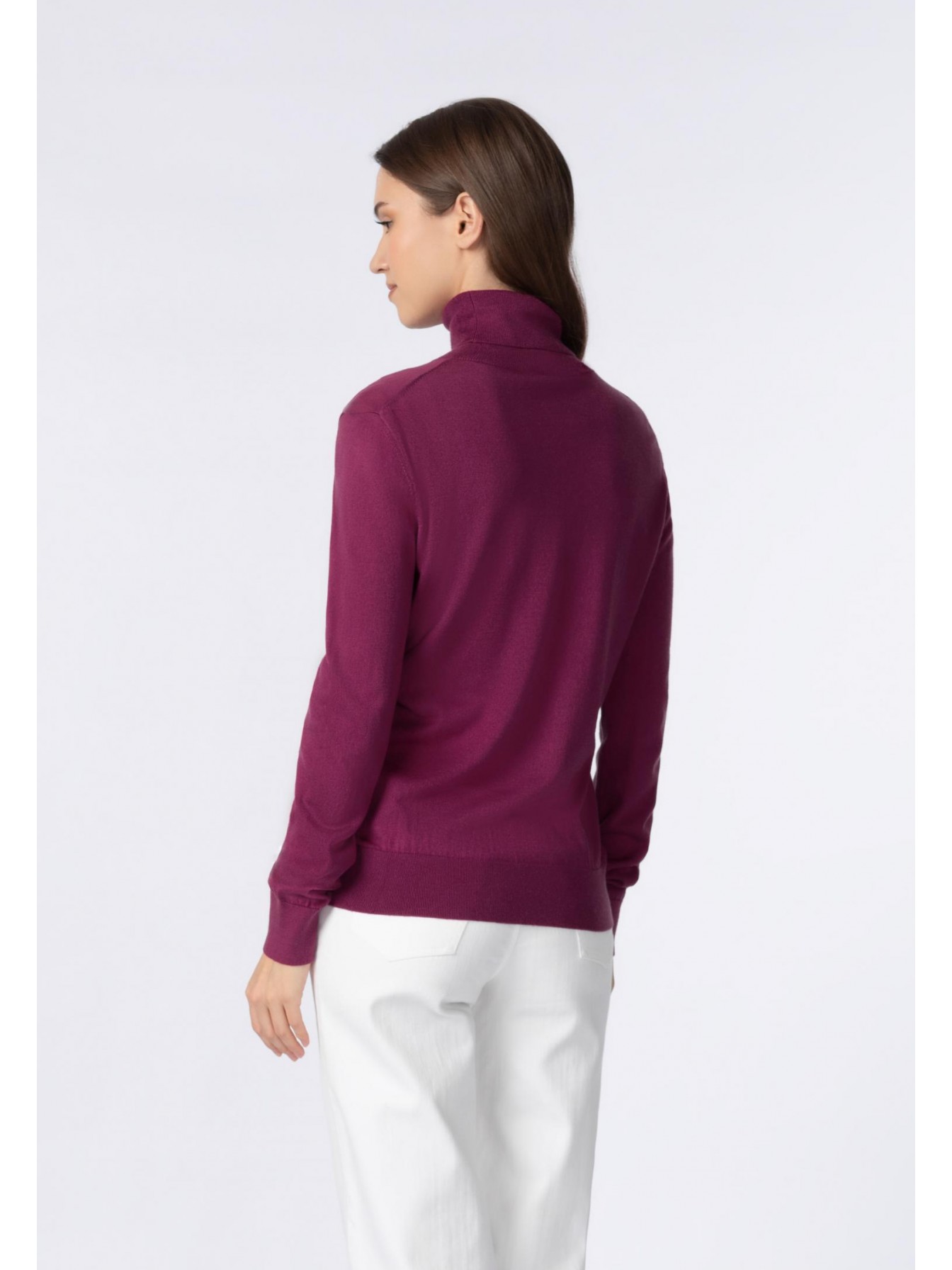 Водолазка полуприлегающего силуэта. Длина до середины бедра. Воротник-стойка с отворотом. Манжеты и низ оформлены вязаной резинкой.