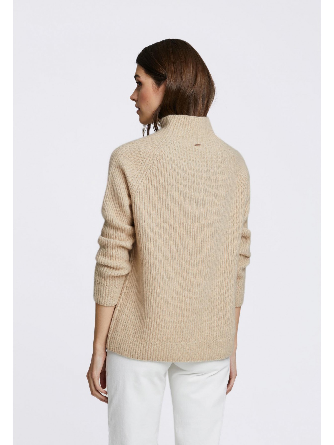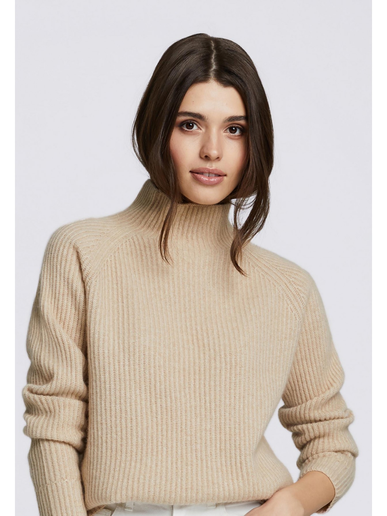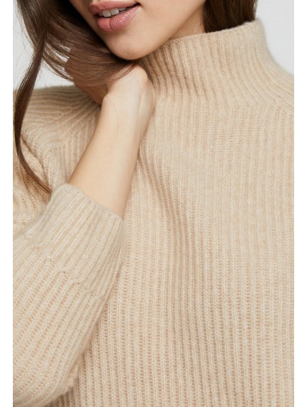 Свитер полуприлегающего силуэта из трикотажа в рубчик. Длина до бедер. Воротник-стойка. Рукав реглан. По низу рукава имитация манжеты за счет оригинального рисунка вязки.
