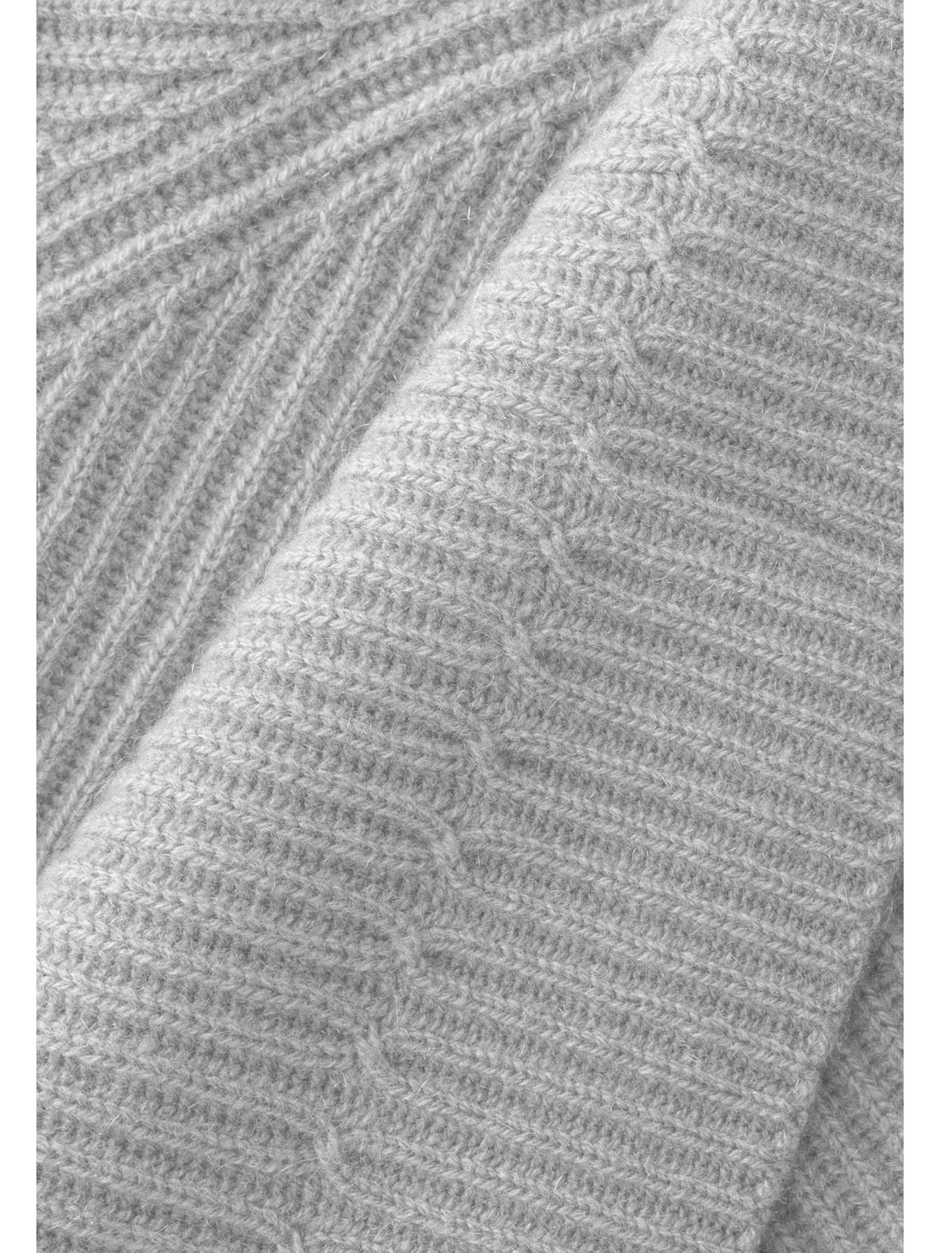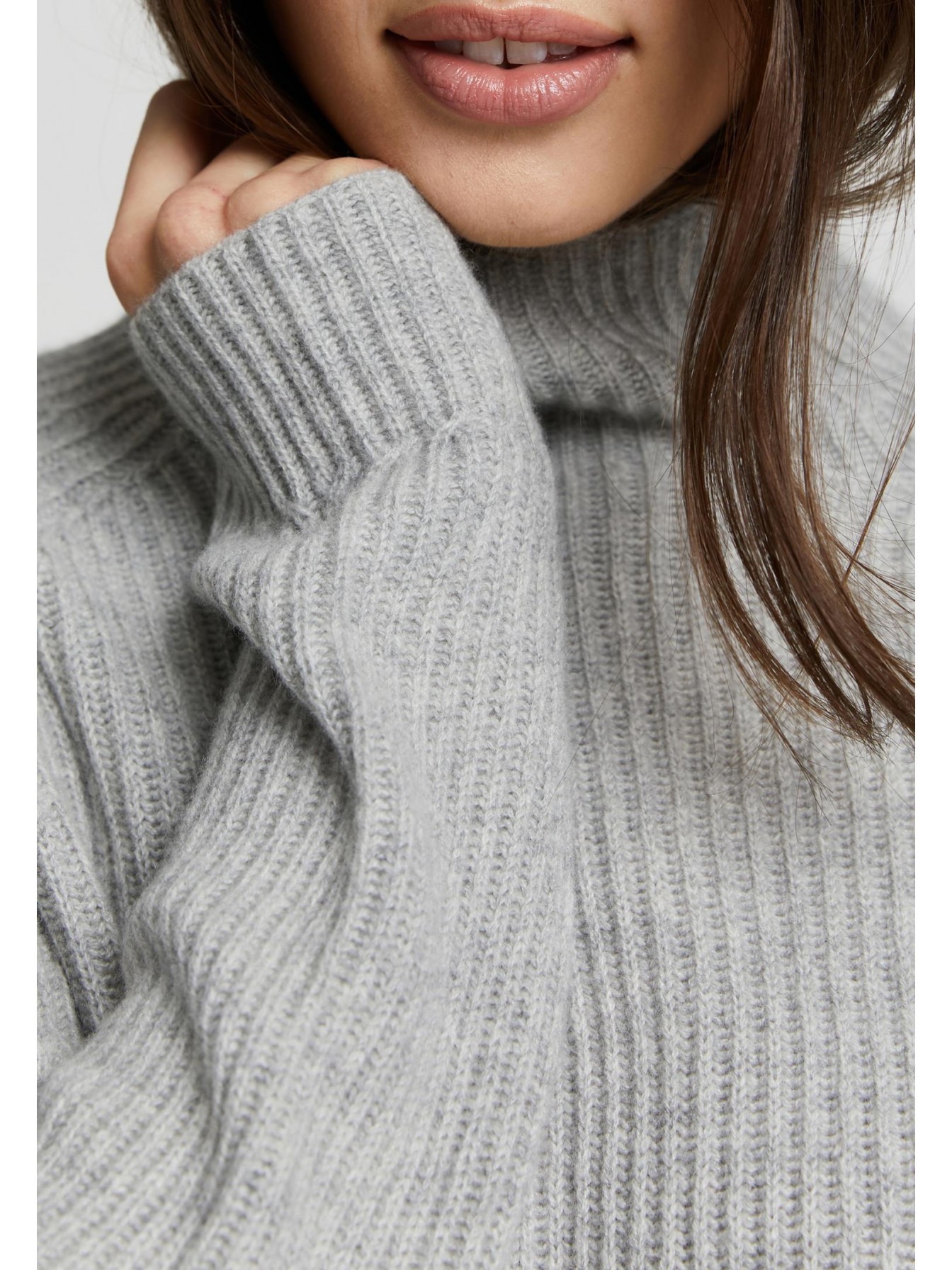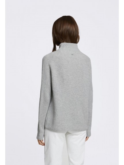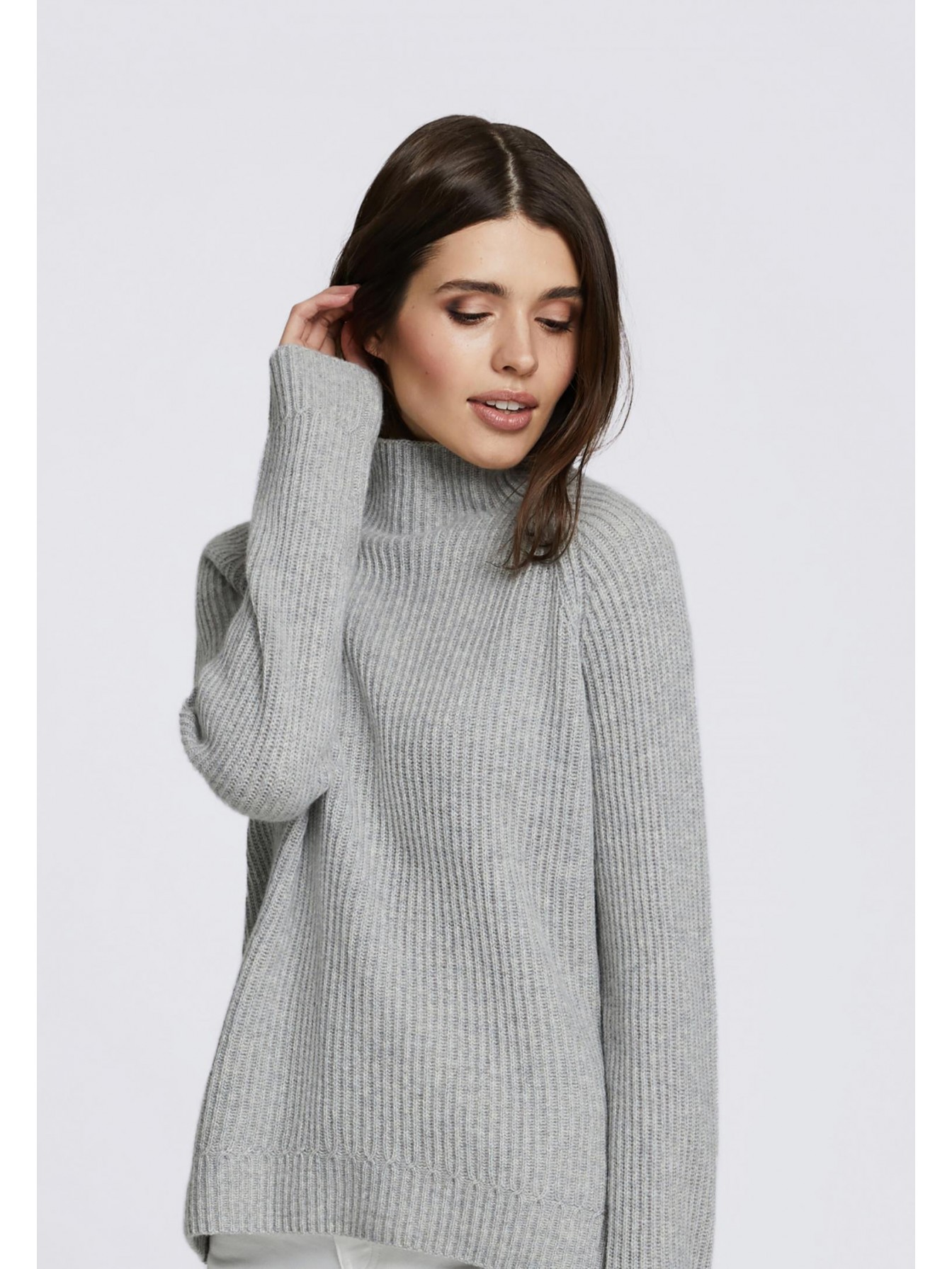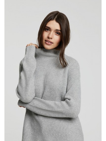 Свитер полуприлегающего силуэта из трикотажа в рубчик. Длина до бедер. Воротник-стойка. Рукав реглан. По низу рукава имитация манжеты за счет оригинального рисунка вязки.