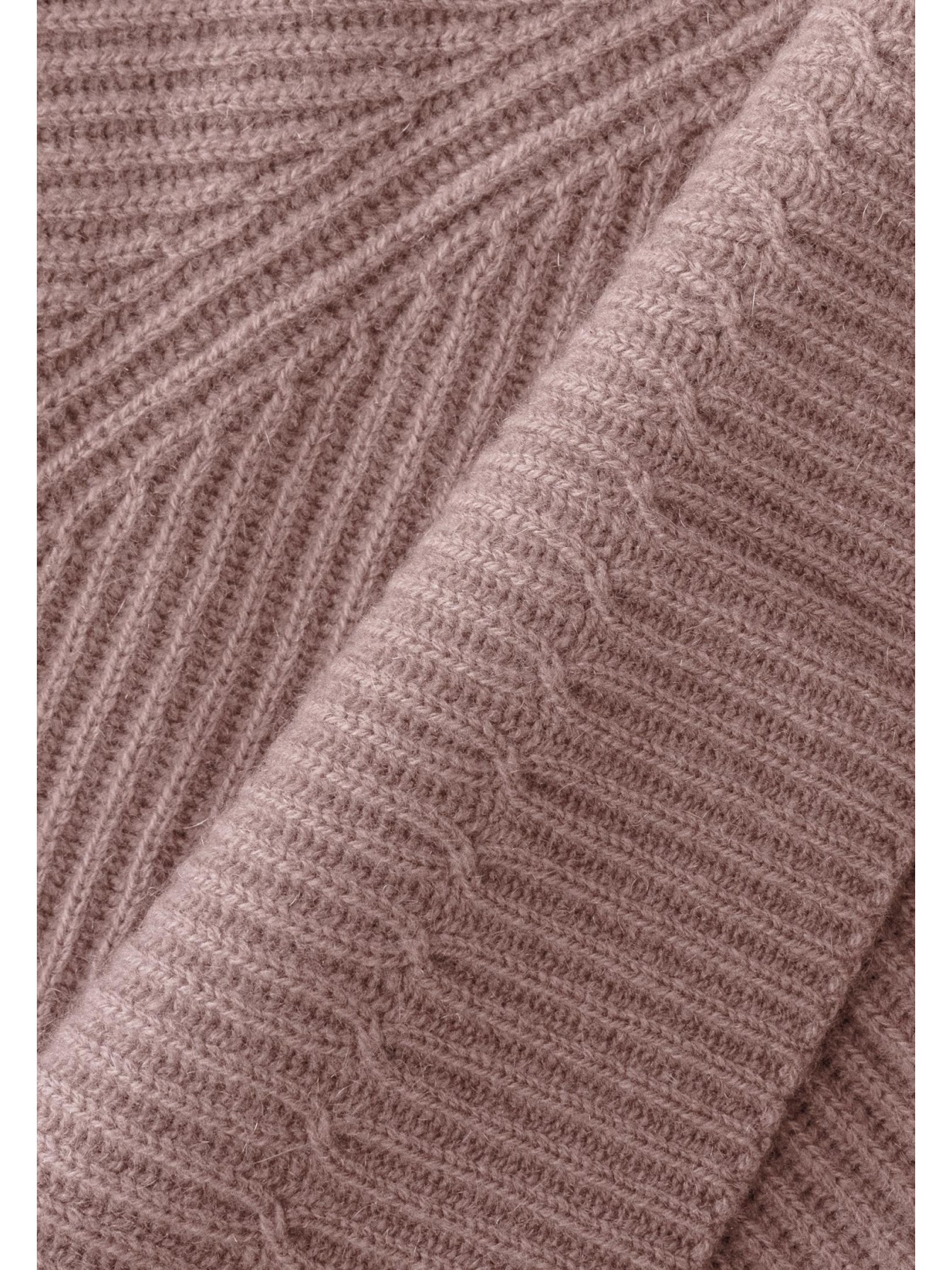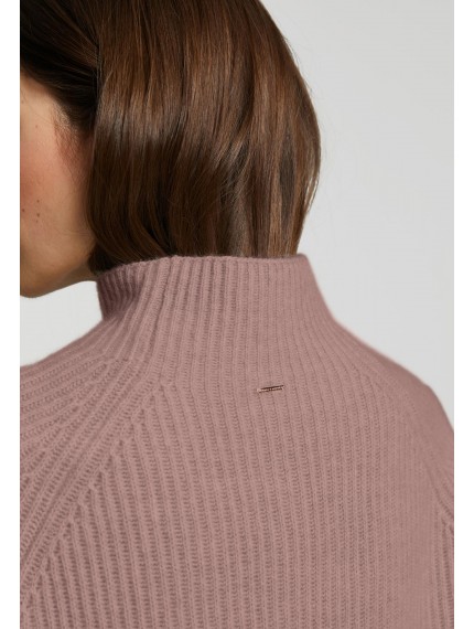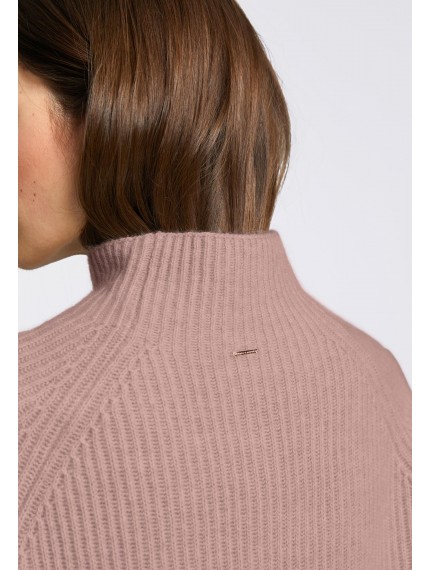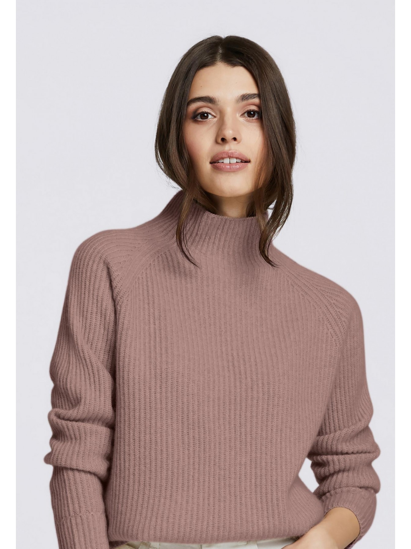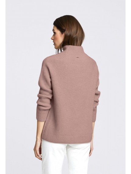 Свитер полуприлегающего силуэта из трикотажа в рубчик. Длина до середины бедра. Воротник-стойка. Рукав реглан. По низу рукава имитация манжеты за счет оригинального рисунка вязки.