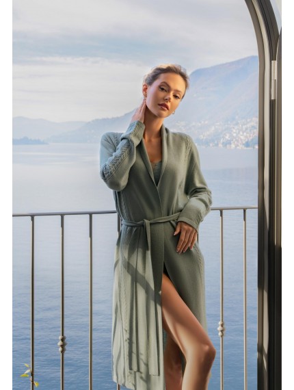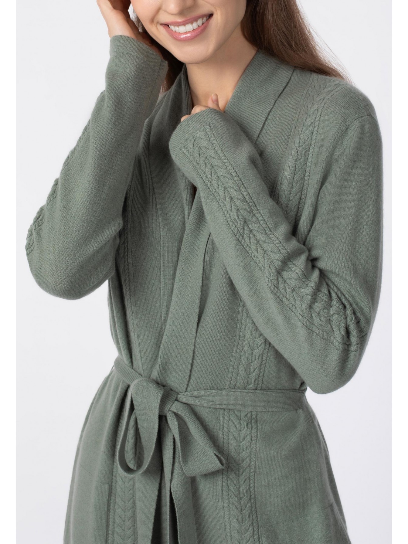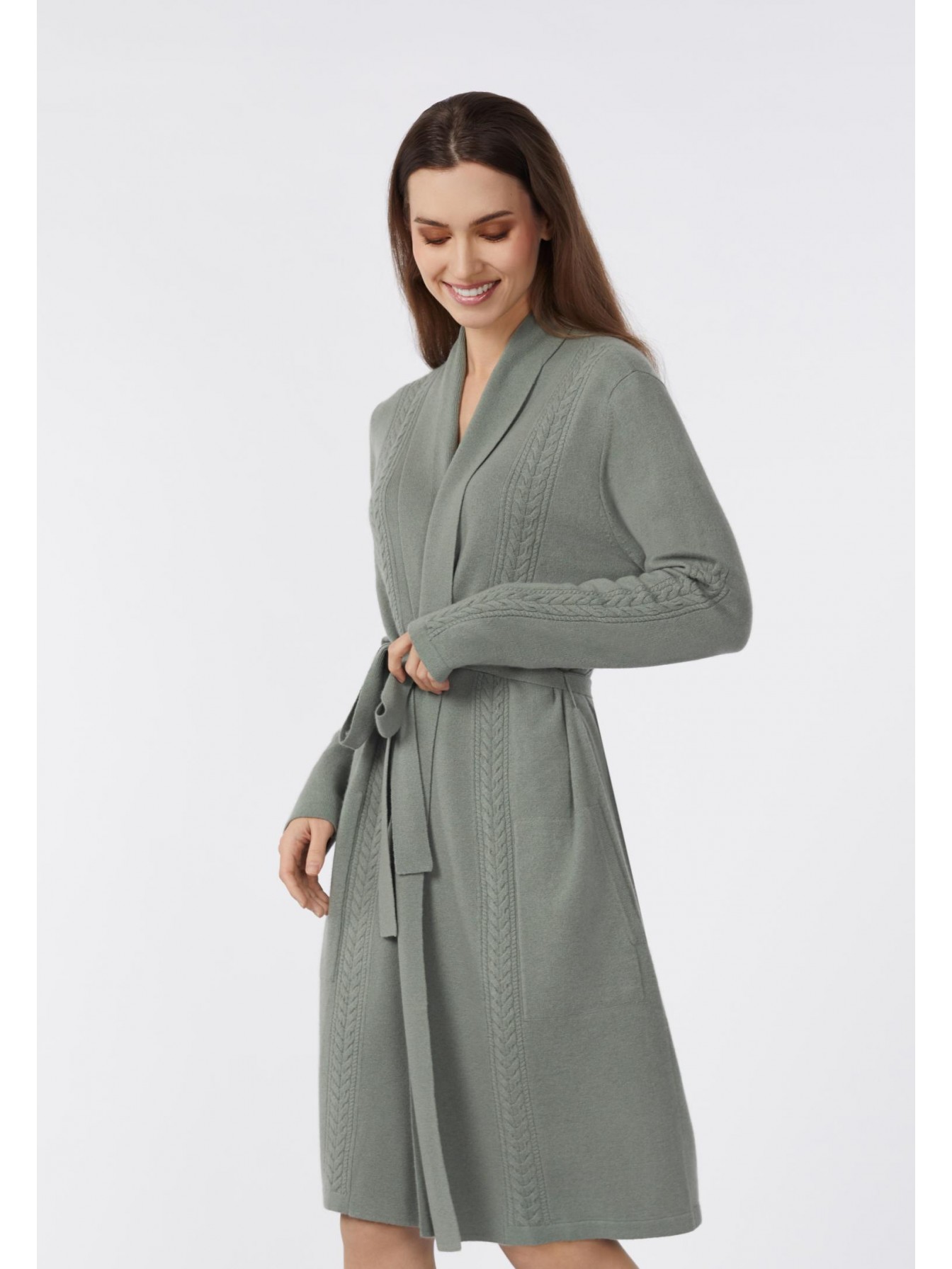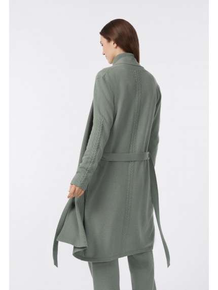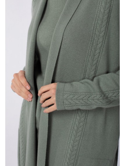 Кардиган свободного прямого кроя. Пояс в комплекте. Длина чуть выше уровня колен. Накладные карманы спереди. Отделка косами по центру рукава до плеча, по центру полочки и задней детали. Воротник-шалька.