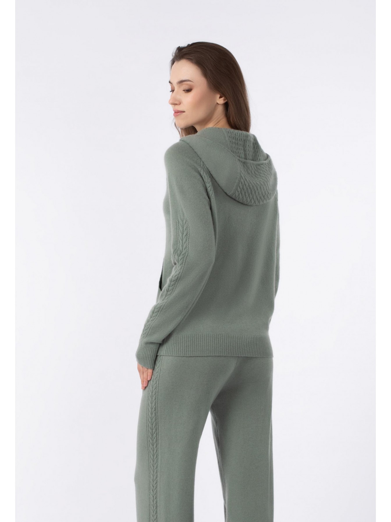Джемпер на молнии с капюшоном. Длина до линии бедер. Спереди карманы. Отделка косами по линии реглана, по центру рукава до плеча, по центру капюшона. Манжеты и низ изделия оформлены вязаной резинкой.