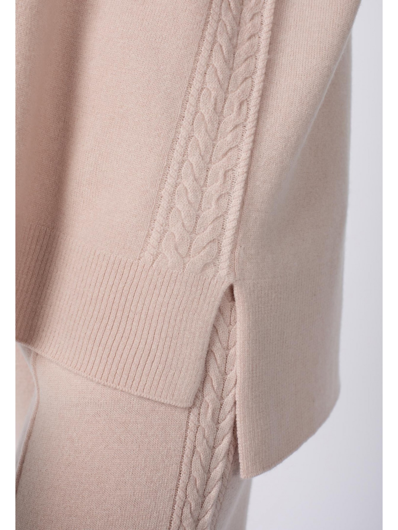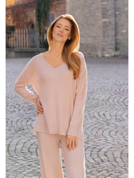 Джемпер с V-образным вырезом. Длина до середины бедра. Отделка косами по центру рукава до плеча, по бокам и по центру спинки. Манжеты и низ изделия оформлены вязаной резинкой.