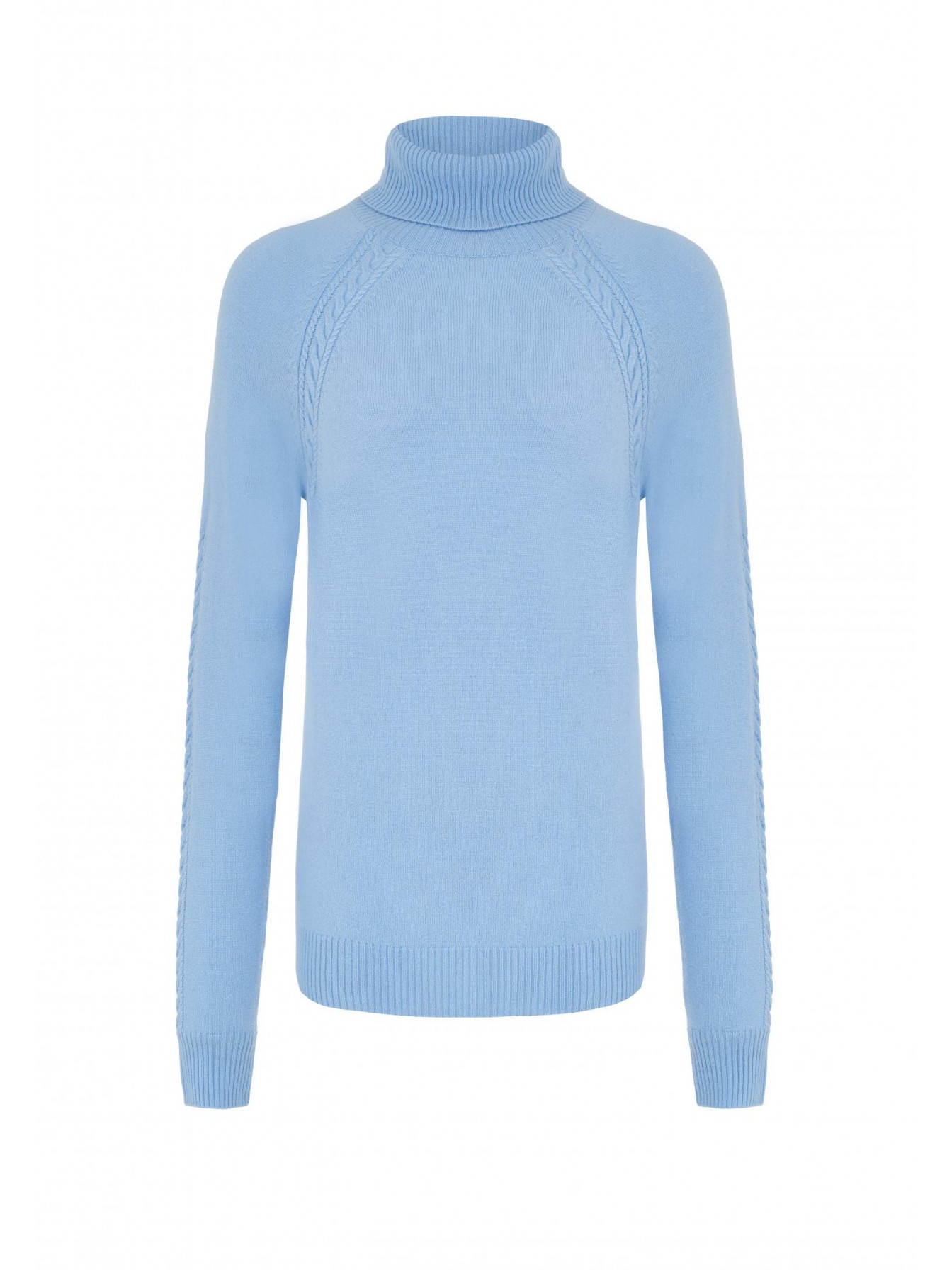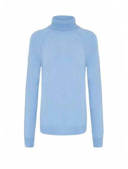 Свитер-водолазка полуприлегающего силуэта. Длина до середины бедра. Воротник-стойка с отворотом. Манжеты и низ изделия оформлены вязаной резинкой. Отделка косами по линии реглана и по центру рукава до плеча.