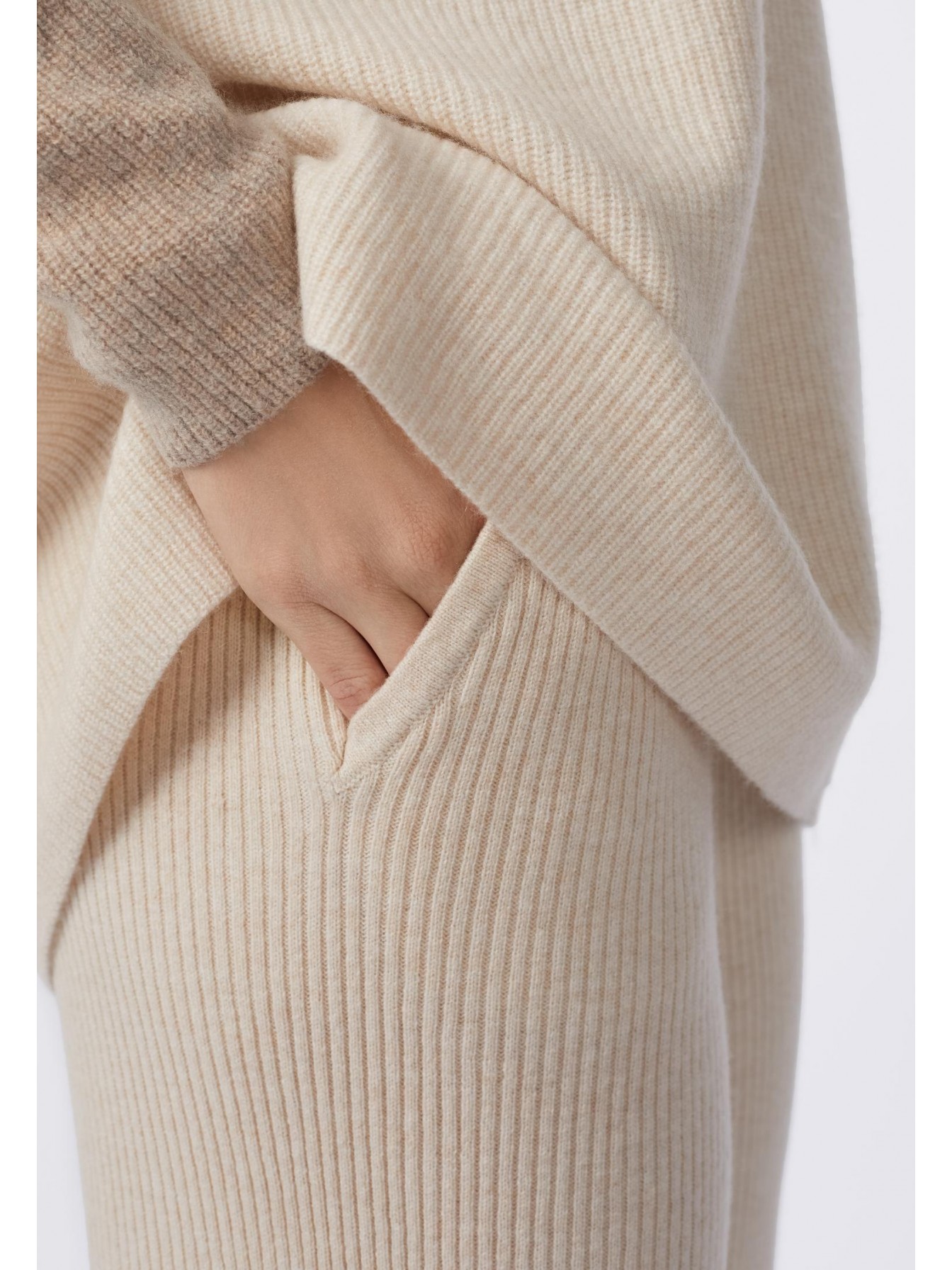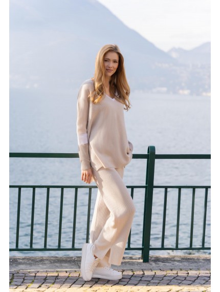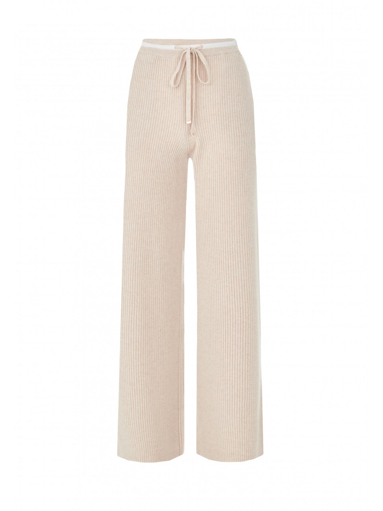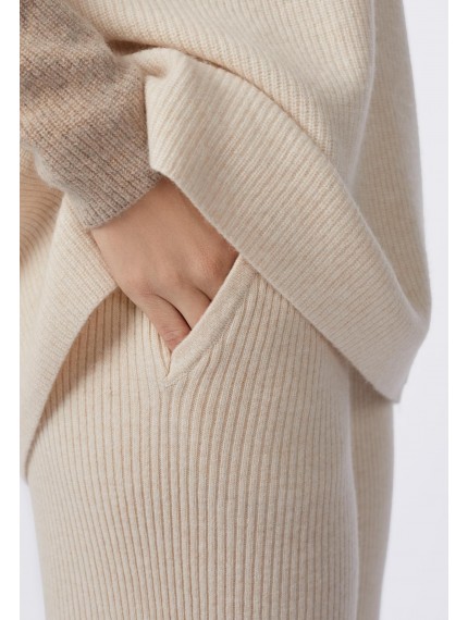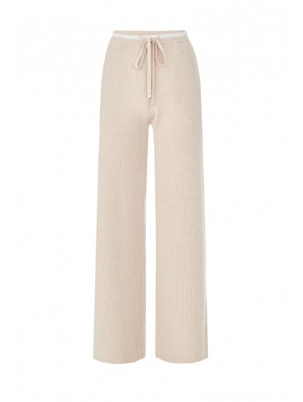 Брюки свободного кроя из трикотажа в рубчик. Легкий клеш. По бокам небольшие разрезы. Эластичный пояс со шнуром. Боковые карманы.