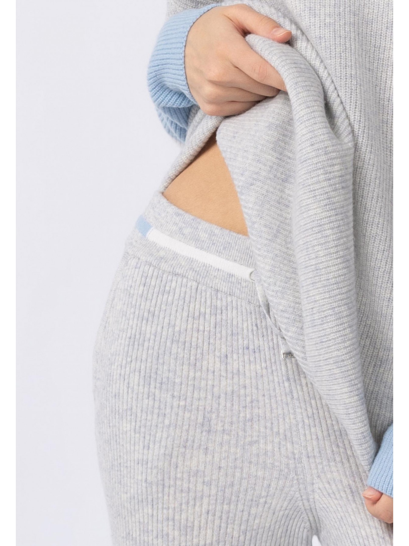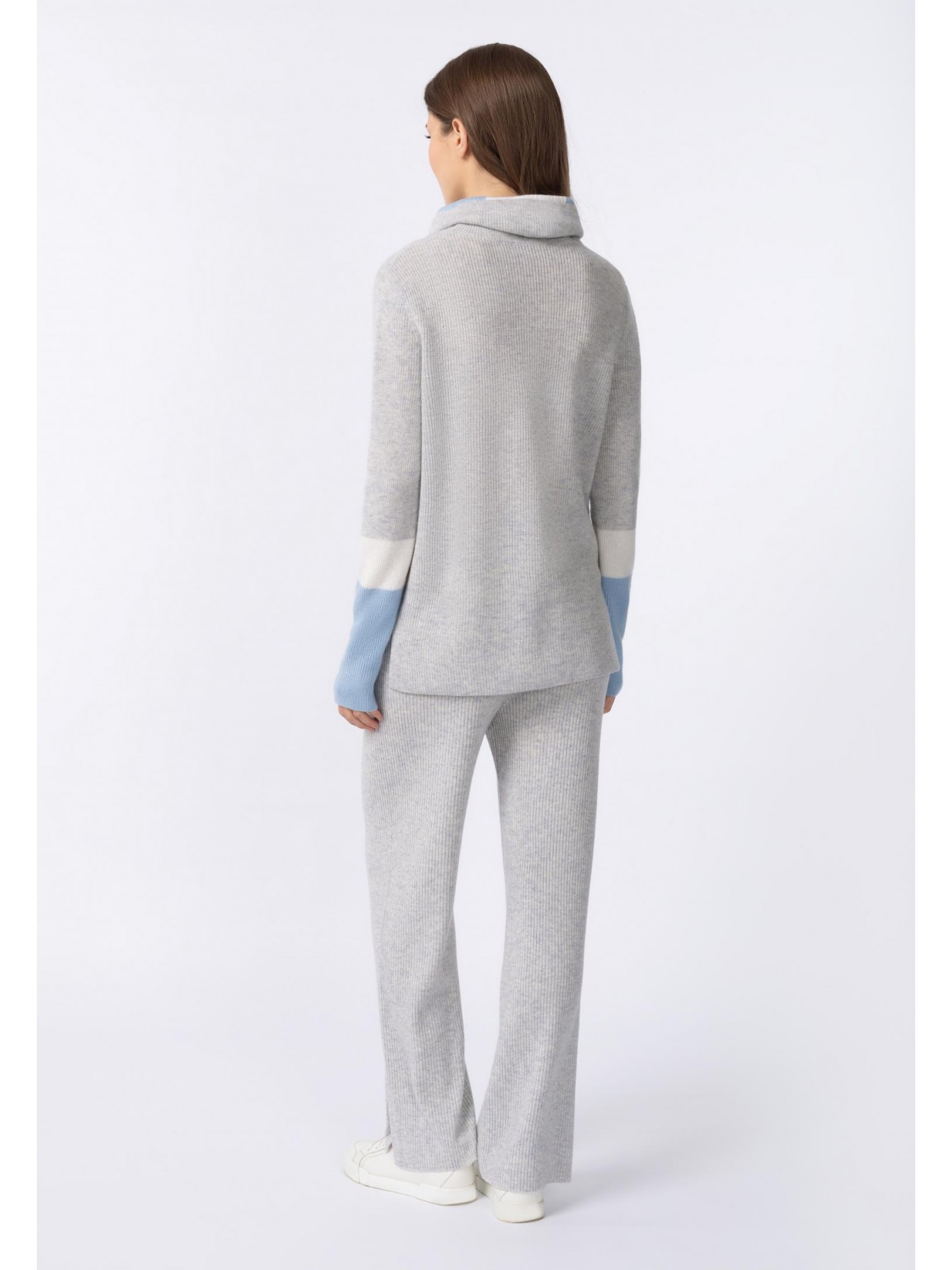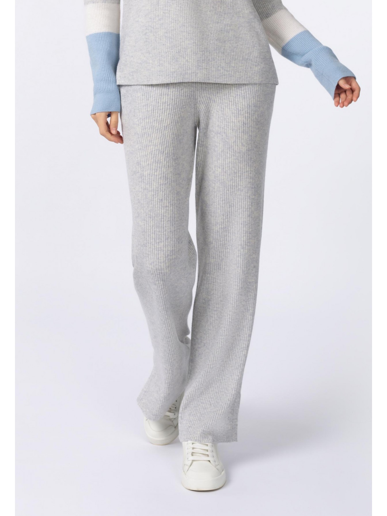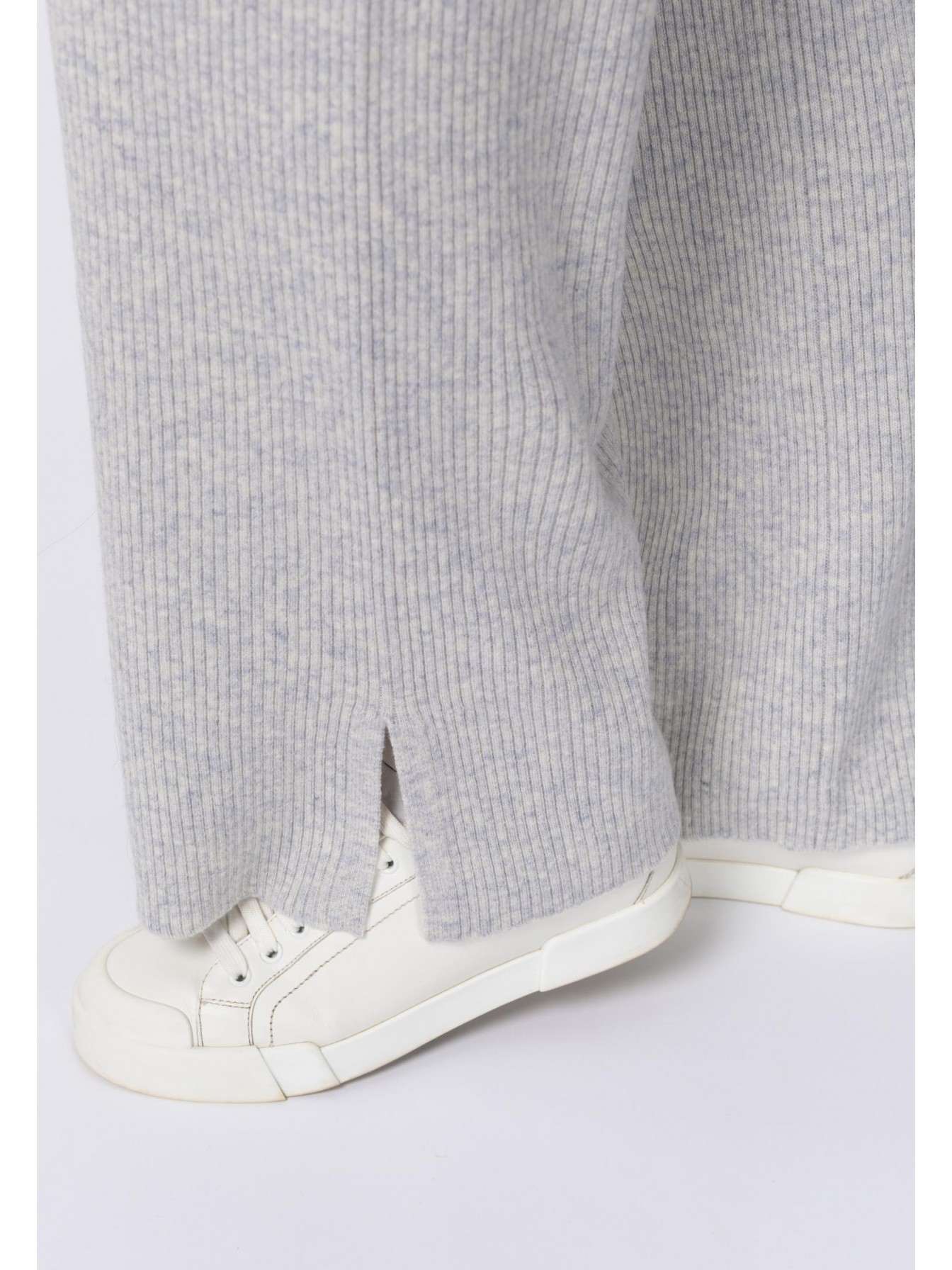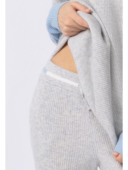 Брюки свободного кроя из трикотажа в рубчик. Легкий клеш. По бокам небольшие разрезы. Эластичный пояс со шнуром. Боковые карманы.