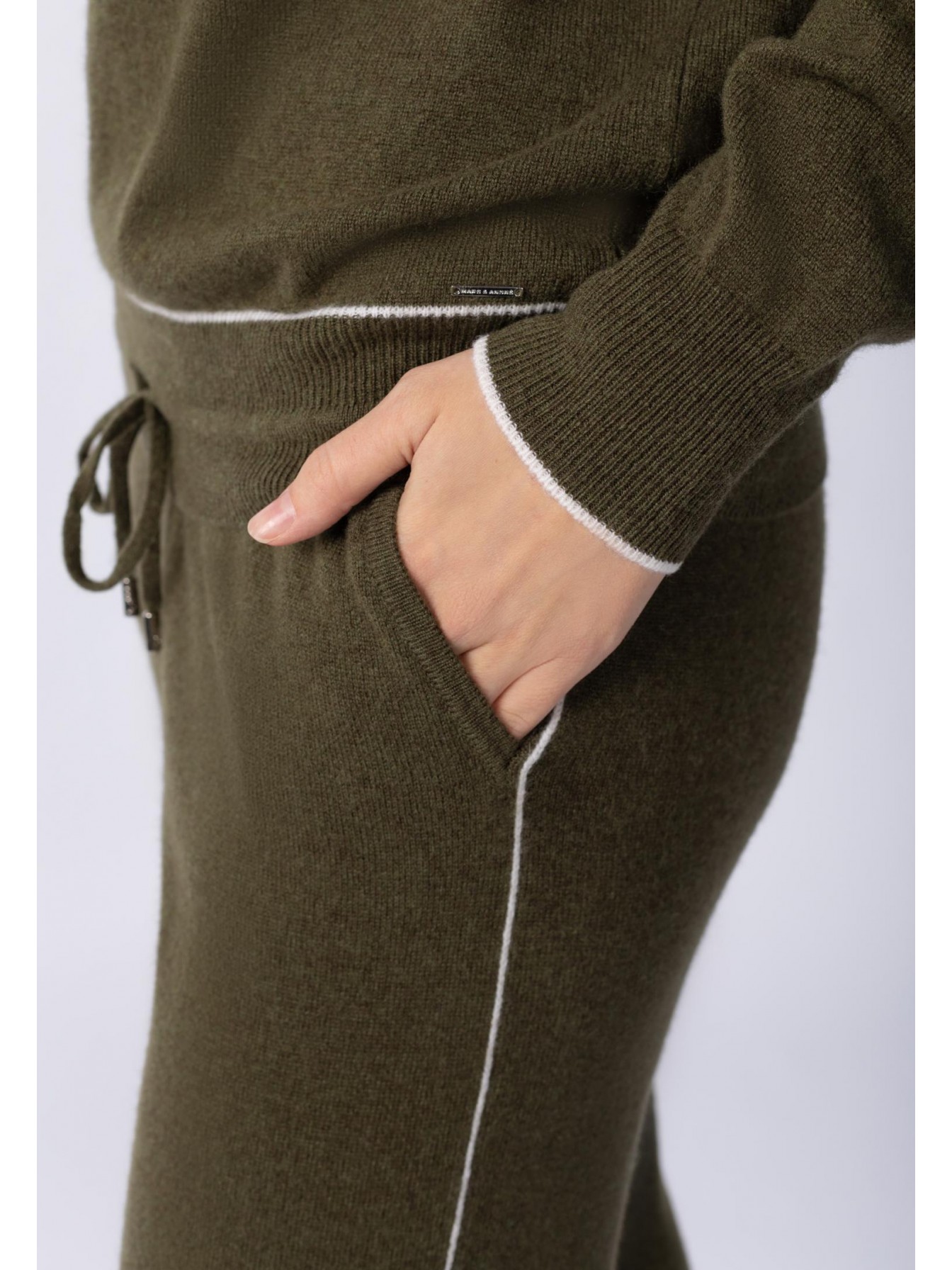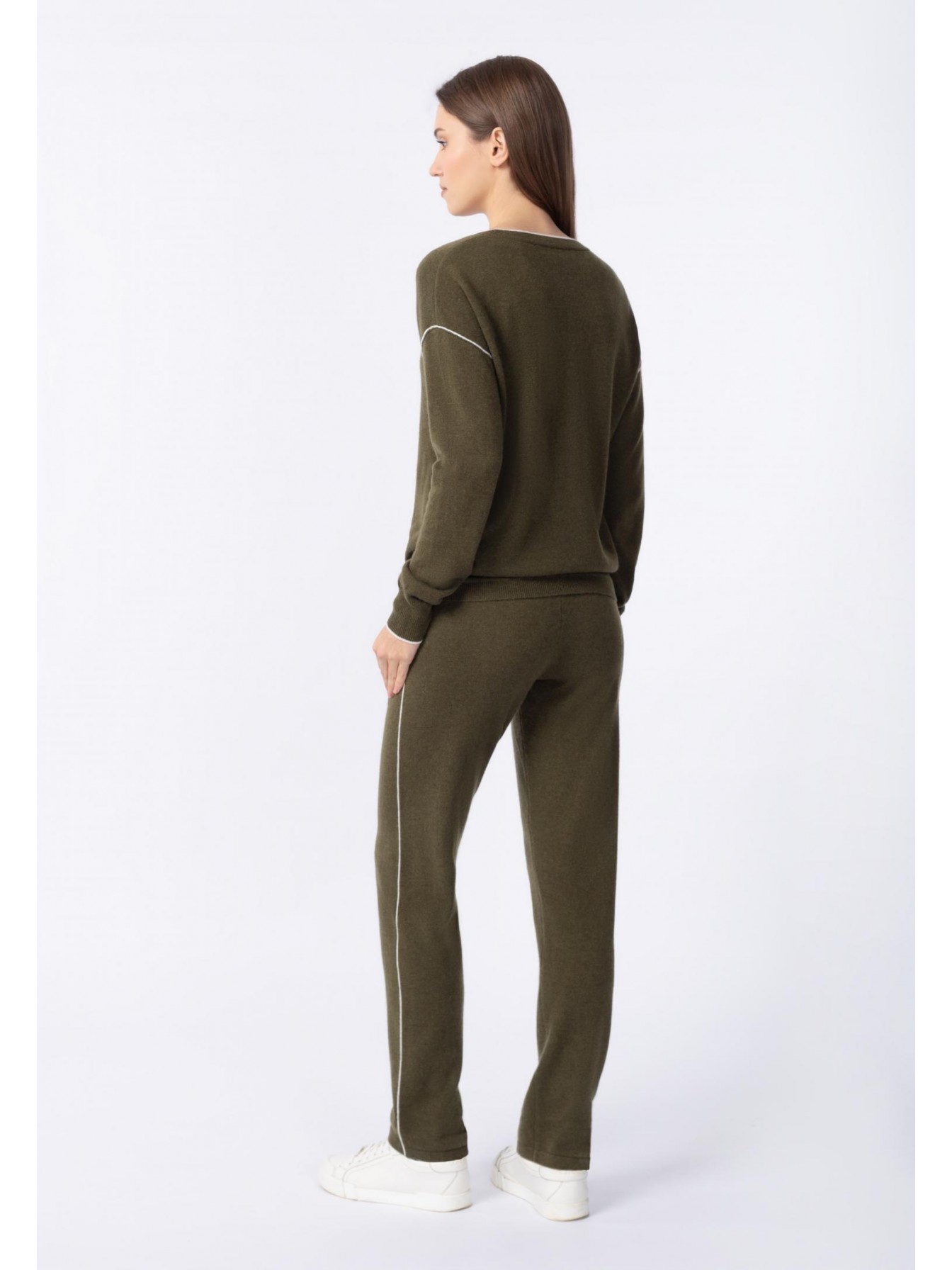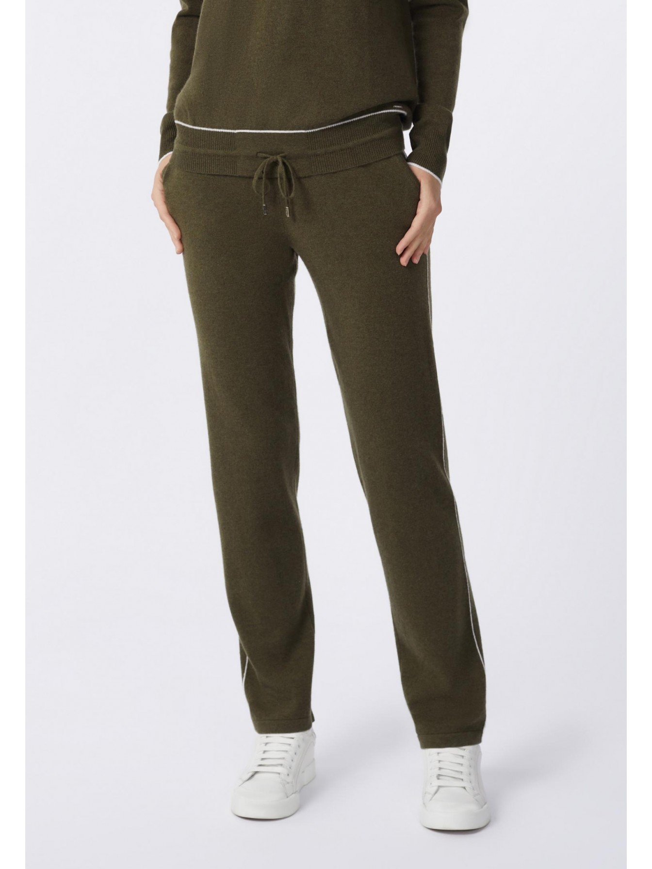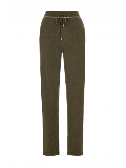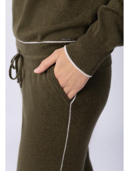 Брюки, слегка зауженные книзу. Пояс на резинке со шнуром. Боковые карманы. По бокам и на поясе тонкая контрастная окантовка в виде изящной косички.