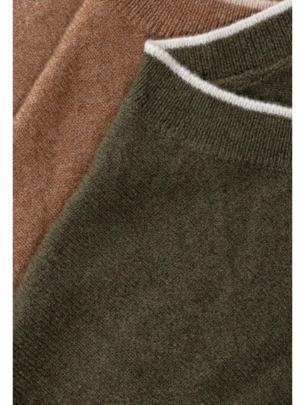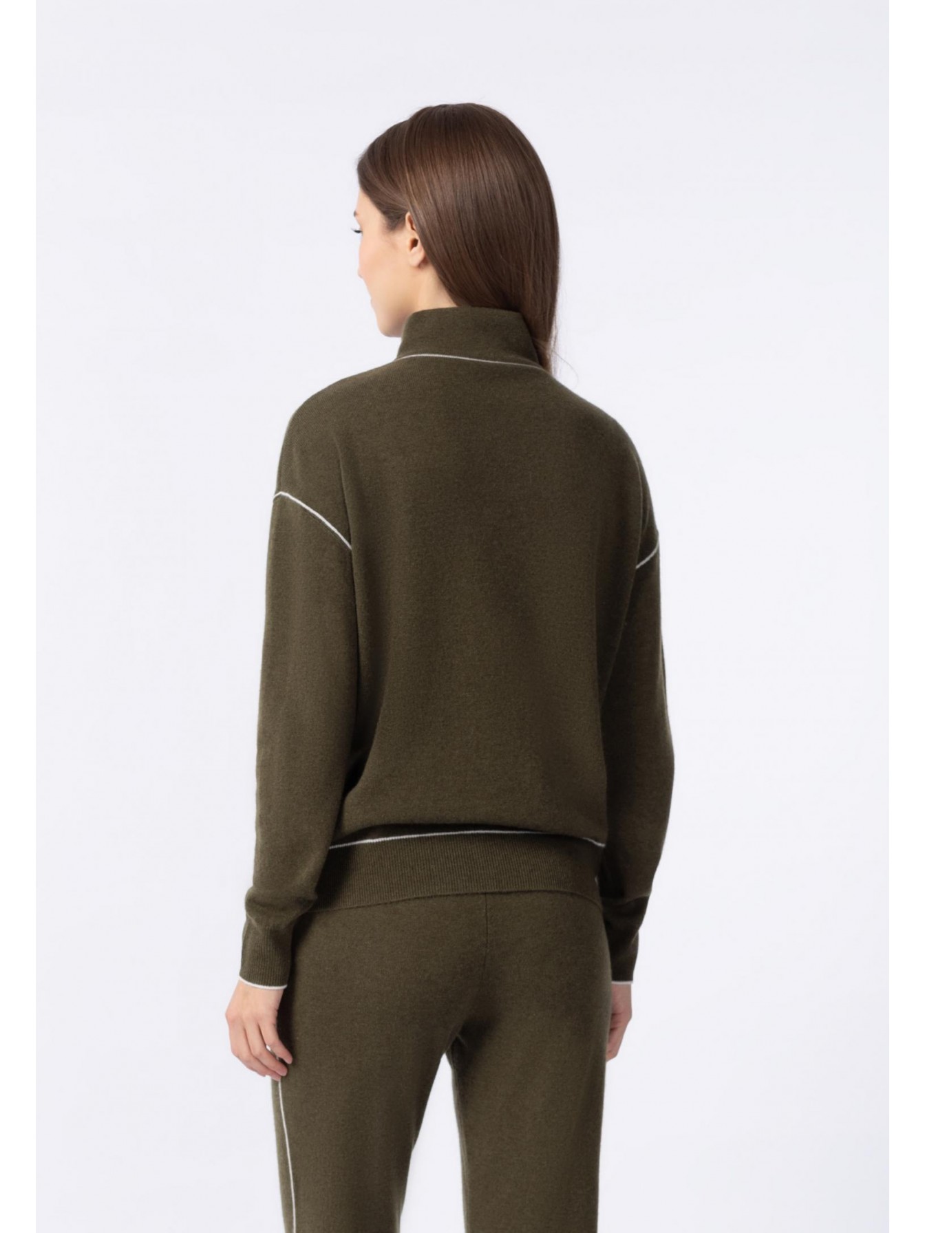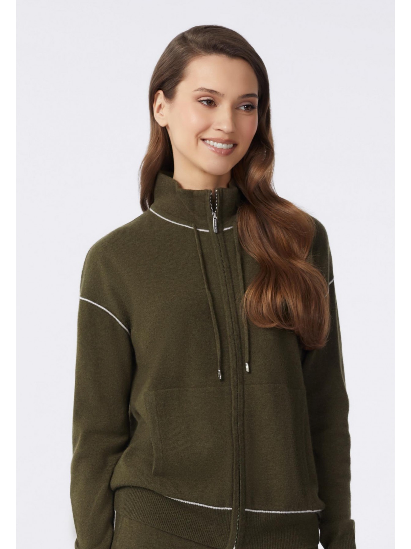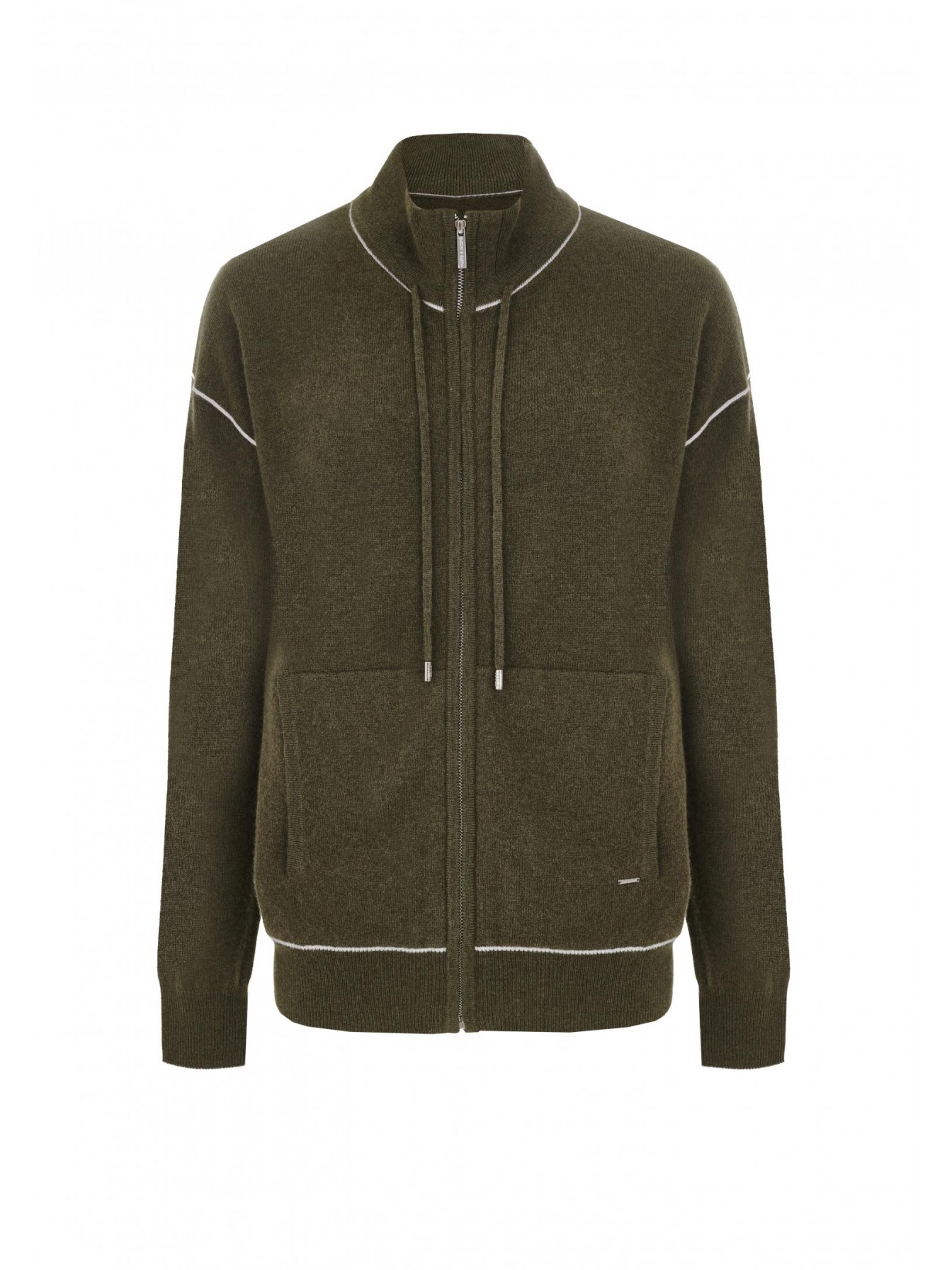 Джемпер на молнии с воротником-стойкой. Шнур по основанию воротника. Длина до линии бедер. Спереди карманы. Низ рукава и манжеты оформлены вязаной резинкой с контрастным кантом. Контрастный кант в вариативном исполнении по основанию воротника и по линии проймы.