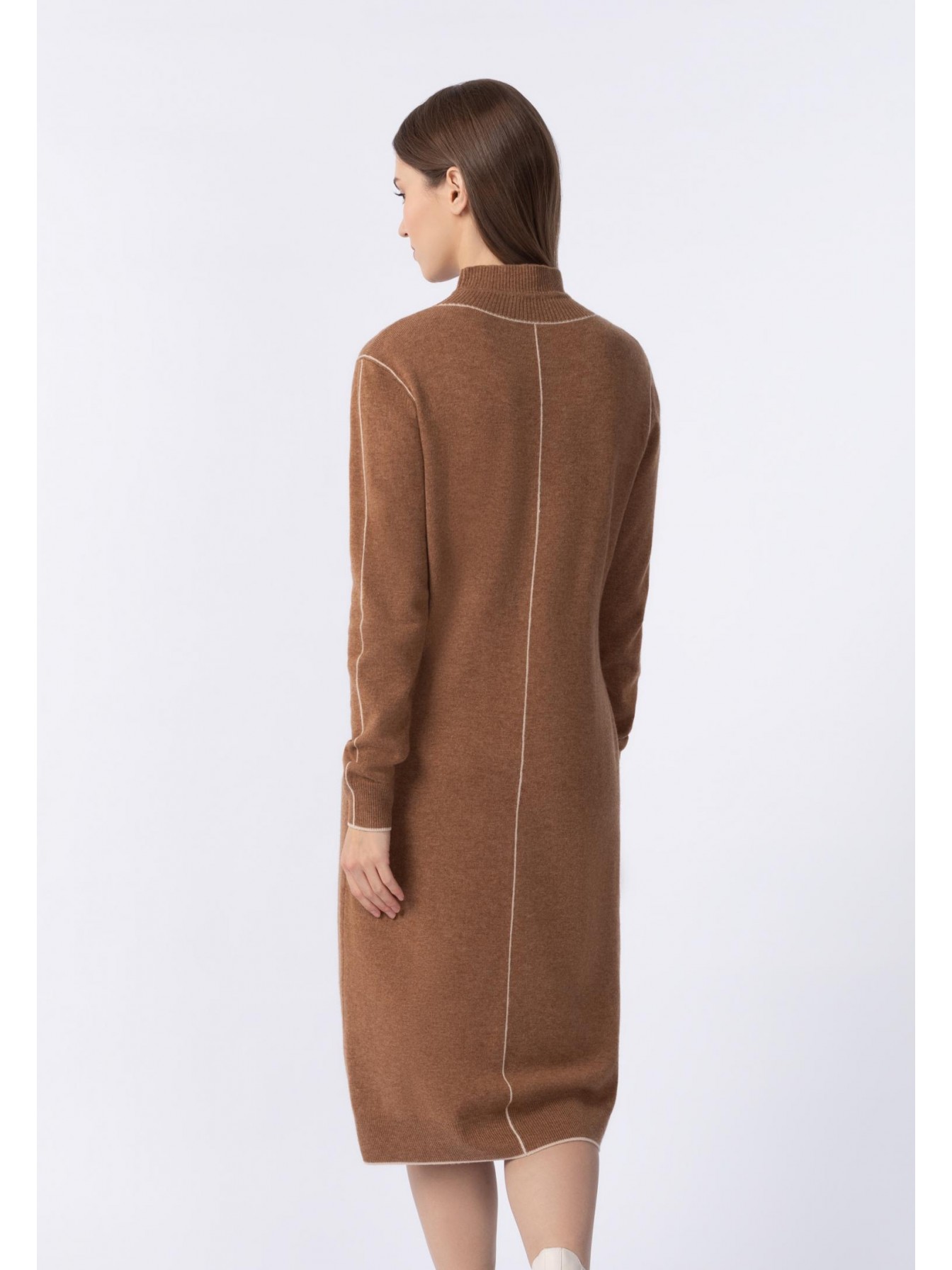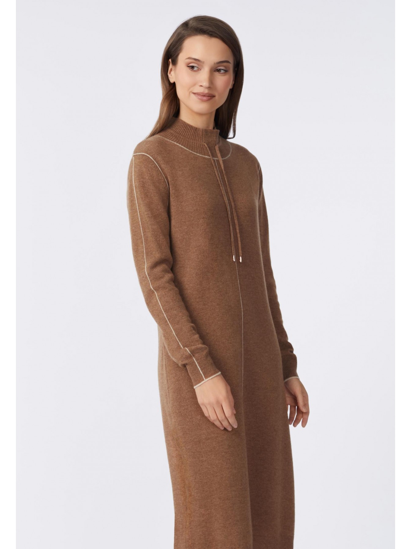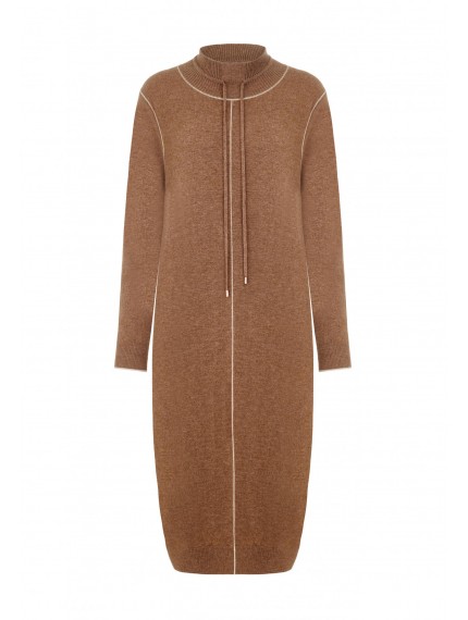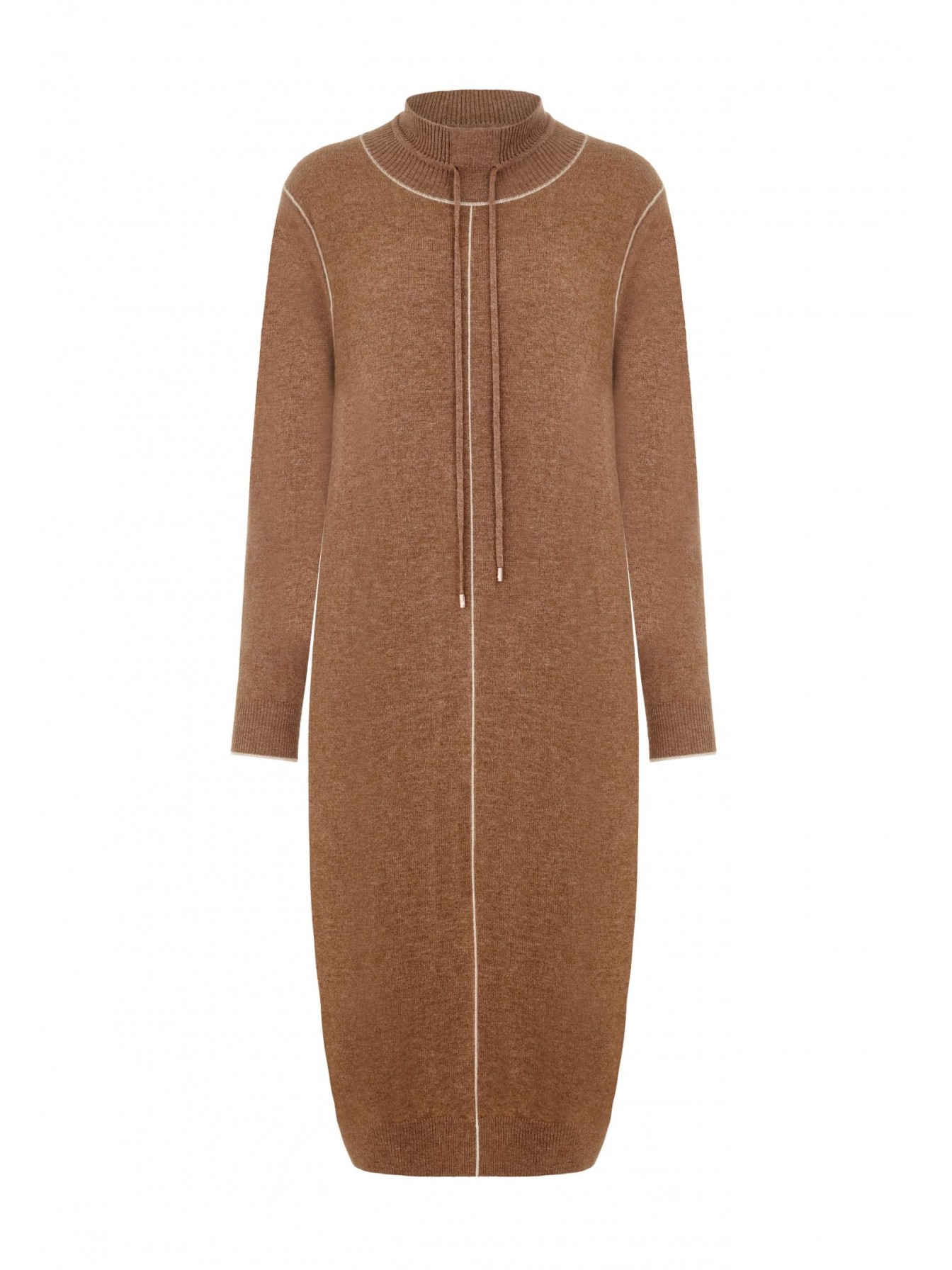 Платье полуприлегающего силуэта. Воротник-стойка со шнуром. Длина чуть ниже уровня колена. Низ изделия, горловина и манжеты оформлены вязаной резинкой с контрастным кантом. По центру передней и задней детали и по линии проймы контрастный кант в виде изящной косички.