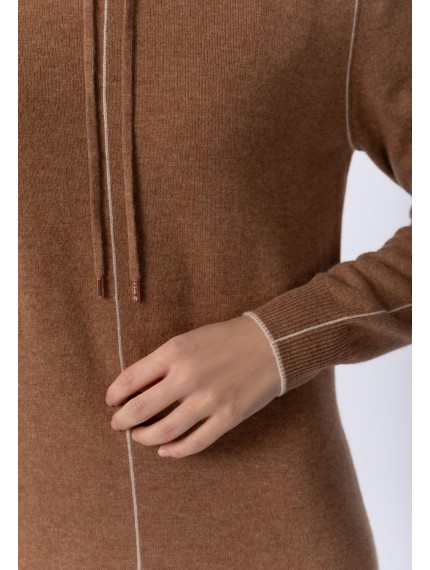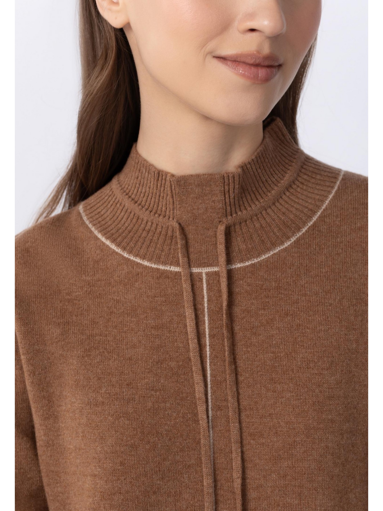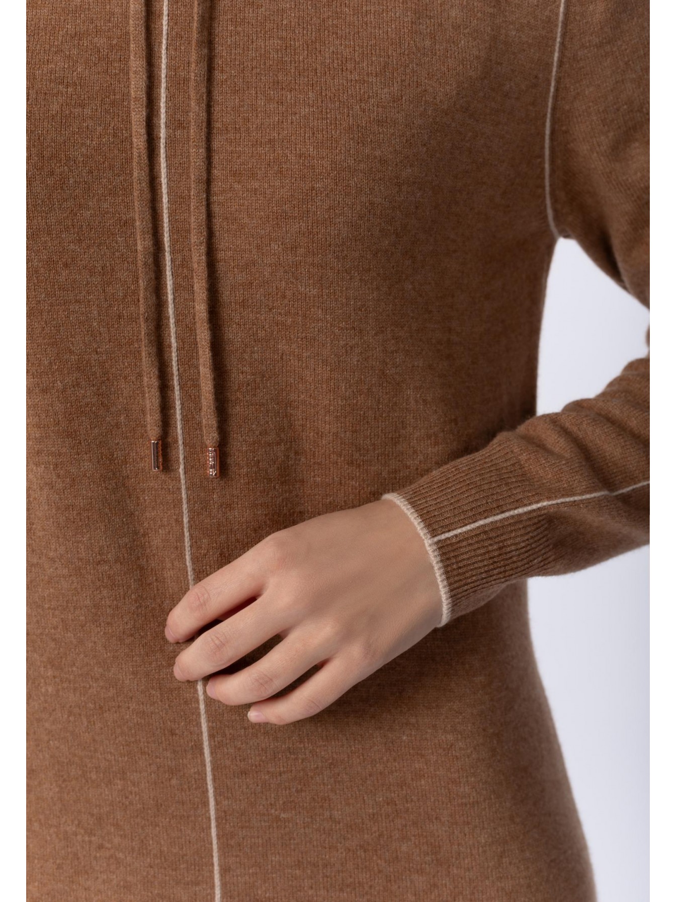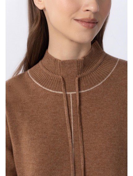 Платье полуприлегающего силуэта. Воротник-стойка со шнуром. Длина чуть ниже уровня колена. Низ изделия, горловина и манжеты оформлены вязаной резинкой с контрастным кантом. По центру передней и задней детали и по линии проймы контрастный кант в виде изящной косички.