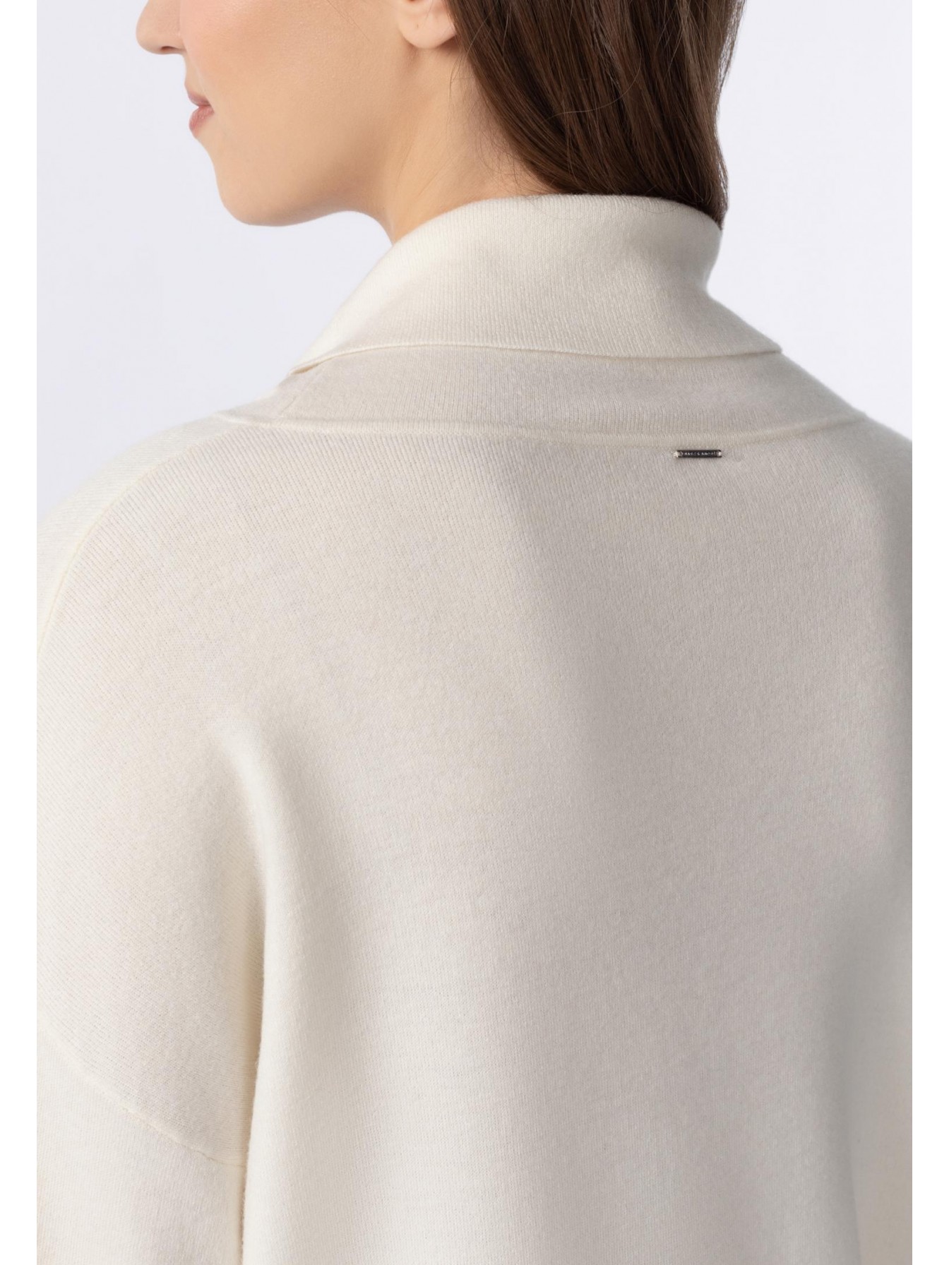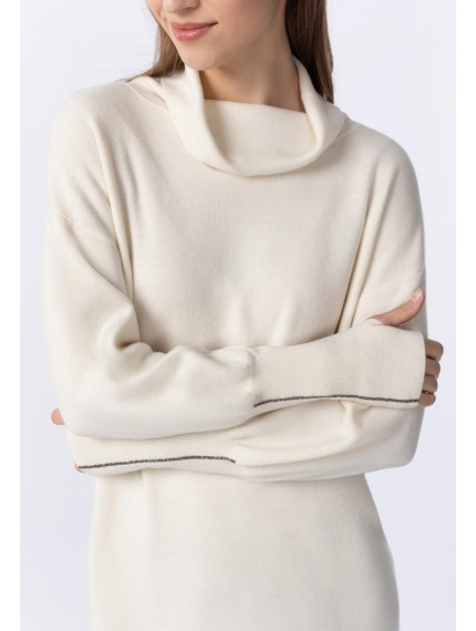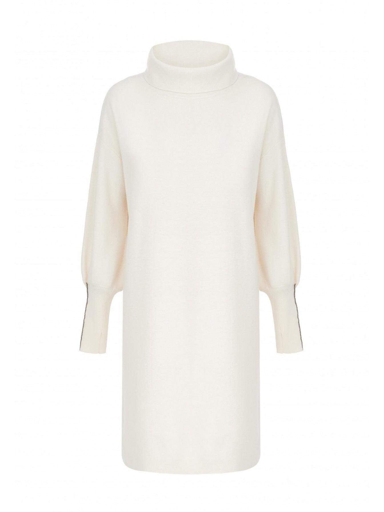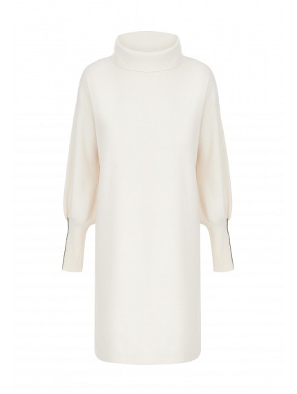 Платье-туника прямого кроя из трикотажа интерлок. Длина чуть выше уровня колен. Воротник-хомут с отворотом. Рукава-фонарик. Высокие манжеты с отверстием под большой палец. Манжета с металлизированной тесьмой (ручная работа). Низ изделия выполнен по технике бесшовного края, без отстрочки.