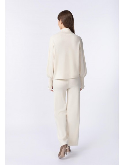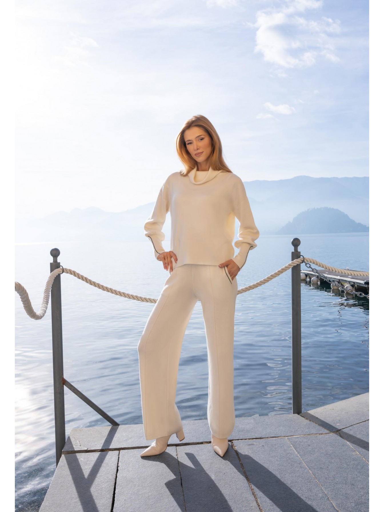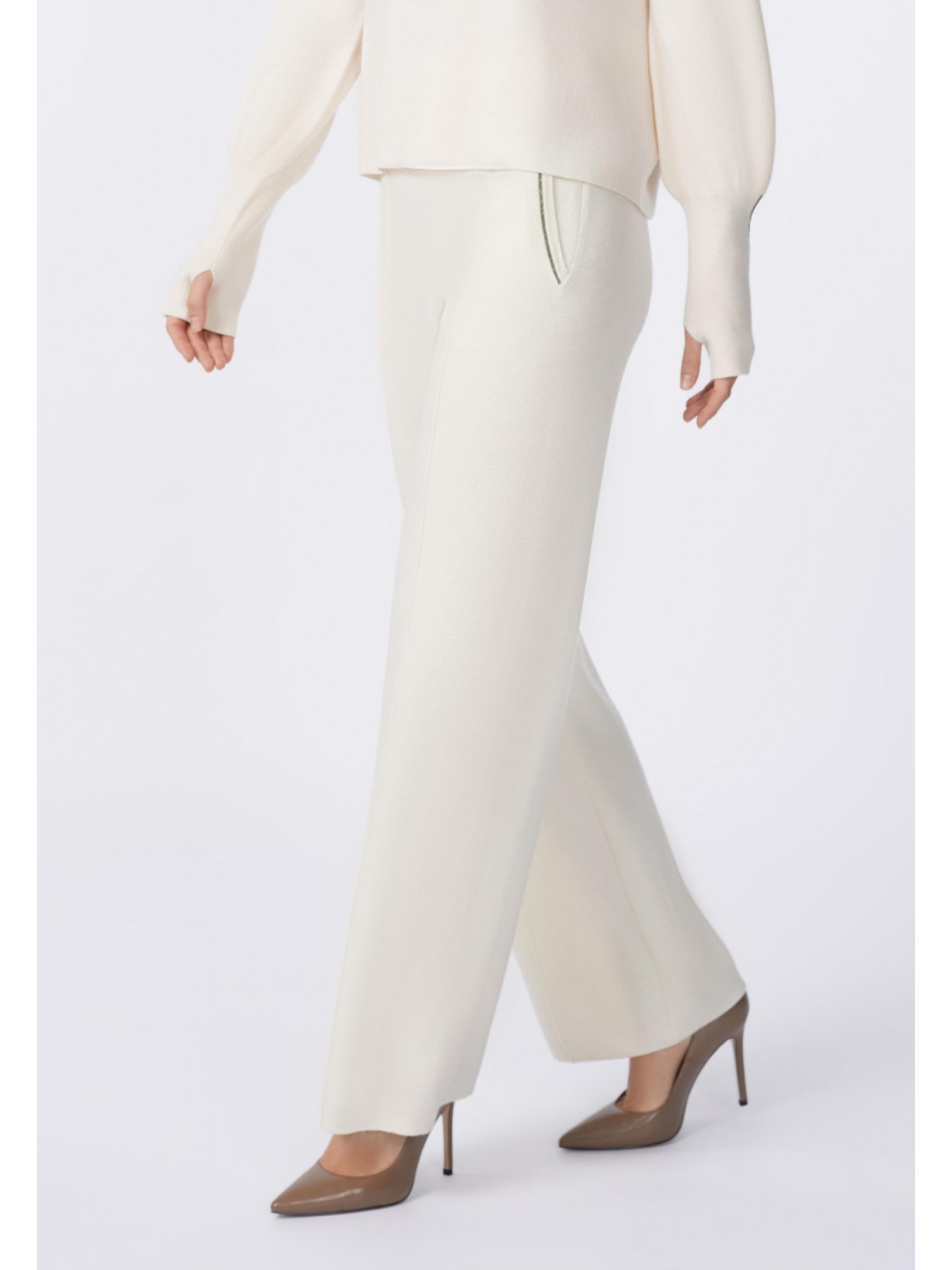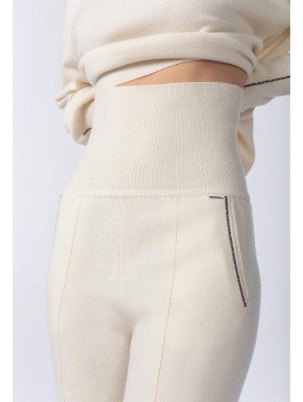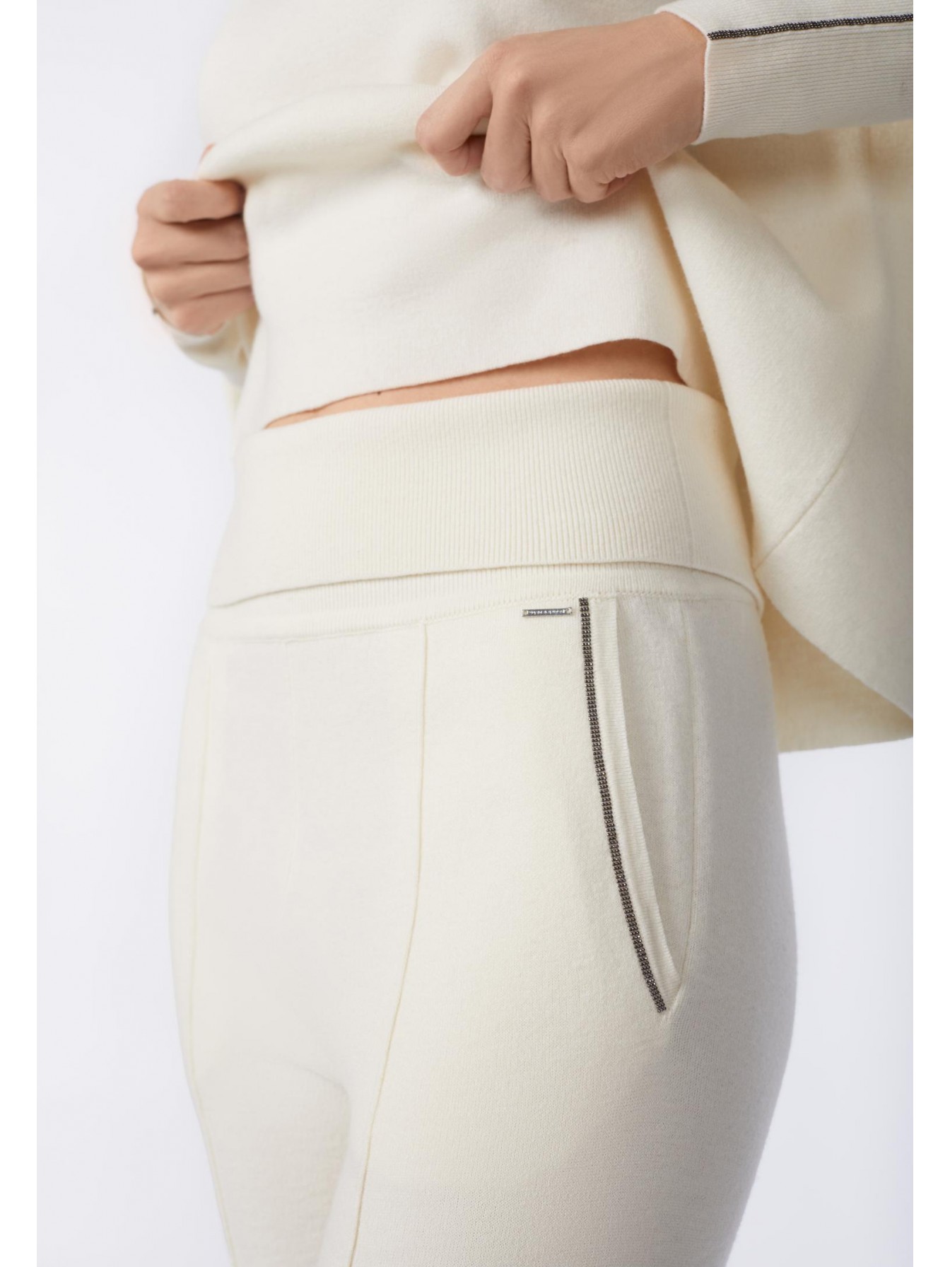 Брюки свободного кроя с из трикотажа интерлок. Высота посадки регулируется за счет широкого пояса-отворота из вязаной резинки. Стрелки на передних деталях отстрочены. Боковые карманы украшены металлизированной тесьмой (ручная работа). Низ брюк выполнен по технике бесшовного края, без отстрочки.